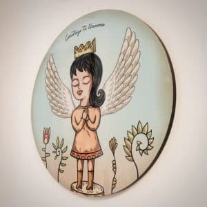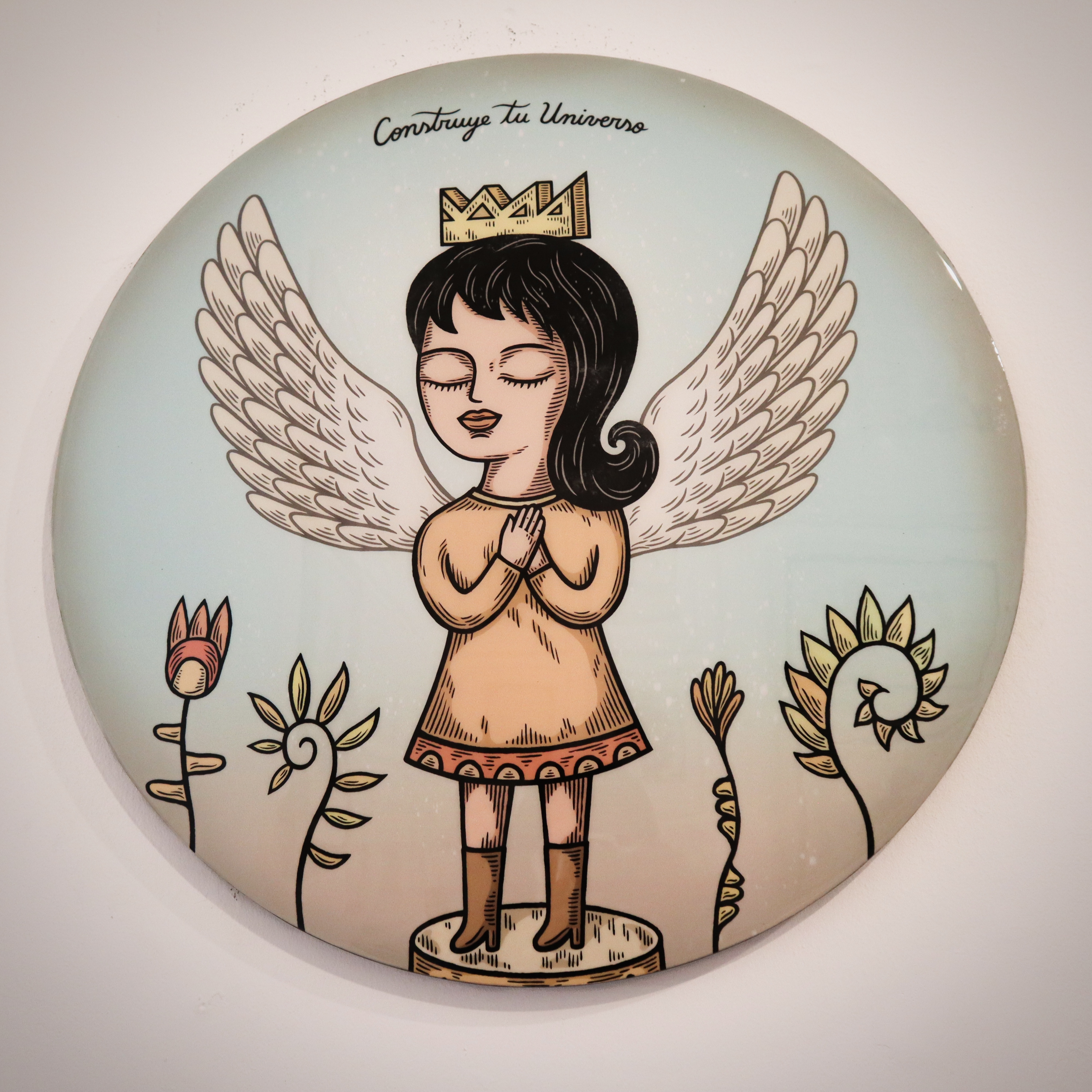 Grabado “Alas” en su versión circular, trabajado sobre madera, bañado en resina. Formato elegante que aporta a los espacios el brillo natural y reflejo a manera de espejo.