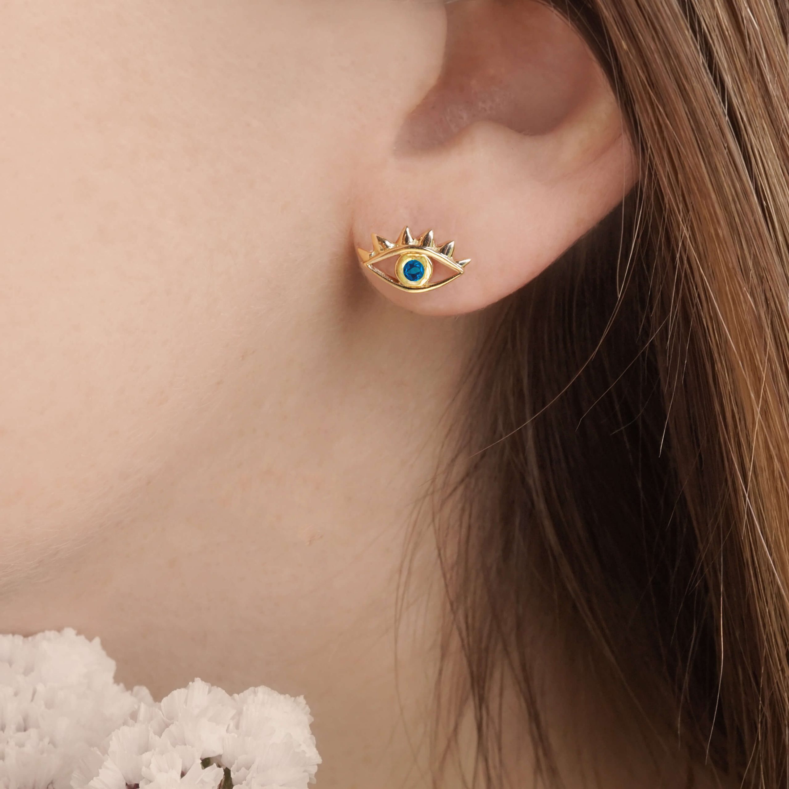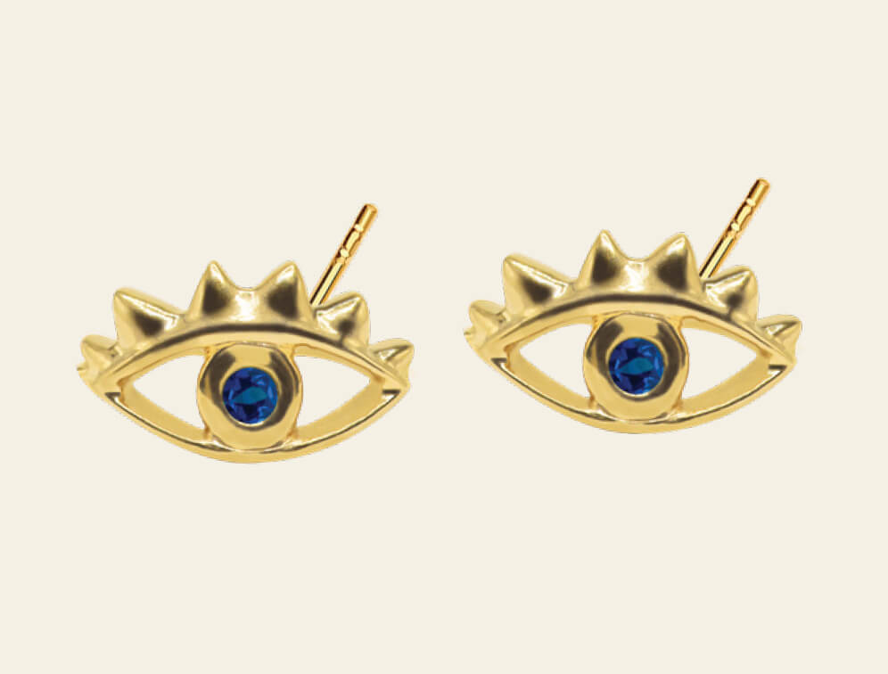 Par de aretes de en forma de ojo. Elaborados en Oro Amarillo con un Zafiro. Medidas: 1.3 cm x 0.8 cm