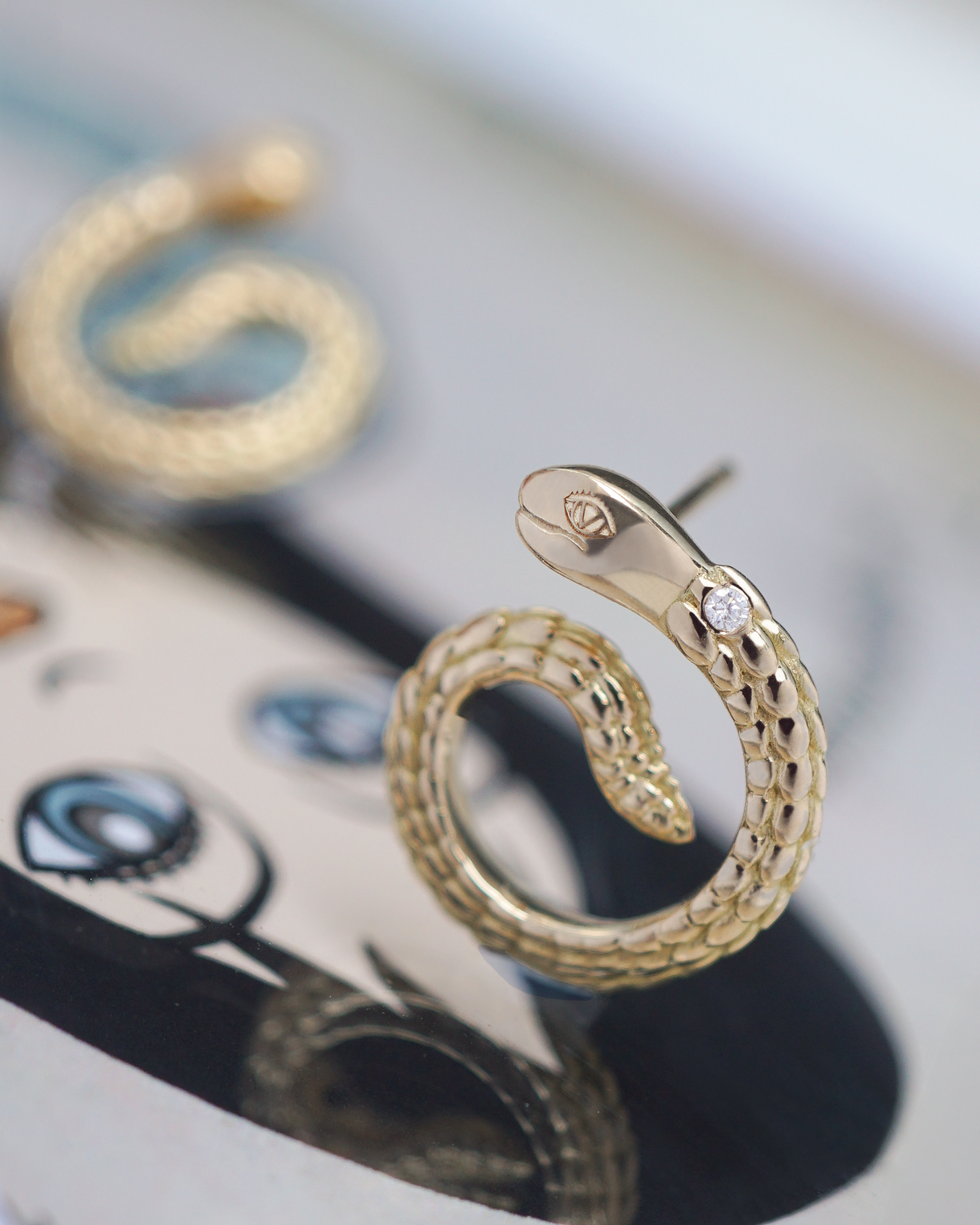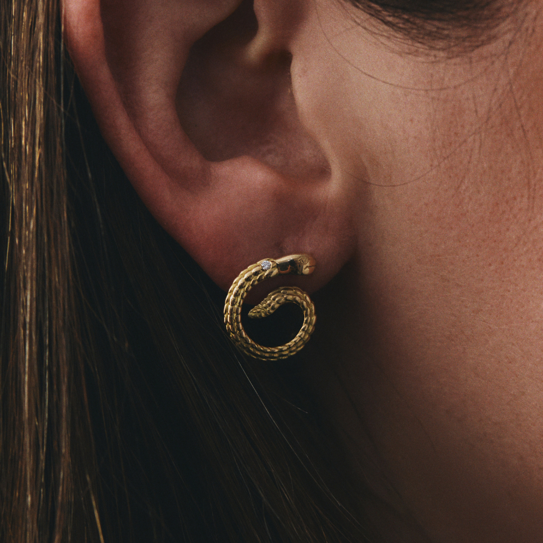 Aretes en oro amarillo de 18K serpiente con escamas y brillante, Inspirado en la ilustración Serpiente de Fito Espinosa.