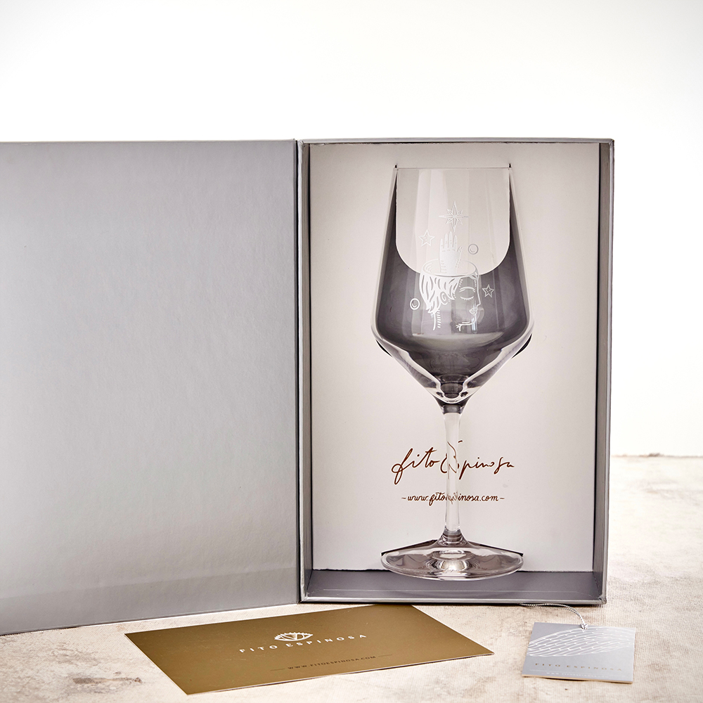 Copa de Cristal para Vino, ilustrada por Fito Espinosa en bajo relieve y fino acabado metálico. Presentación en caja empastada de colección con solapa, cintillo y cierre imantado.
