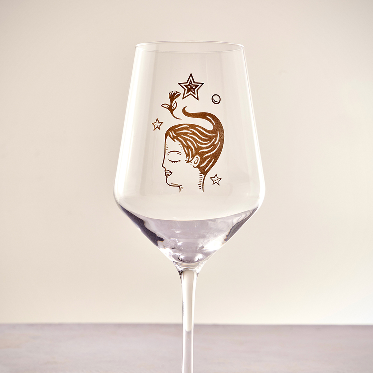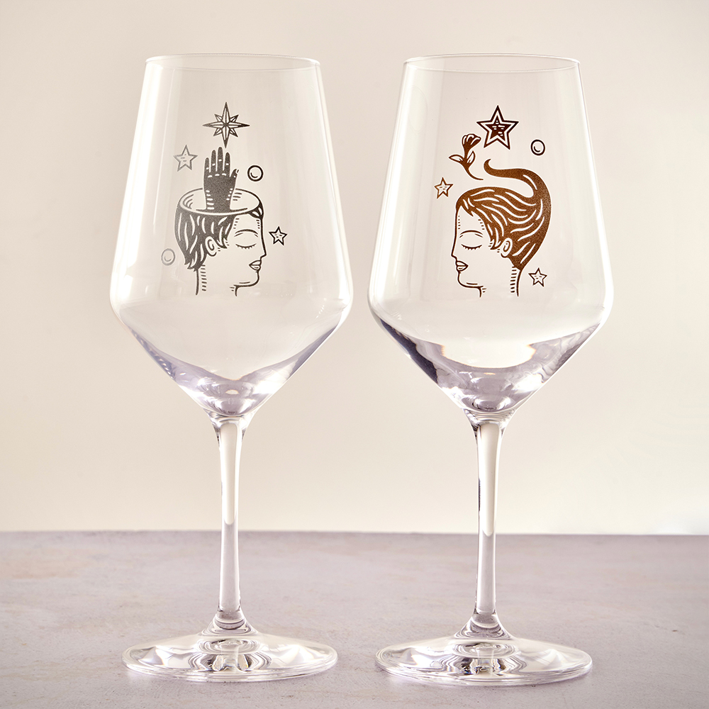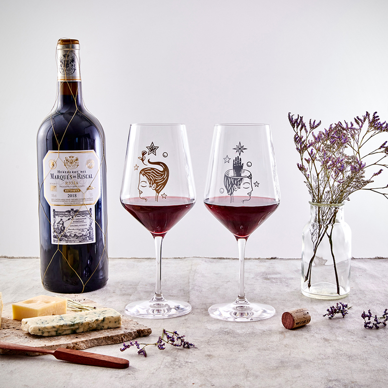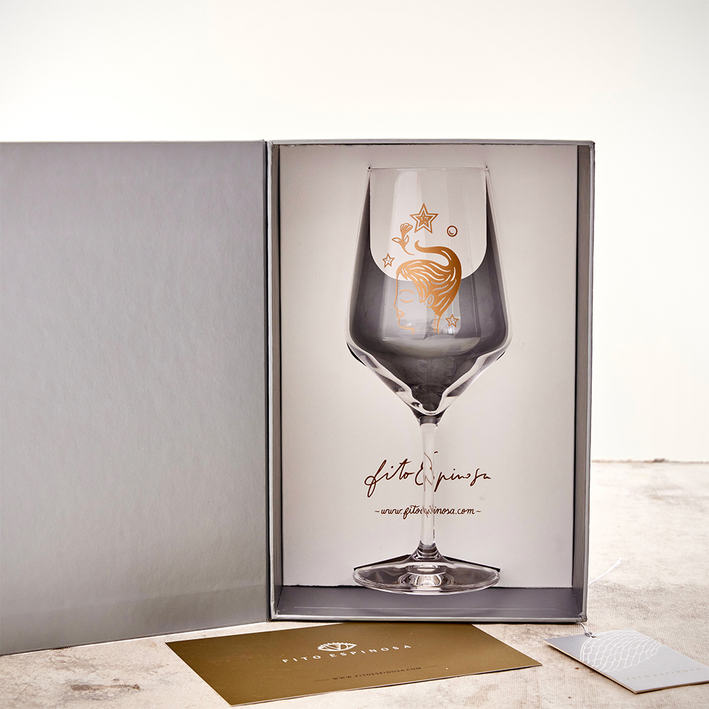 Copa de Cristal para Vino, ilustrada por Fito Espinosa en bajo relieve y fino acabado metálico. Presentación en caja empastada de colección con solapa, cintillo y cierre imantado.