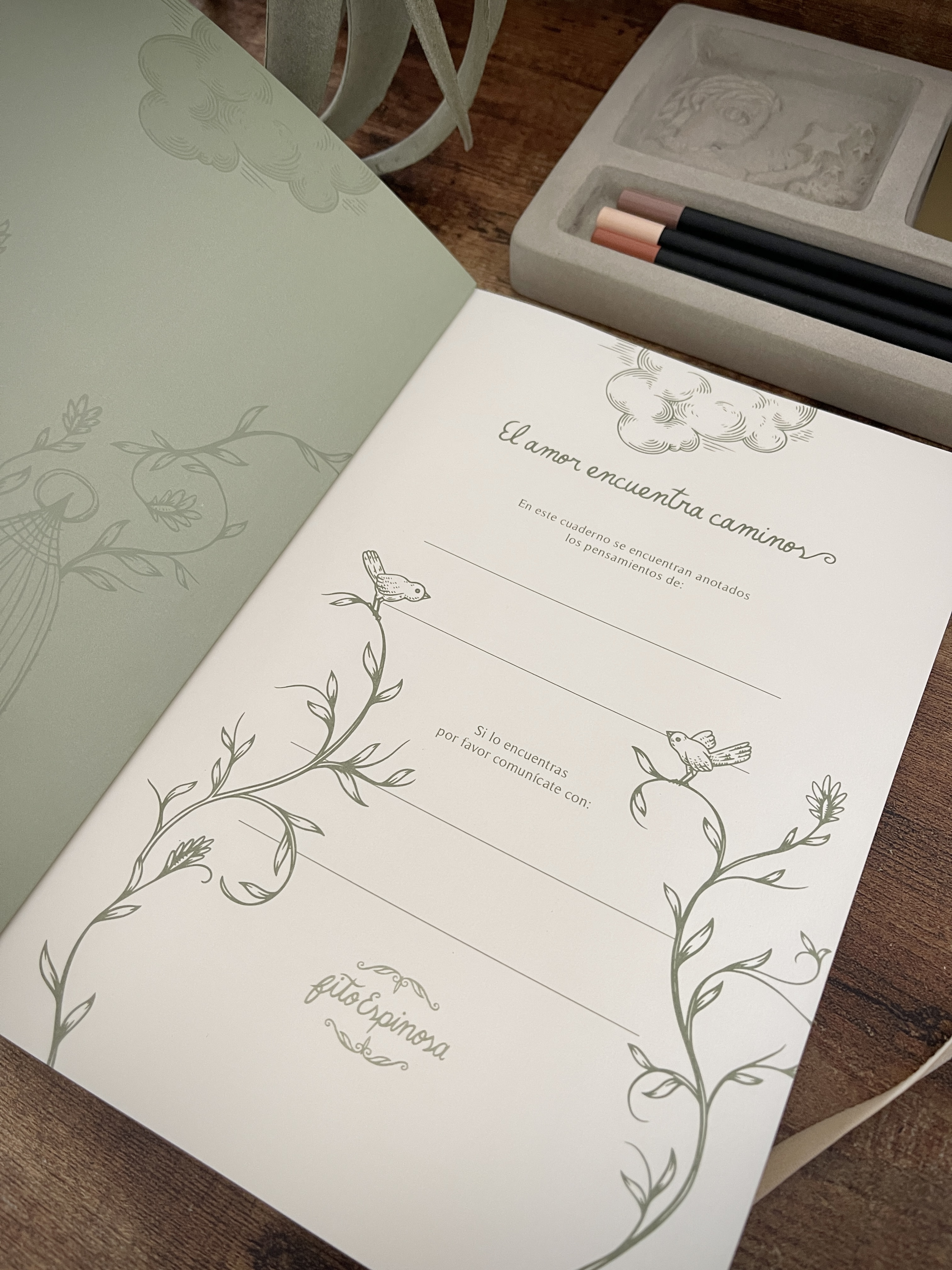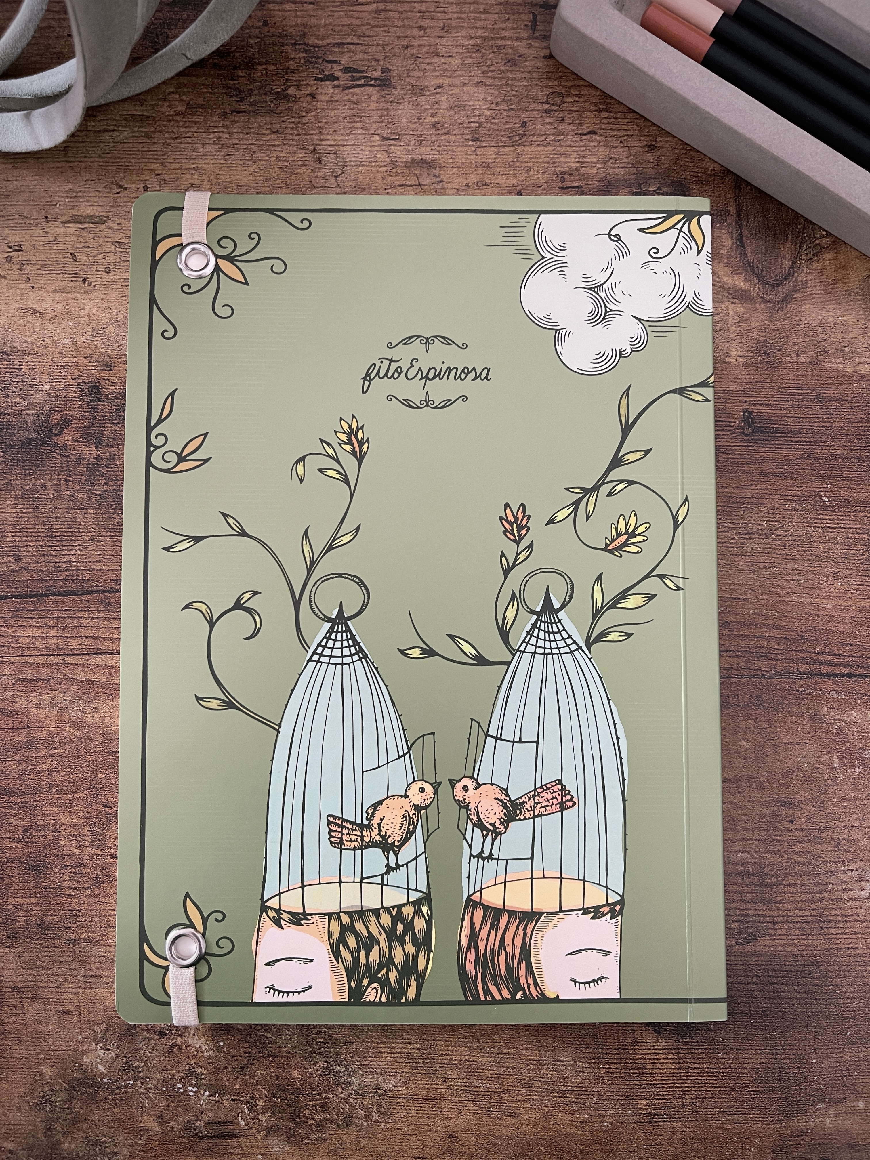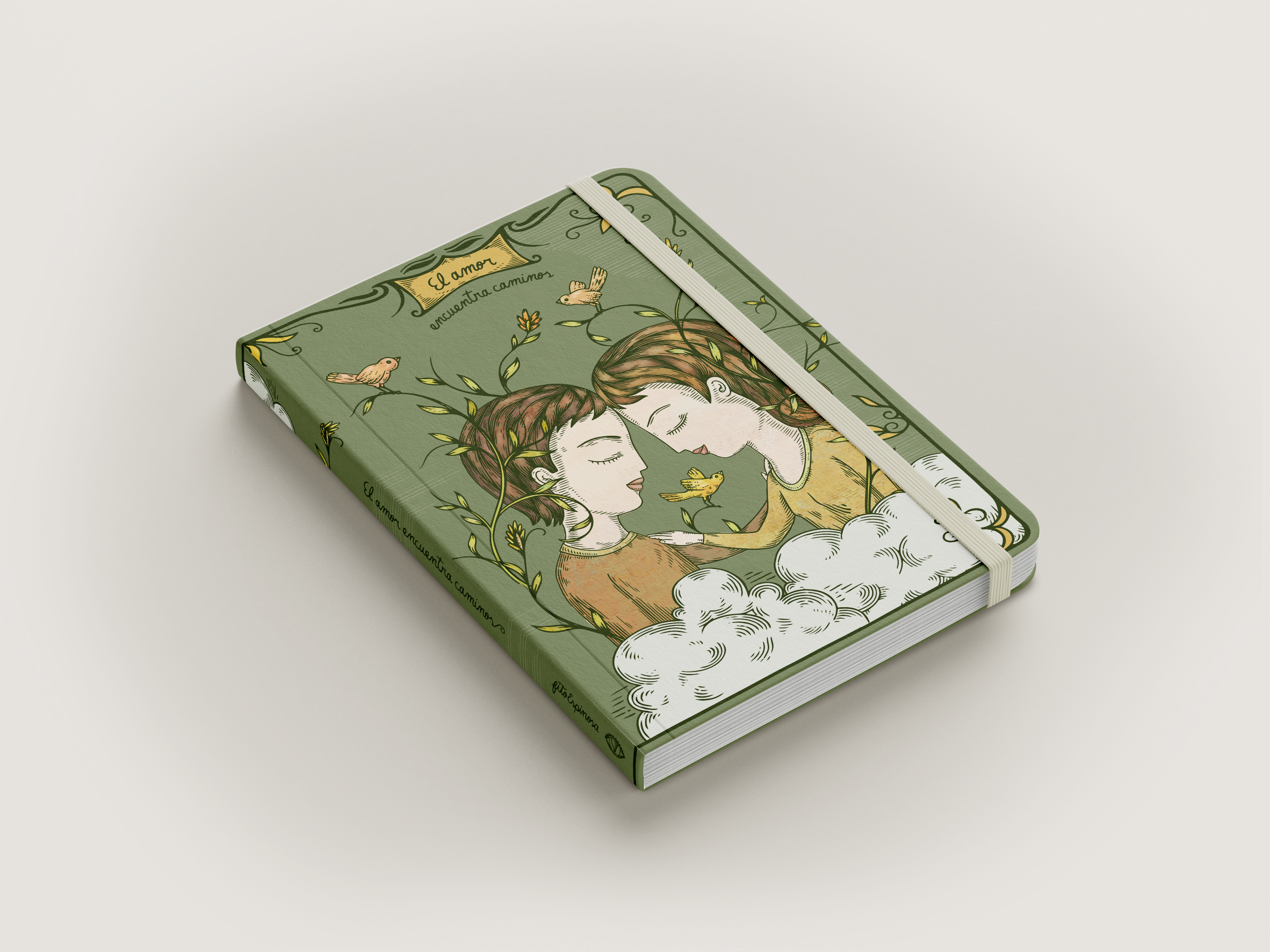 Cuaderno de tapa blanda tamaño A5, elaborado con papel avena fino de 85 grms, elástico marcador y 180 páginas interiores en blanco ideales para escribir o dibujar. Las dos primeras páginas incluyen un encabezado de Fito Espinosa, así como una ilustración a full color en exteriores. Basado en la ilustración “Algo” y “A pesar” de Fito Espinosa.