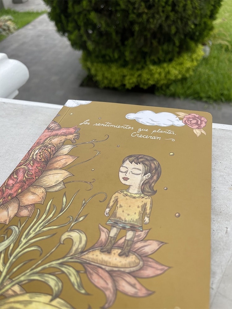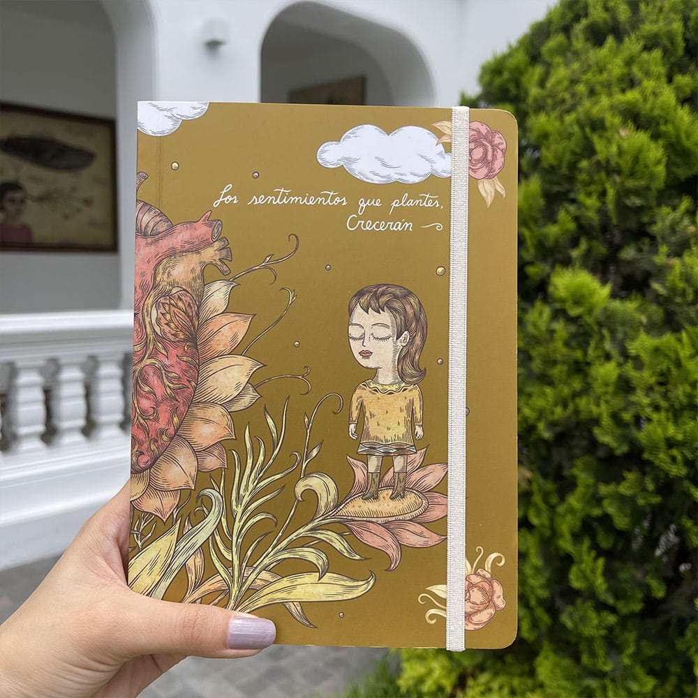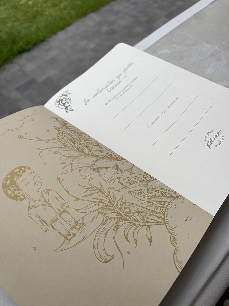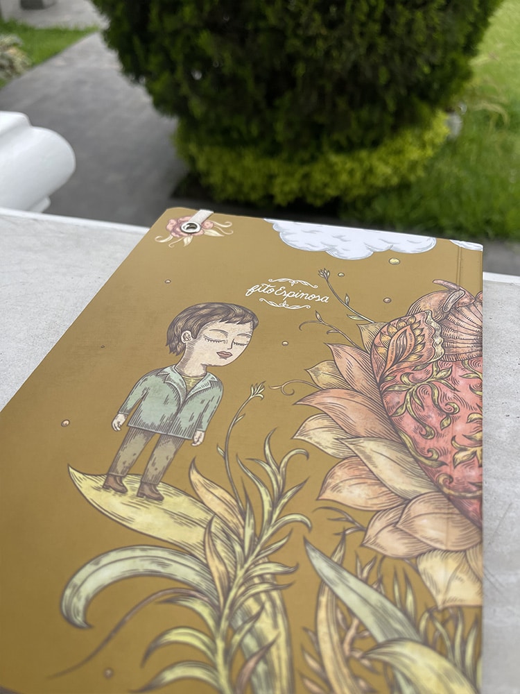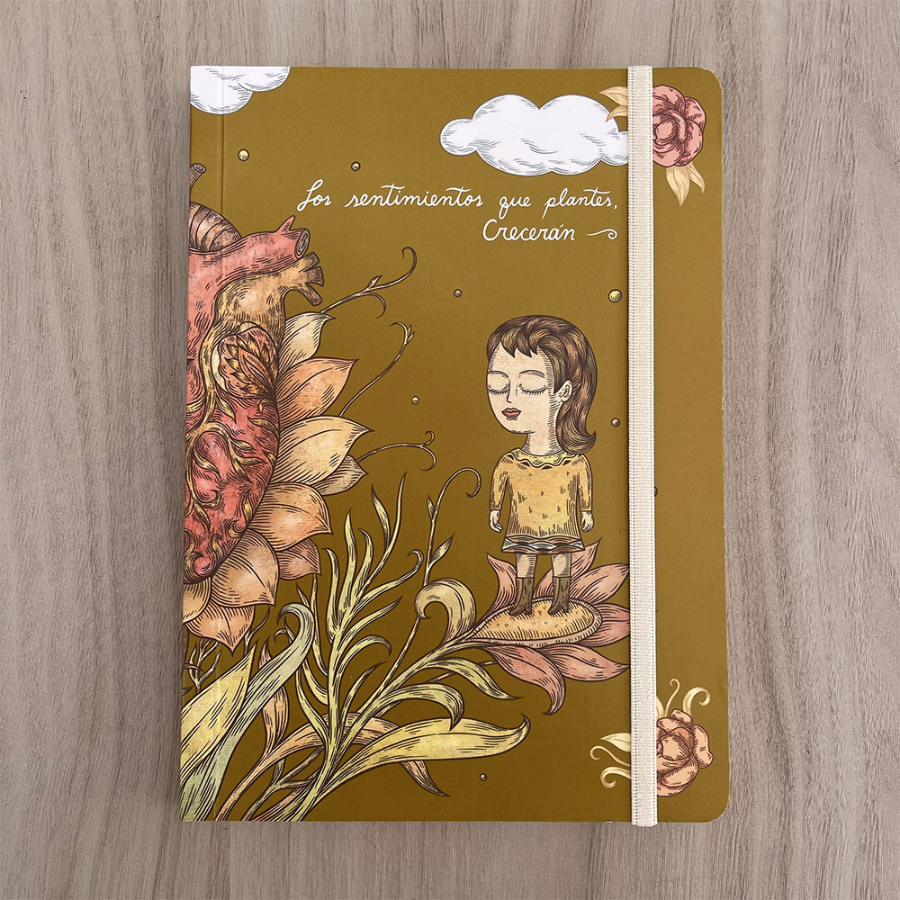 Cuaderno de tapa blanda tamaño A5, elaborado con papel avena fino de 85 grms, elástico marcador y 180 páginas interiores en blanco ideales para escribir o dibujar. Basado en la ilustración “Plantar” de Fito Espinosa, diseñada a full color en la portada y contraportada.