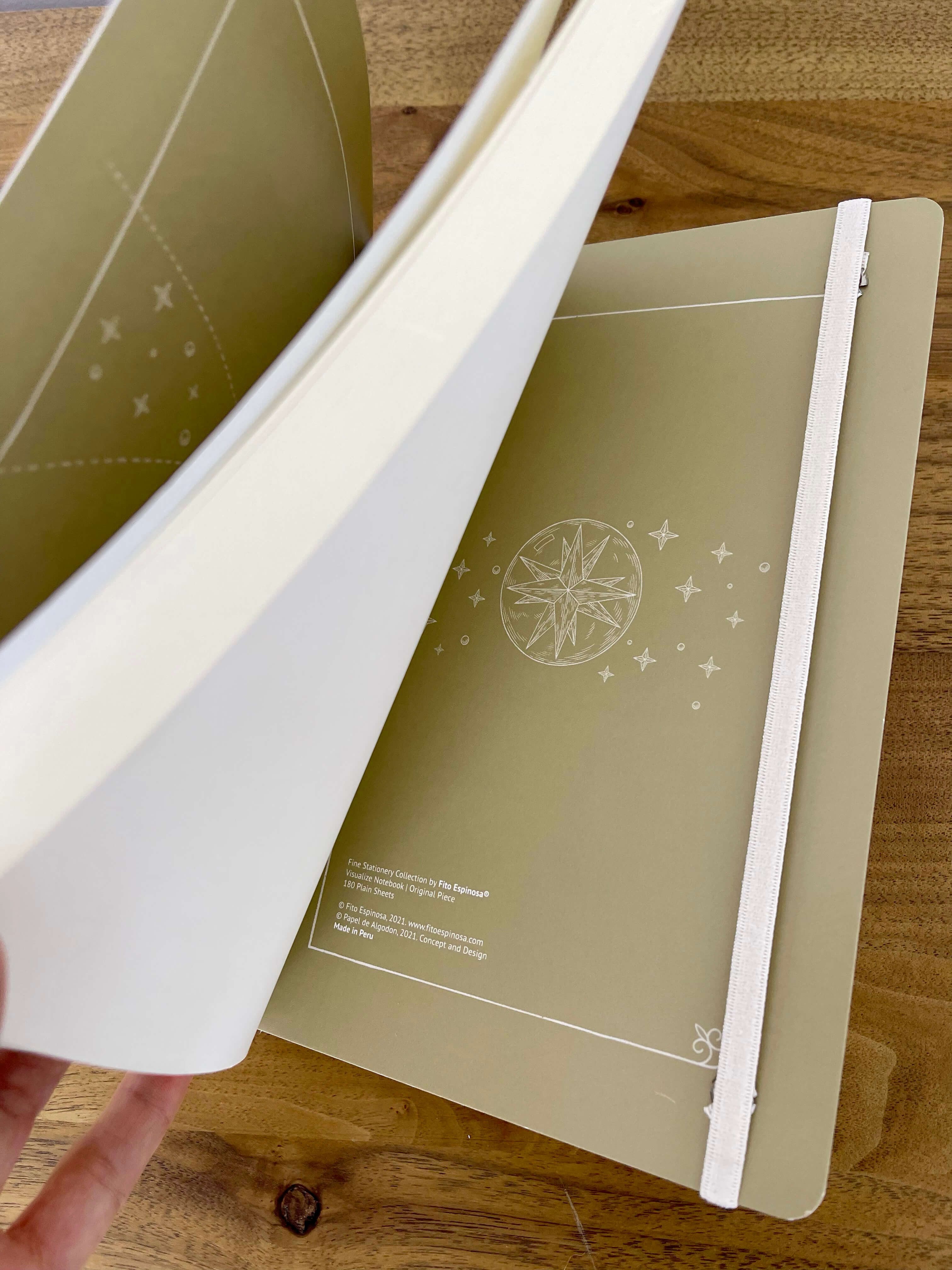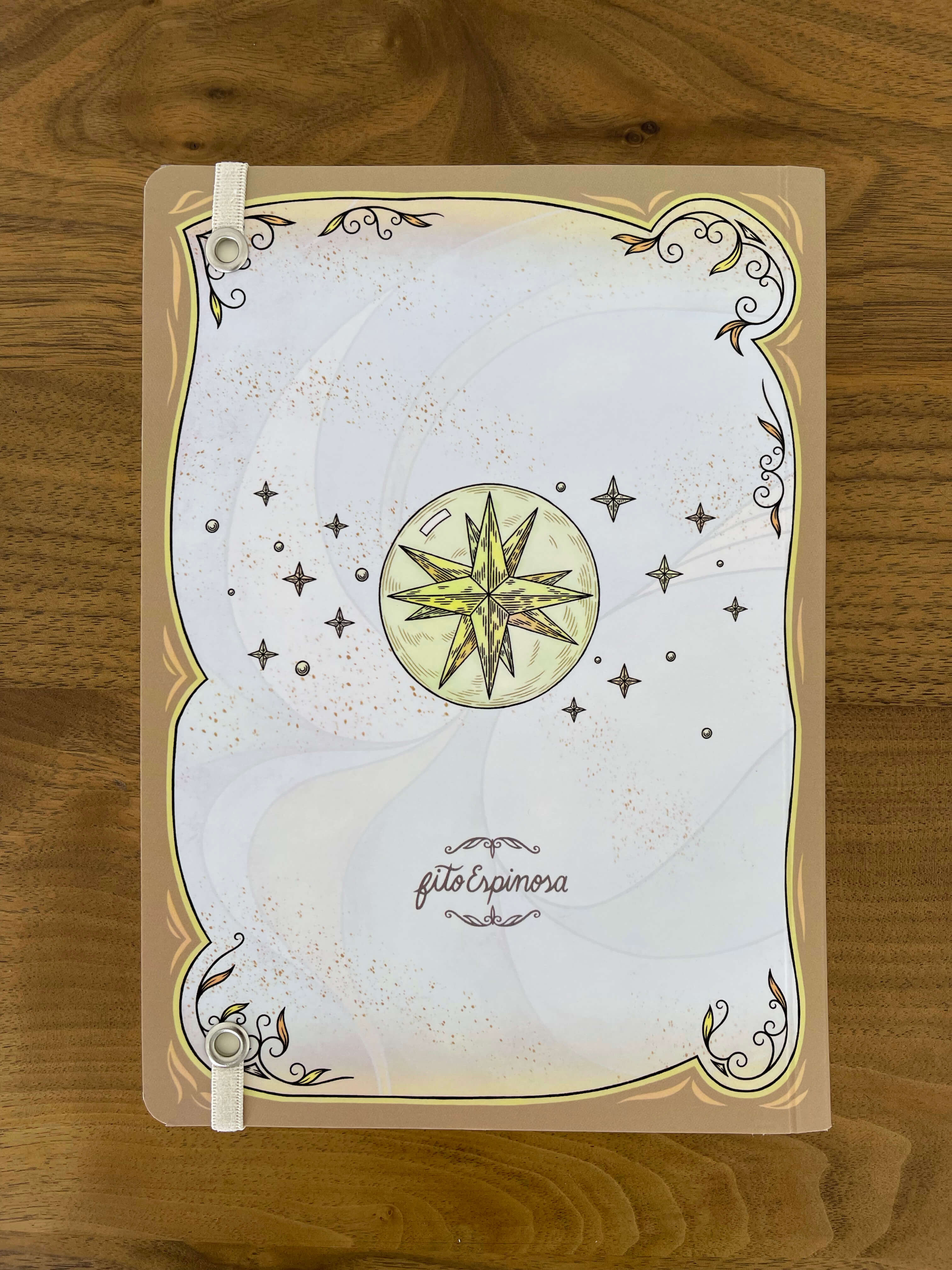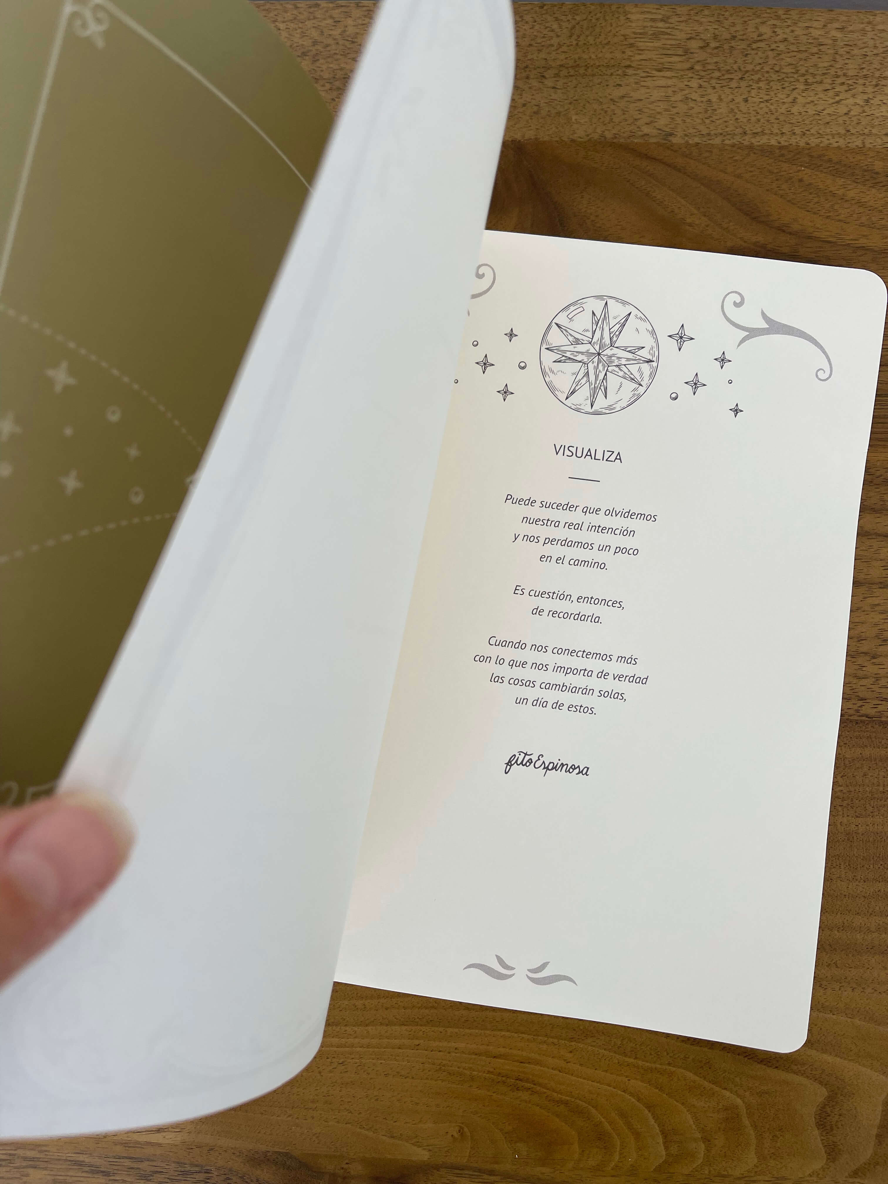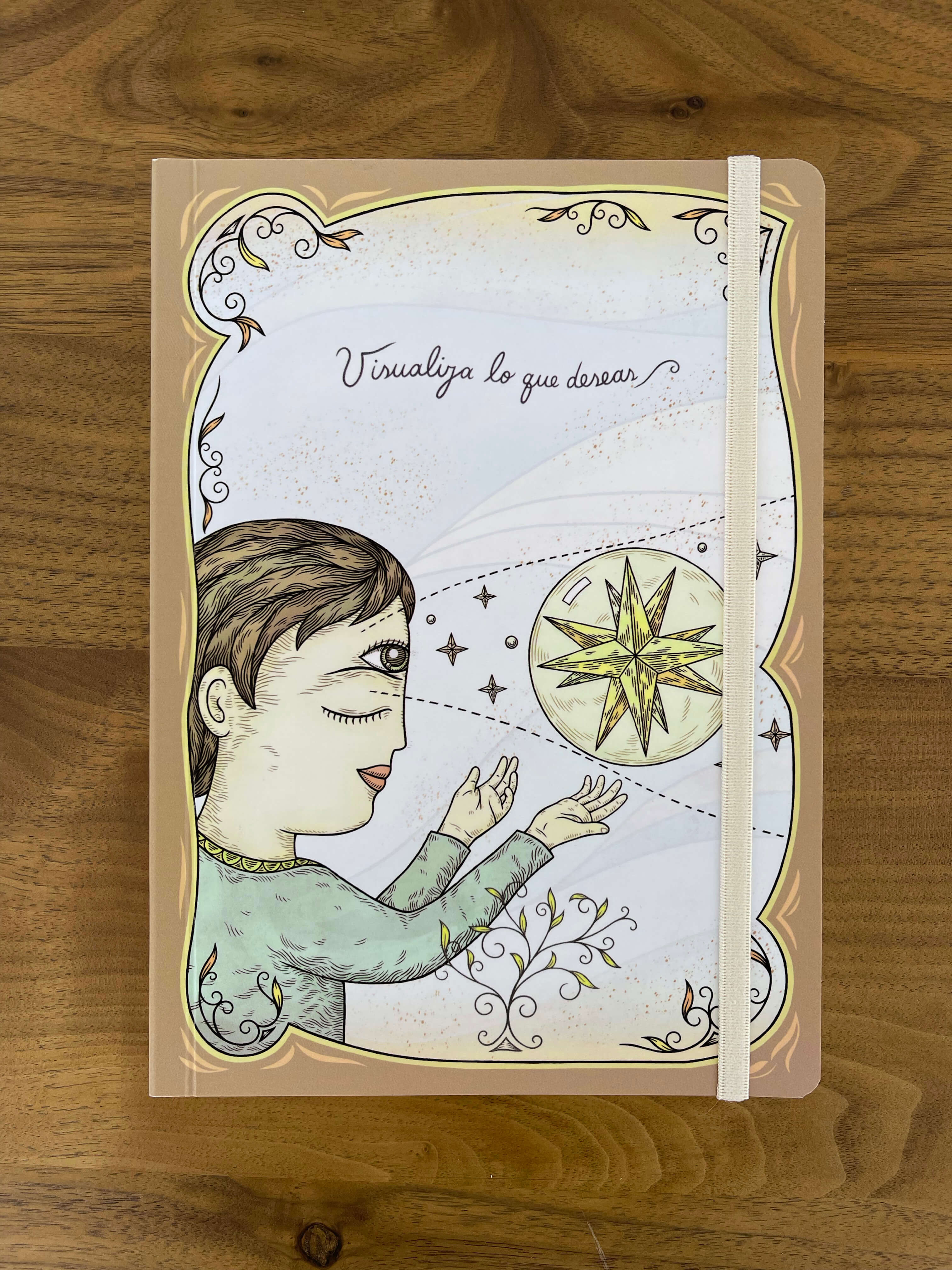 Cuaderno de tapa blanda tamaño A5, elaborado con papel avena fino de 85 grms, elástico marcador y 180 páginas interiores en blanco ideales para escribir o dibujar. Las dos primeras páginas incluyen un encabezado y texto de Fito Espinosa, así como una ilustración a full color en exteriores. Basado en la ilustración “Visualiza” de Fito Espinosa.