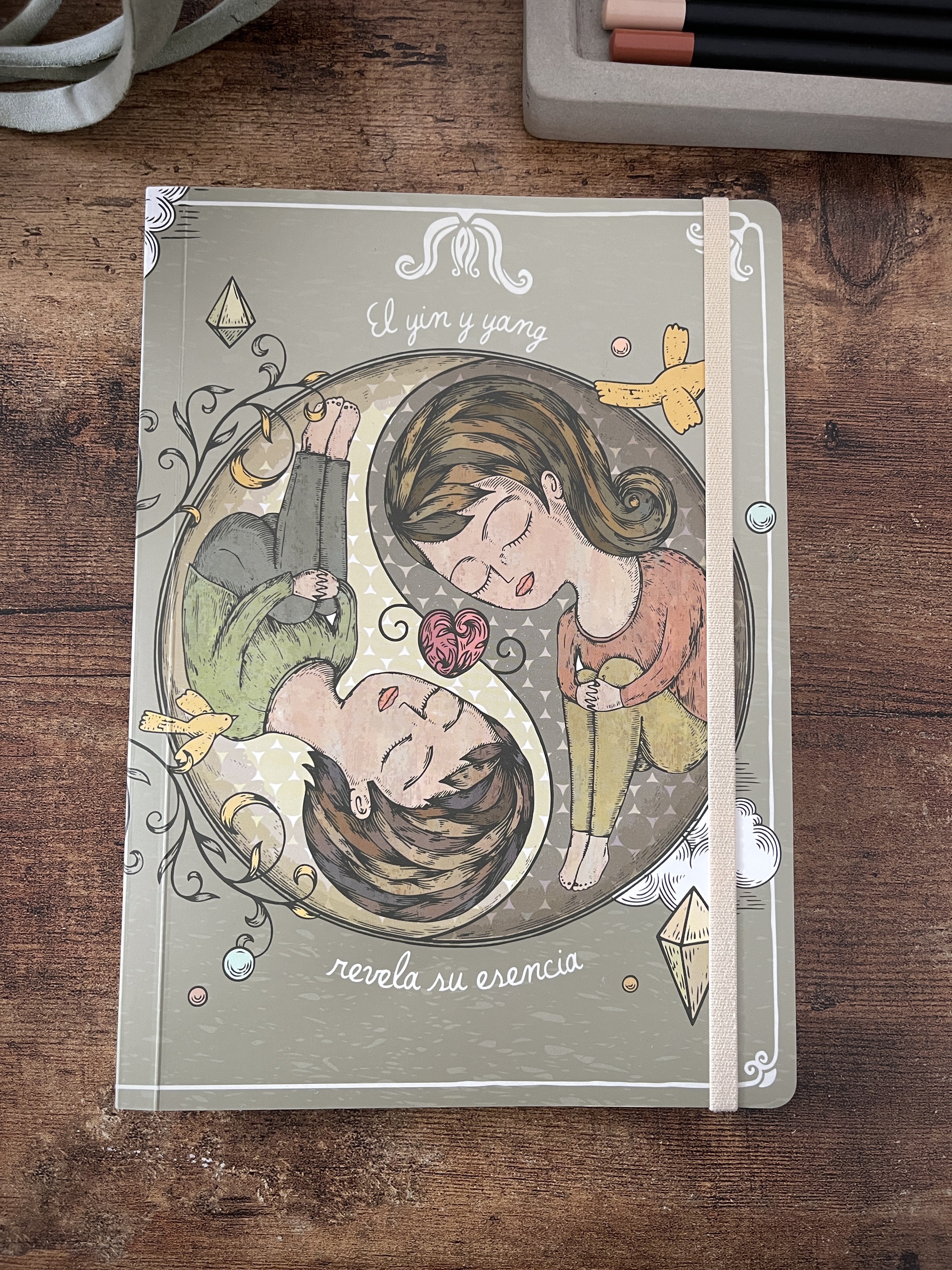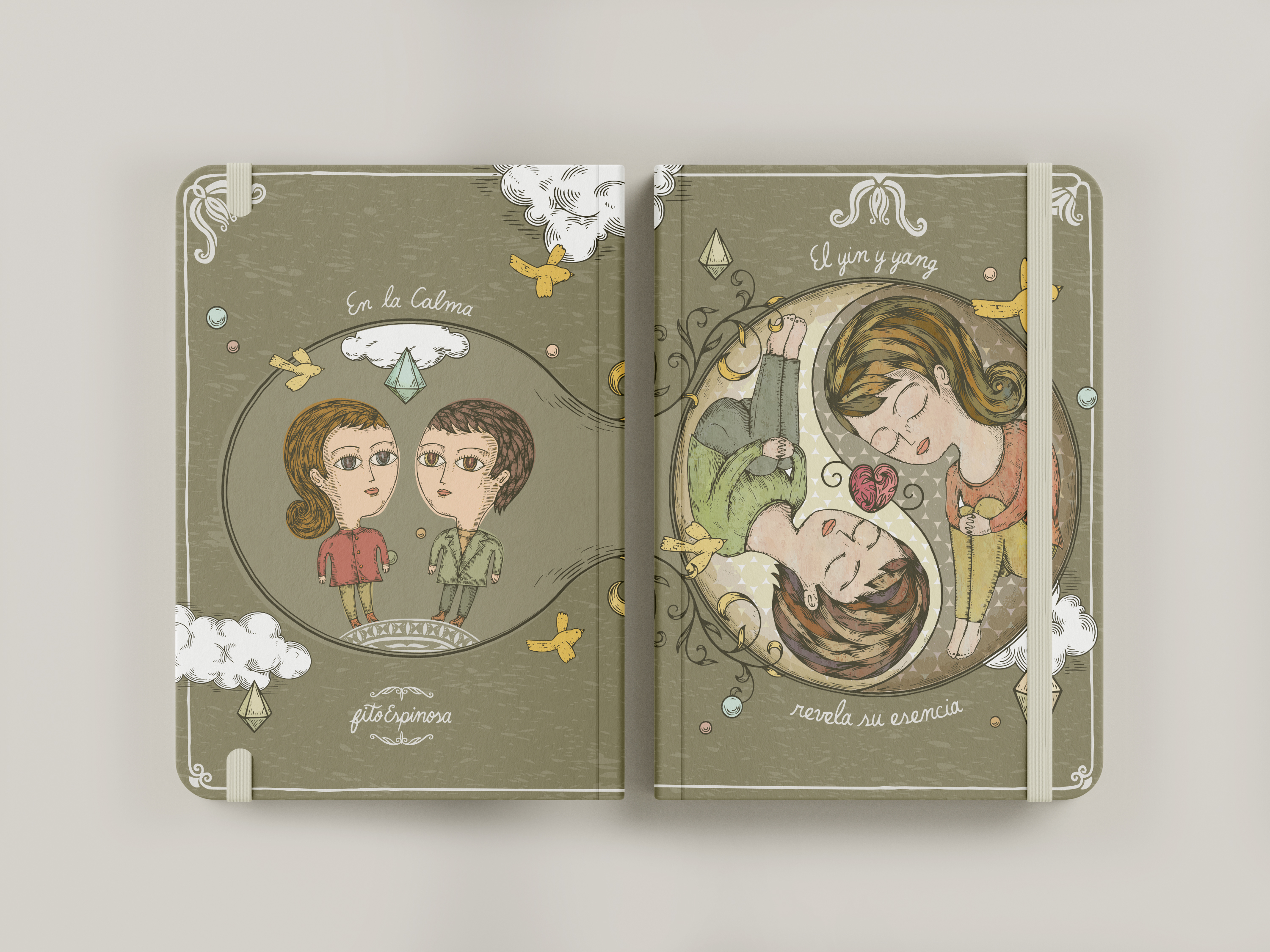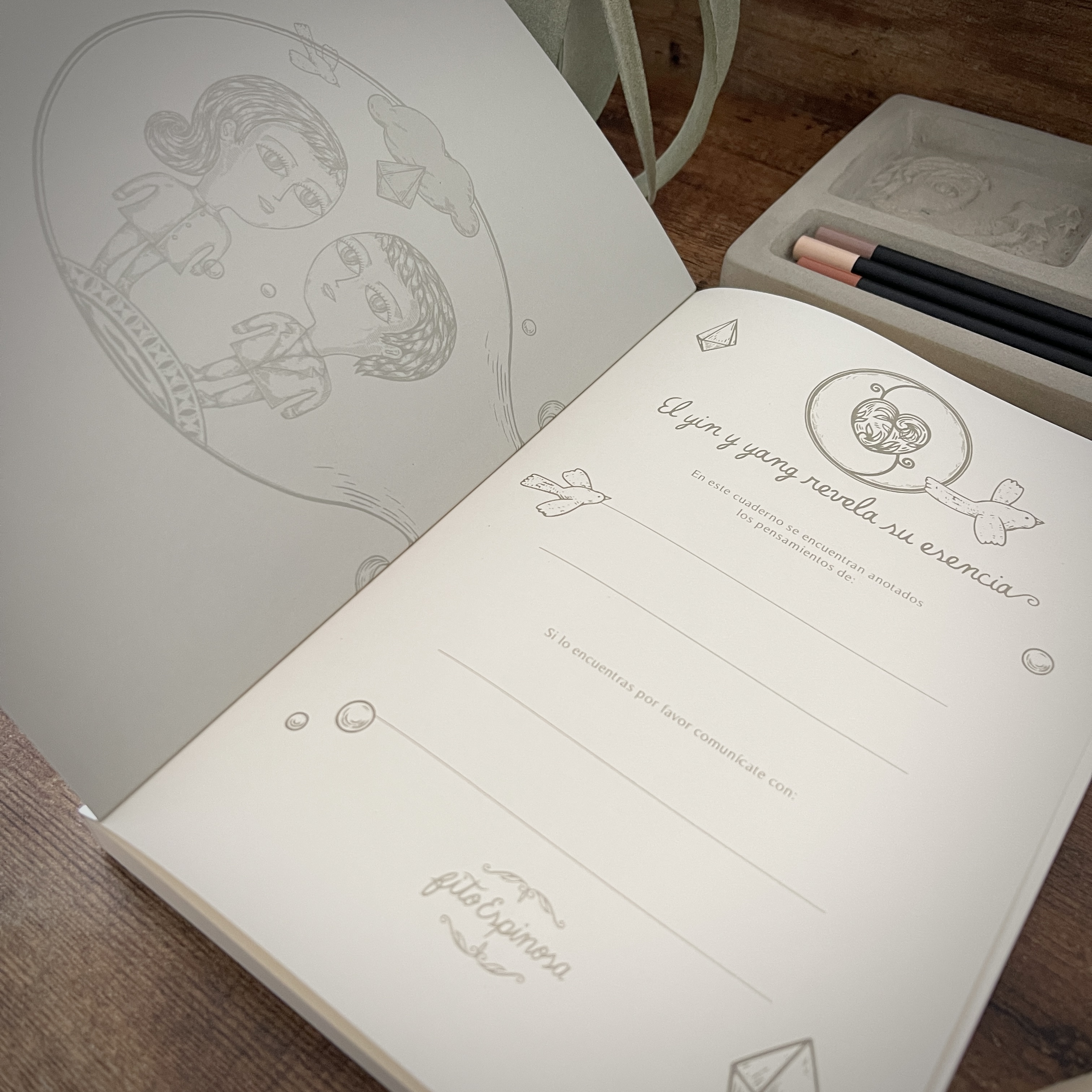 Cuaderno de tapa blanda tamaño A5, elaborado con papel avena fino de 85 grms, elástico marcador y 180 páginas interiores en blanco ideales para escribir o dibujar. Las dos primeras páginas incluyen un encabezado de Fito Espinosa, así como una ilustración a full color en exteriores. Basado en la ilustración “Yin Yang” de Fito Espinosa.