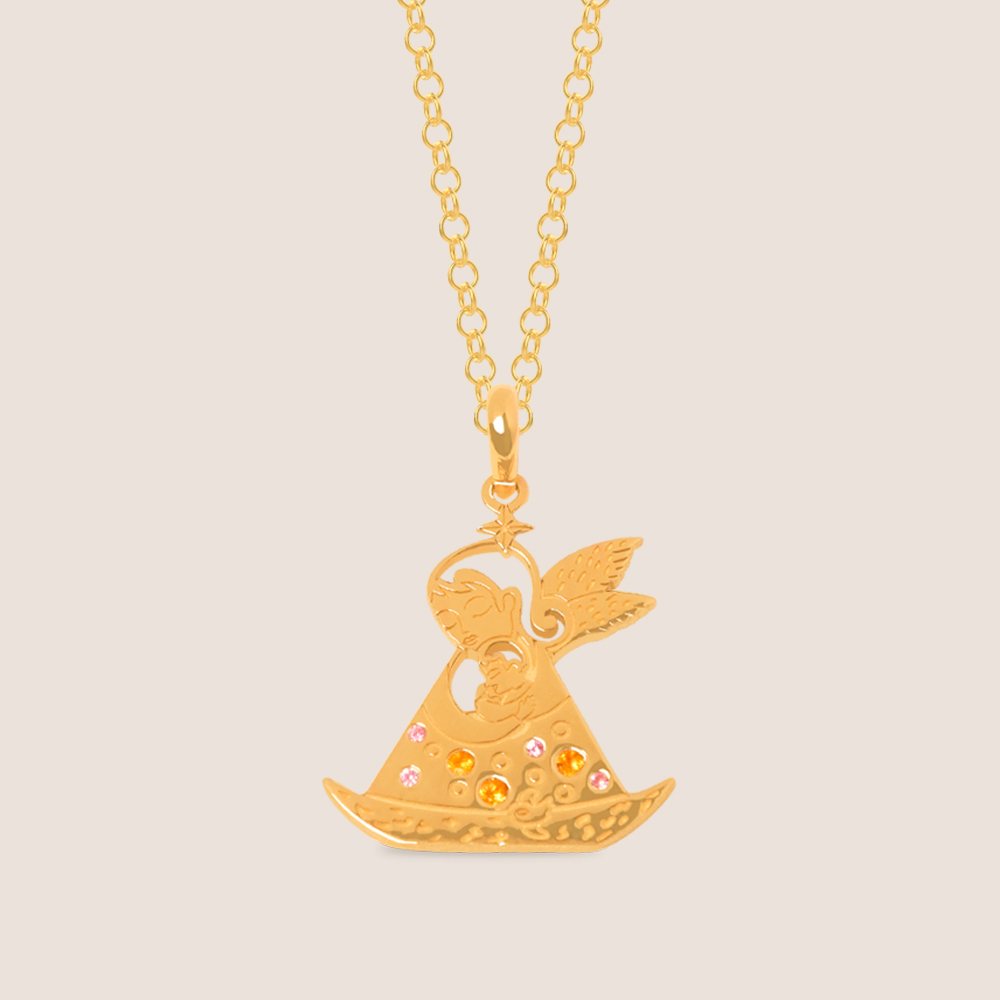 Dije en oro amarillo de 18K con piedras preciosas (Zafiros y Citrinos). Inspirado en la ilustración Proteger de Fito Espinosa