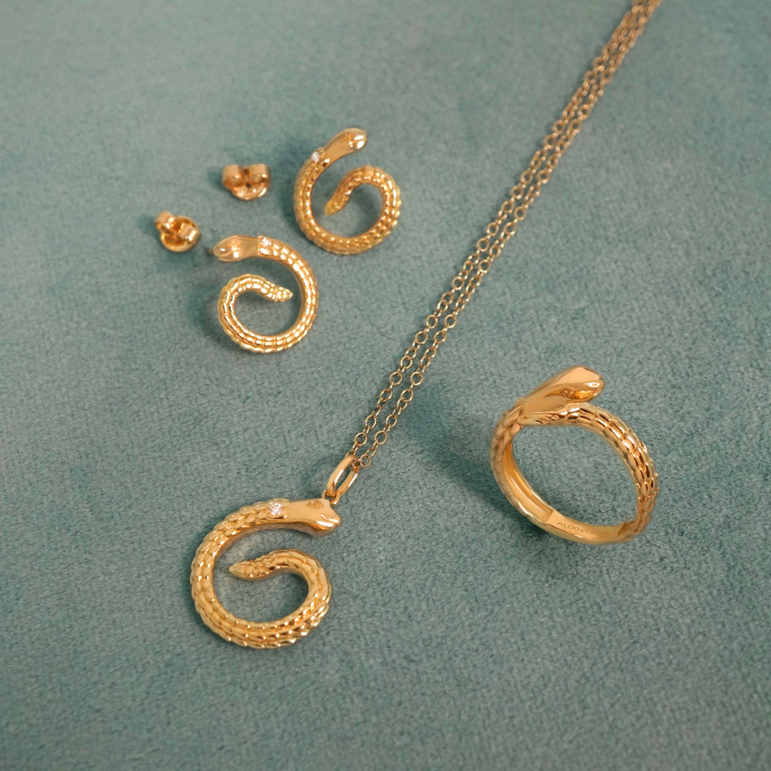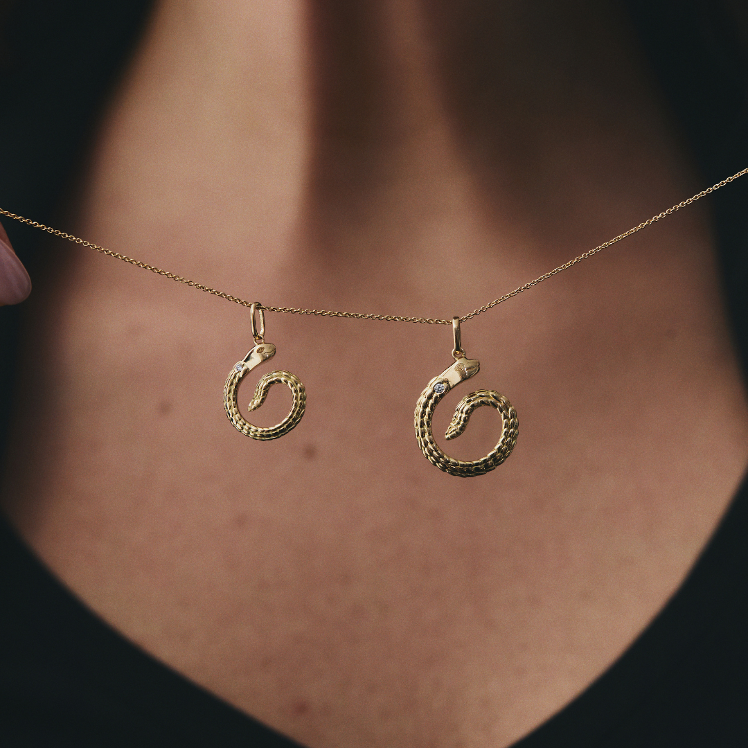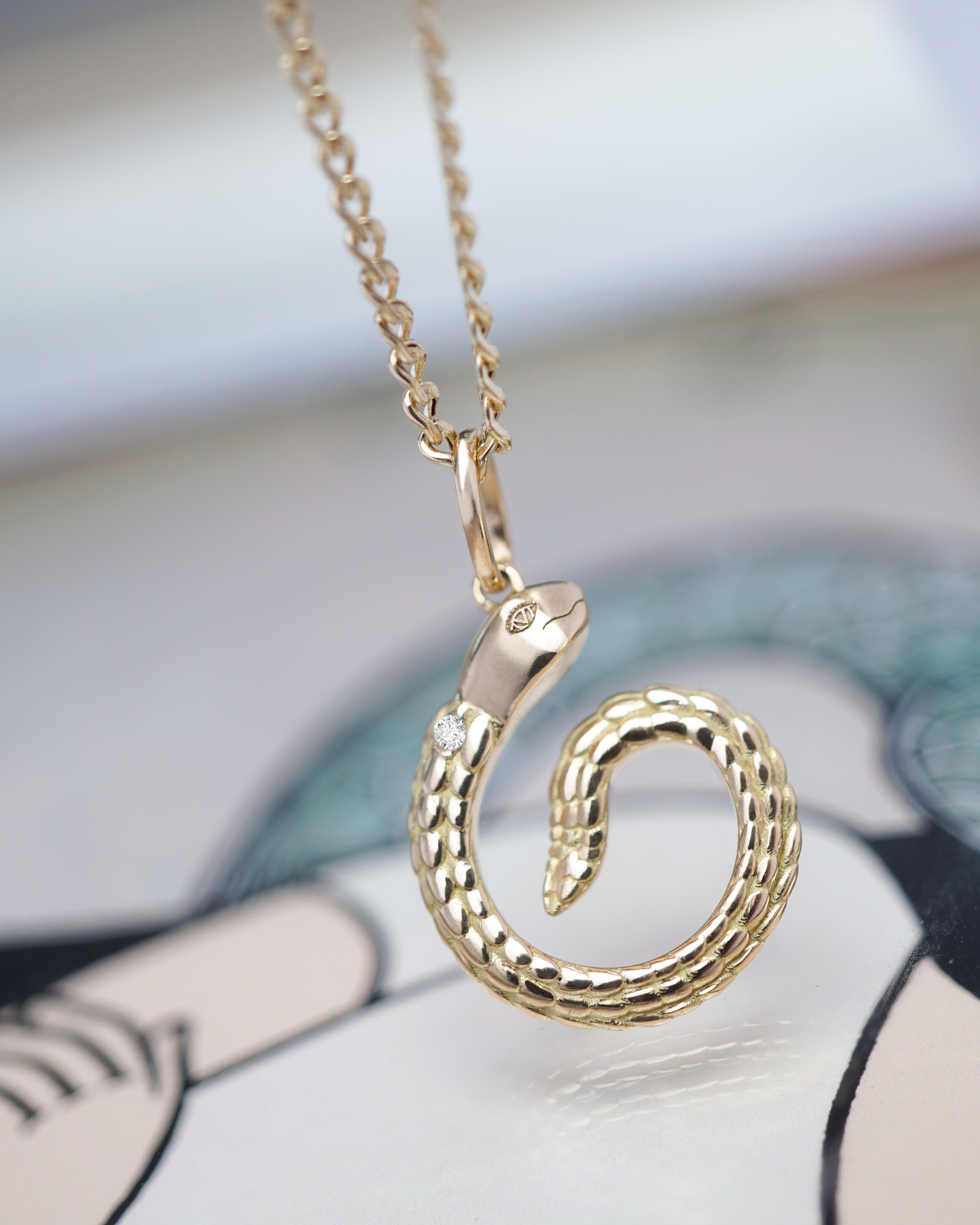 Dije en oro amarillo de 18K serpiente con escamas y brillante, inspirado en la ilustración Serpiente de Fito Espinosa.