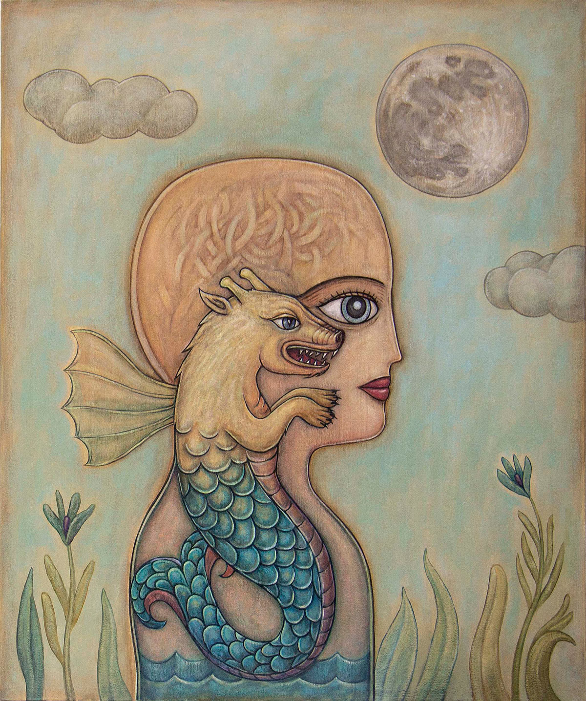 La obra El Influjo forma parte de la serie “Pequeñas Historias de Seres Transparentes”, creada en 2023 por el artista Fito Espinosa y ejecutada con la técnica del acrílico sobre lienzo.