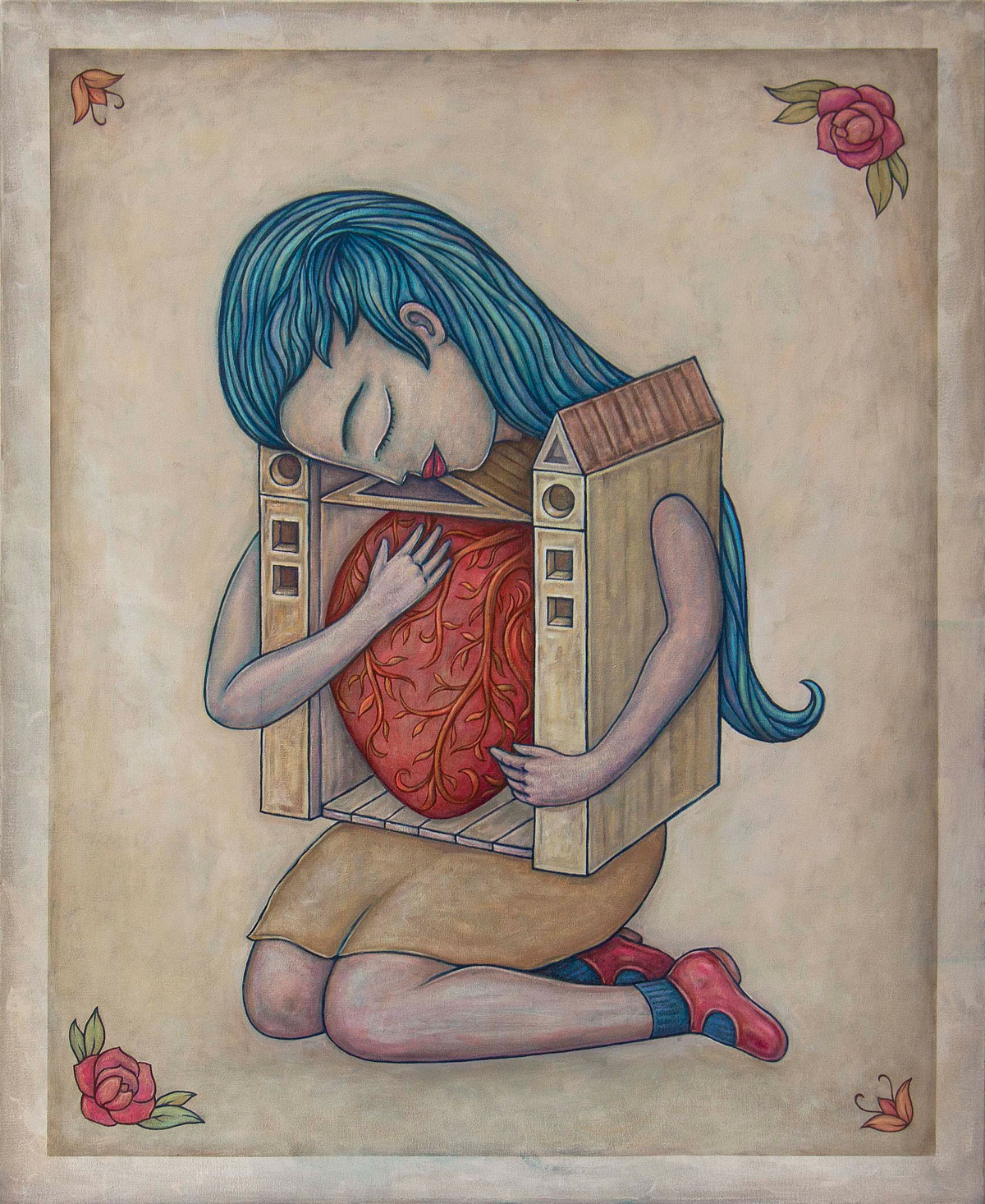 La obra Templo forma parte de la serie “Pequeñas Historias de Seres Transparentes”, creada en 2023 por el artista Fito Espinosa y ejecutada con la técnica del acrílico sobre lienzo.