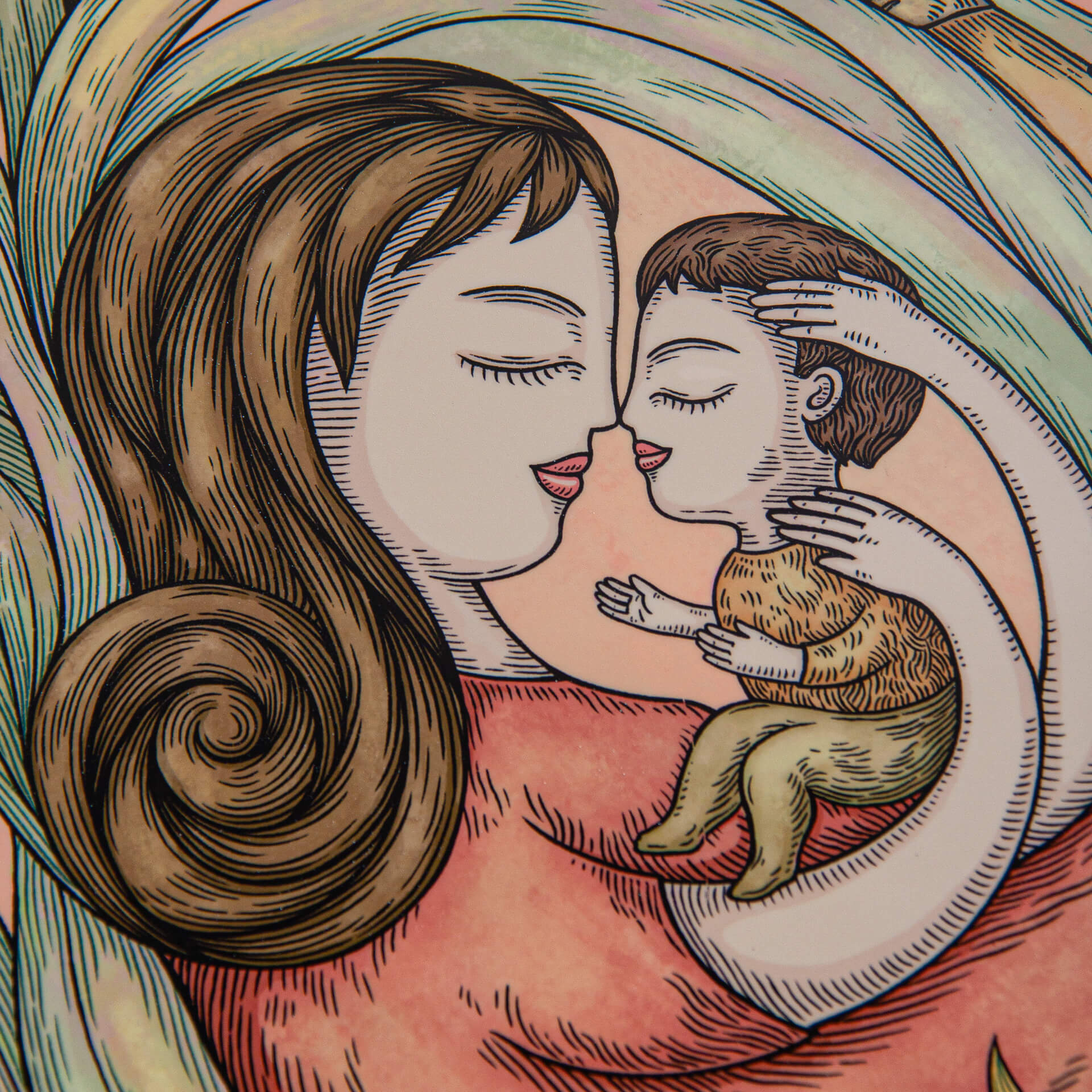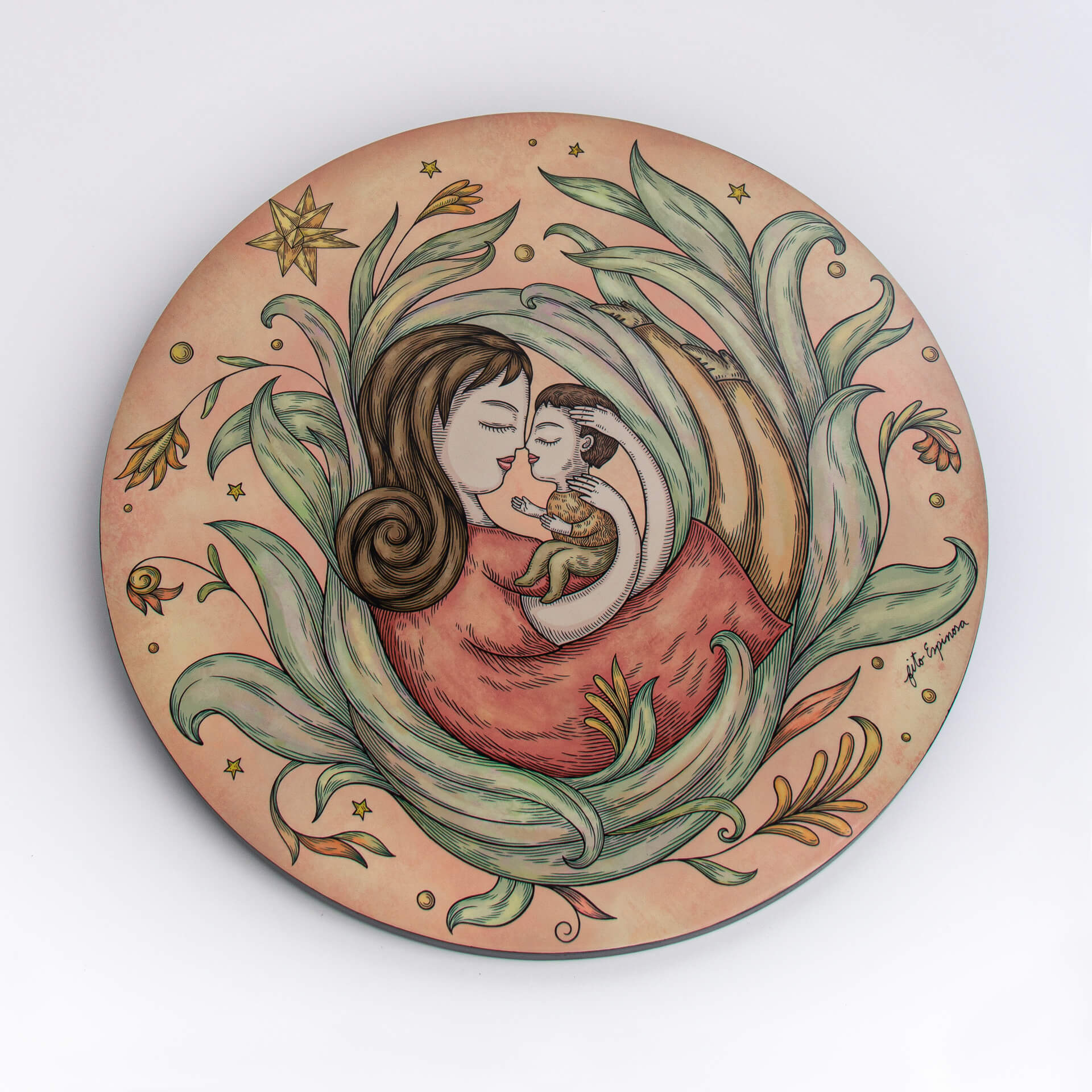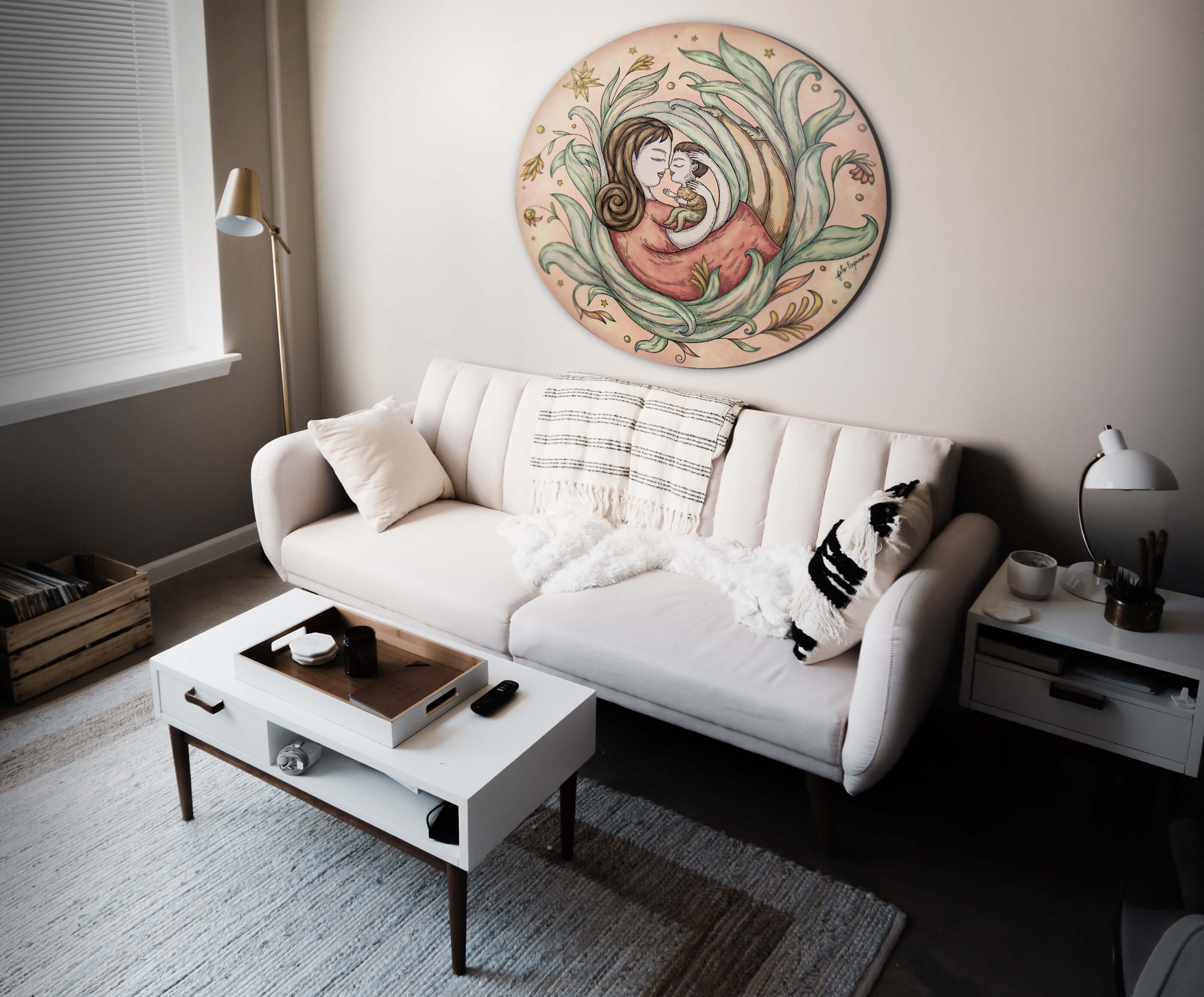 Grabado “El Origen” en su versión circular, trabajado sobre madera, bañado en resina. Formato elegante que aporta a los espacios el brillo natural y reflejo a manera de espejo.