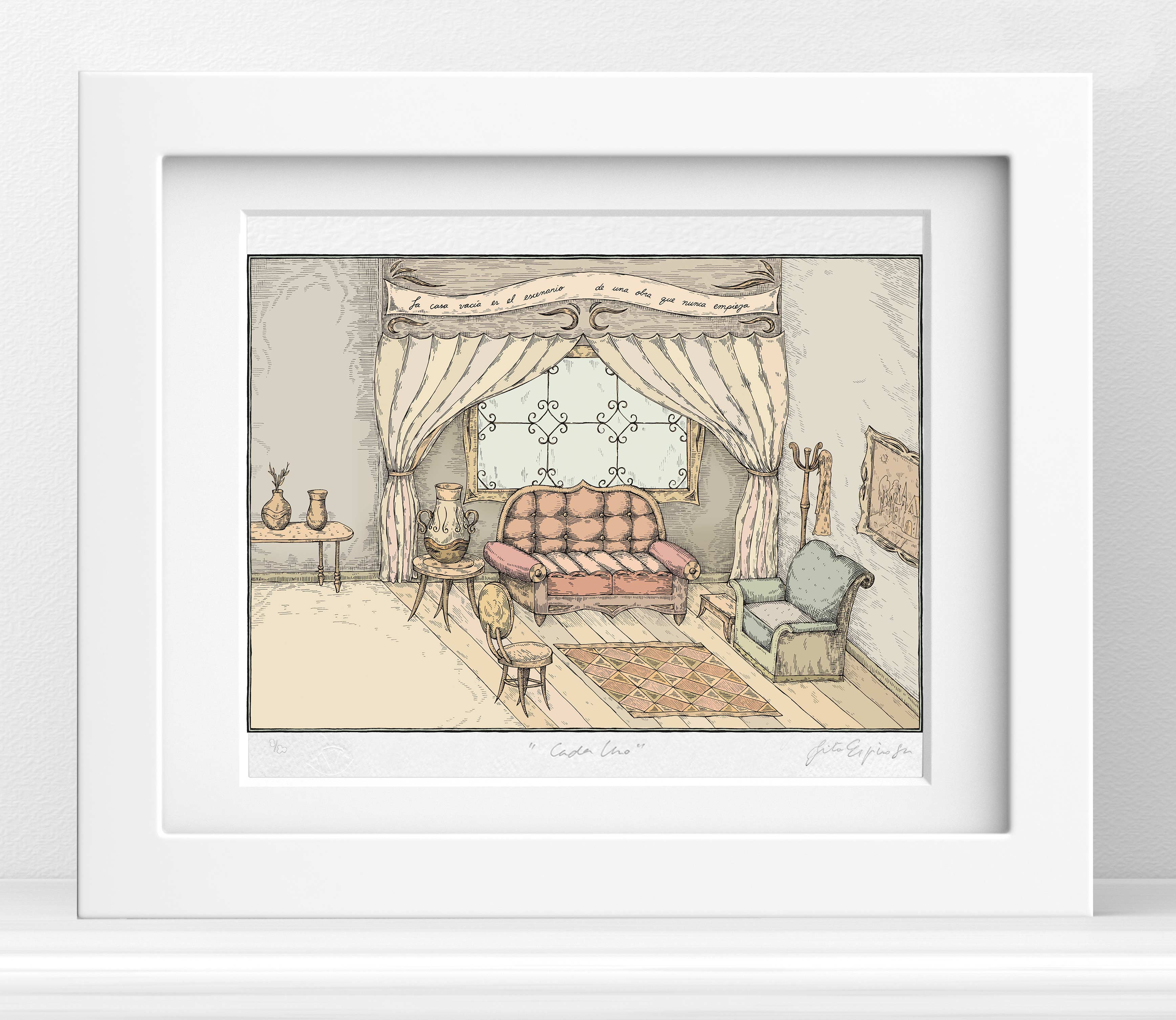 Este ejemplar es un grabado Giclée de edición limitada original de Fito Espinosa, que forma parte de la serie “Capitán de los Cielos Intermedios”, la cual busca representar el camino en la vida de un personaje y el viaje de retorno al hogar que muchos anhelamos.