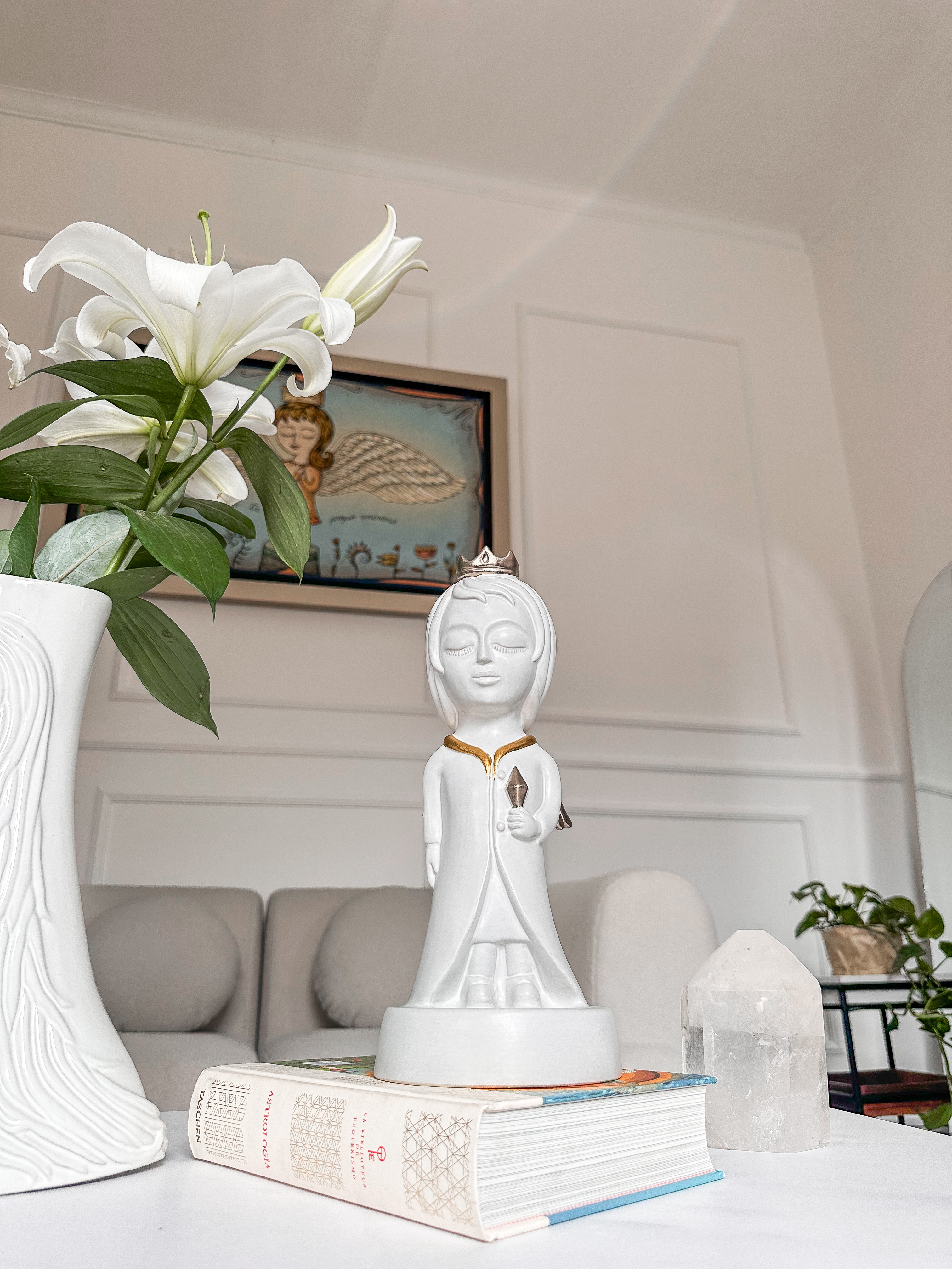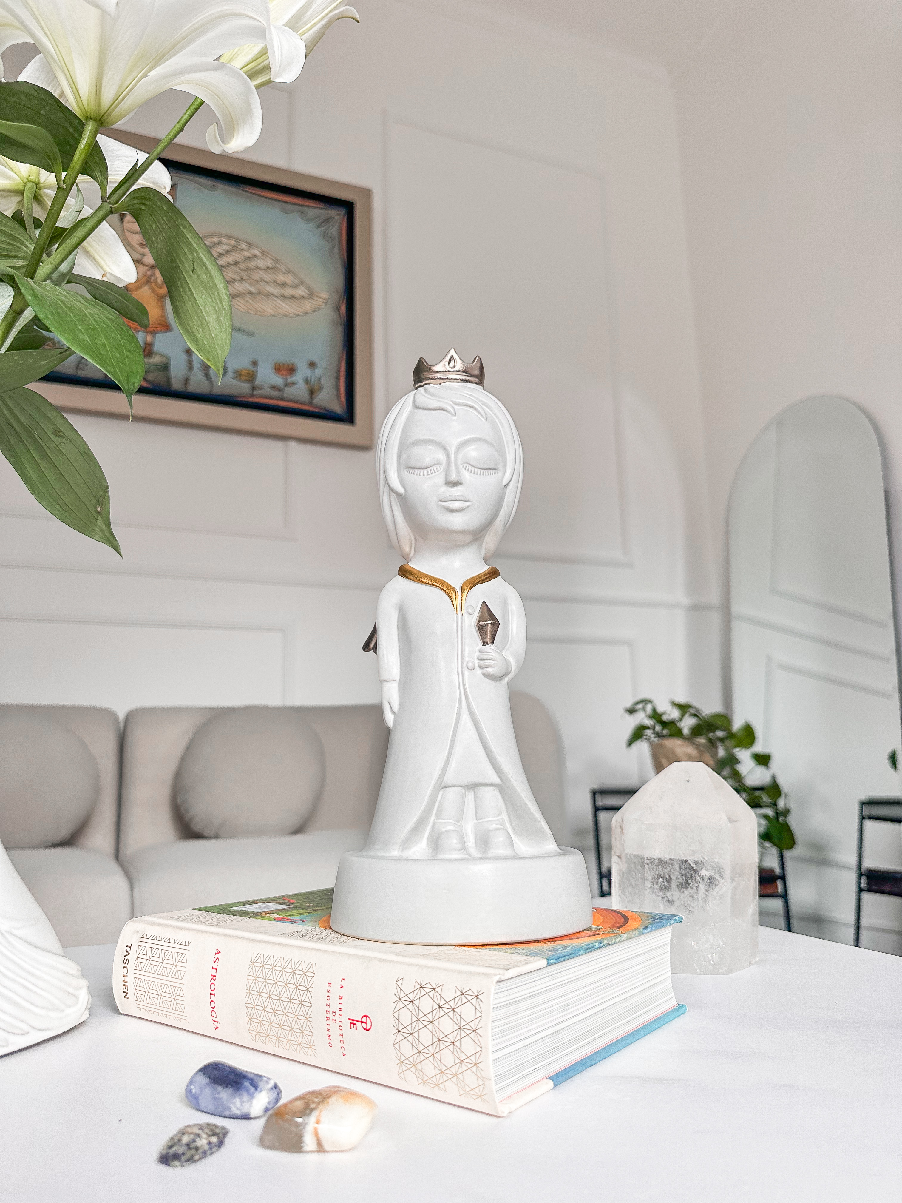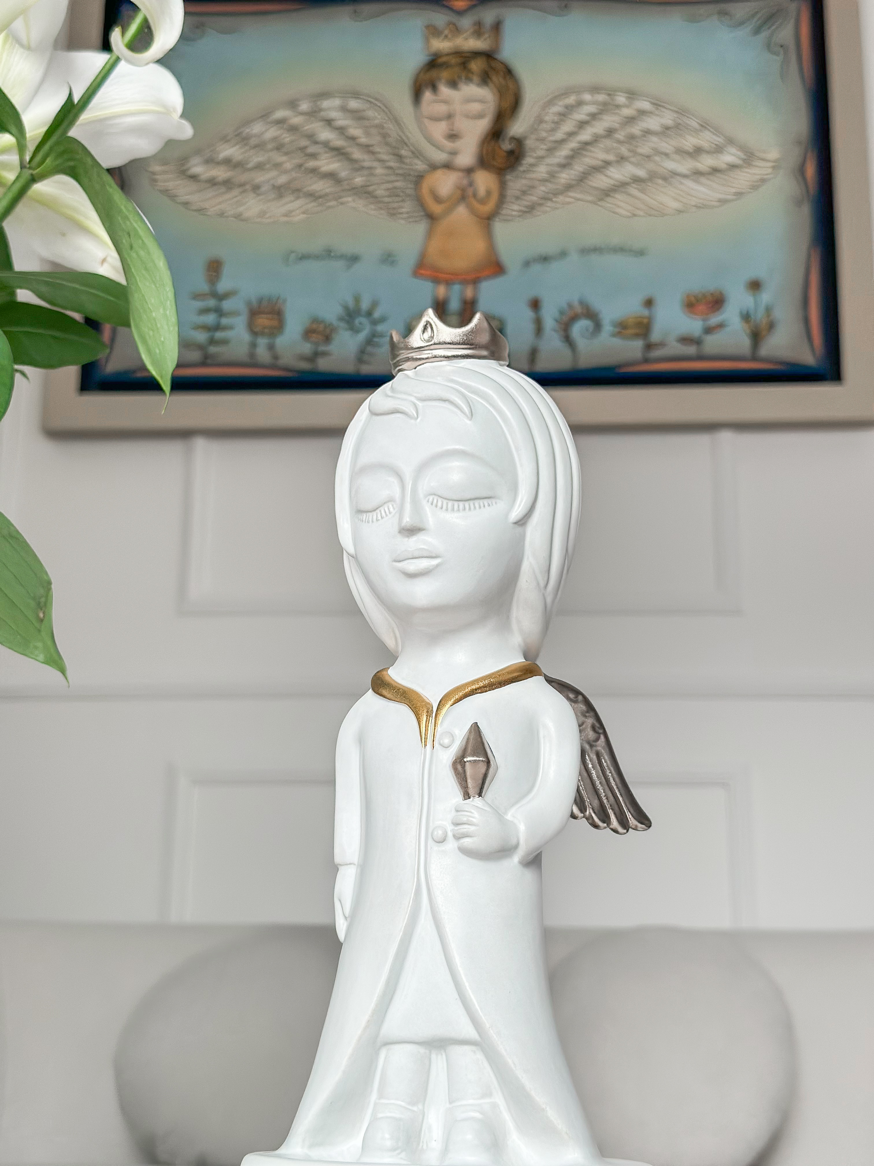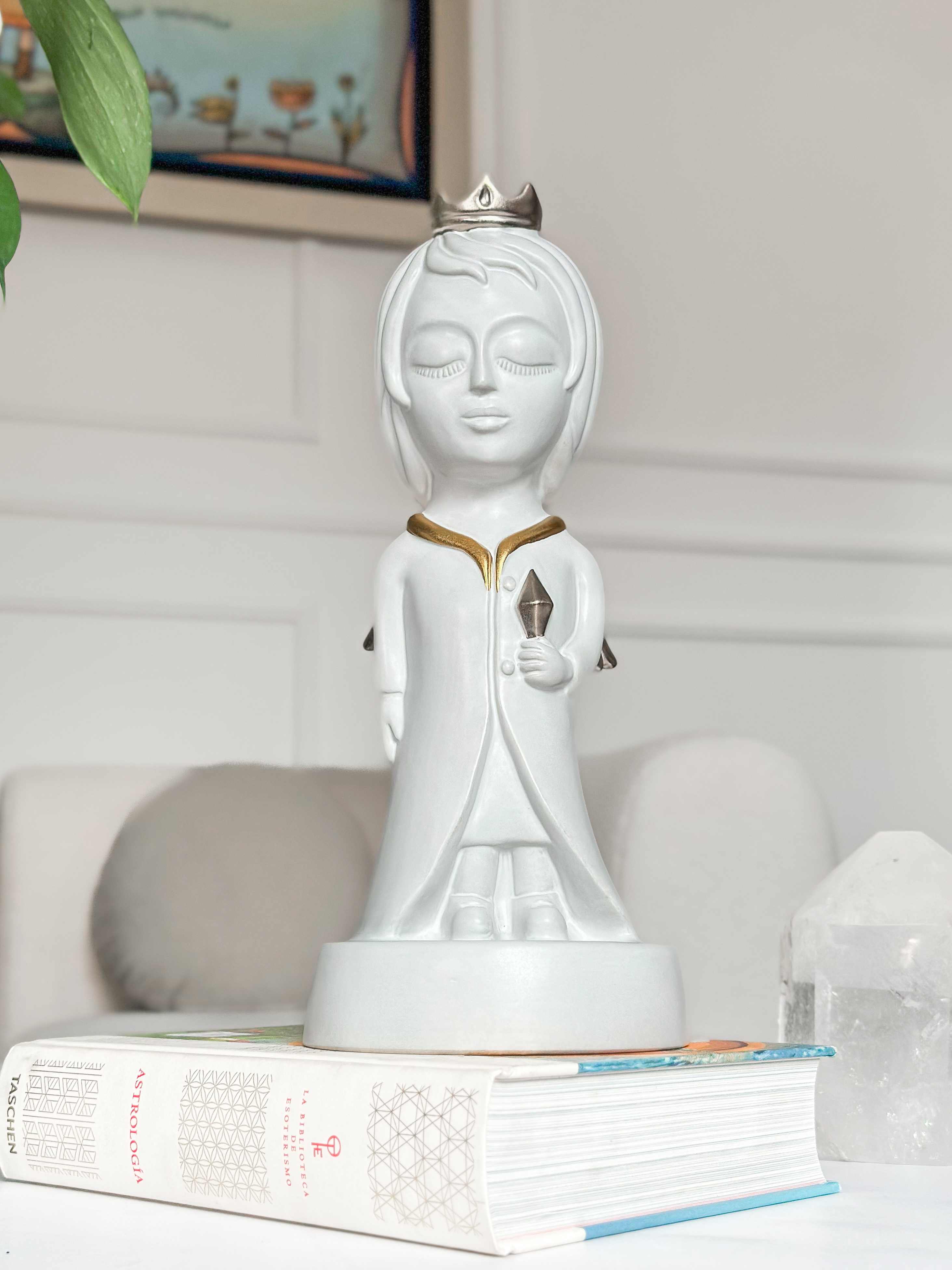 Icónico personaje que habita las historias y universo de Fito Espinosa. Escultura elaborada en arcilla natural con un baño en blanco mate, aplicaciones en oro y plata, y horneada a altas temperaturas.