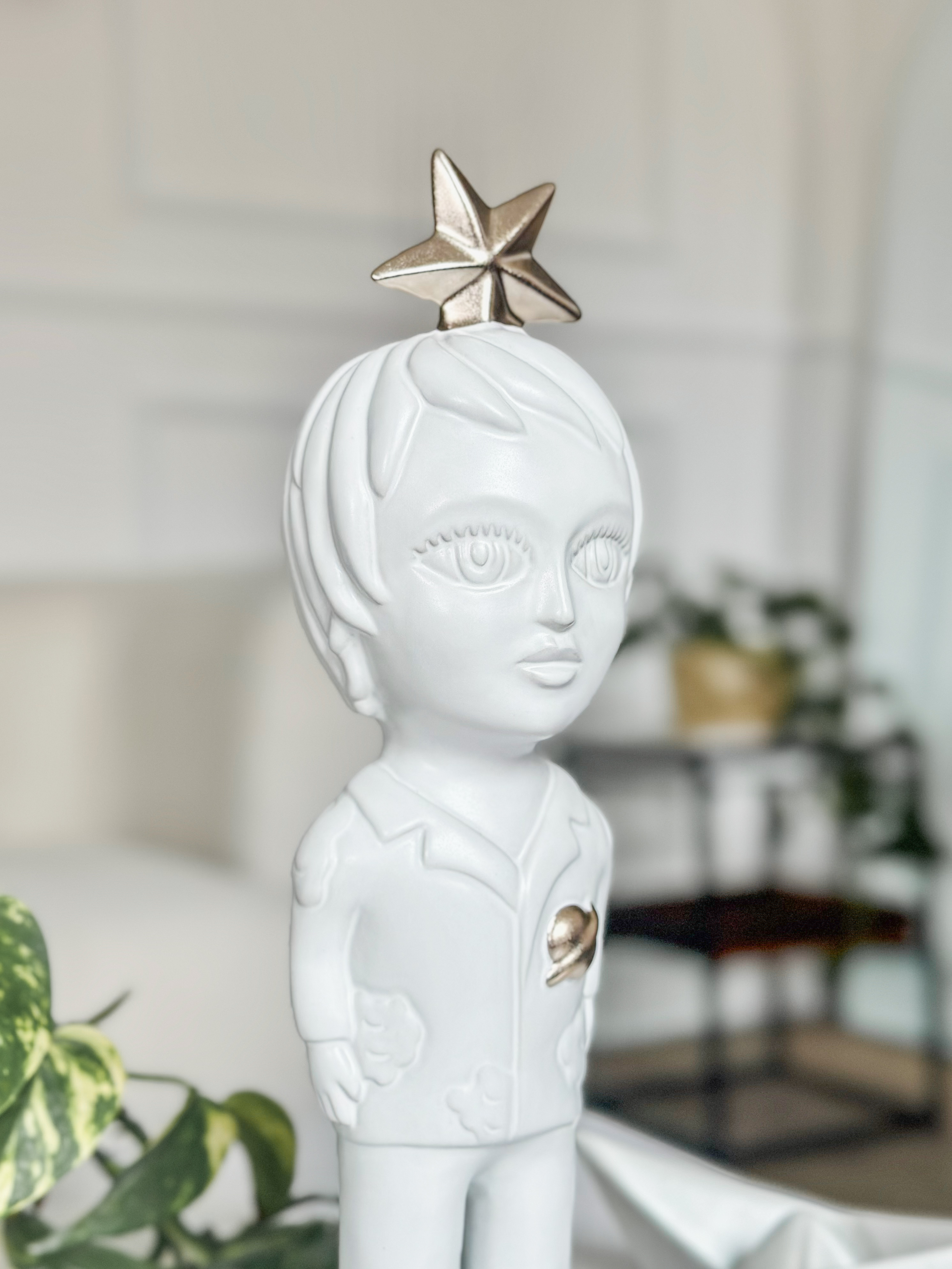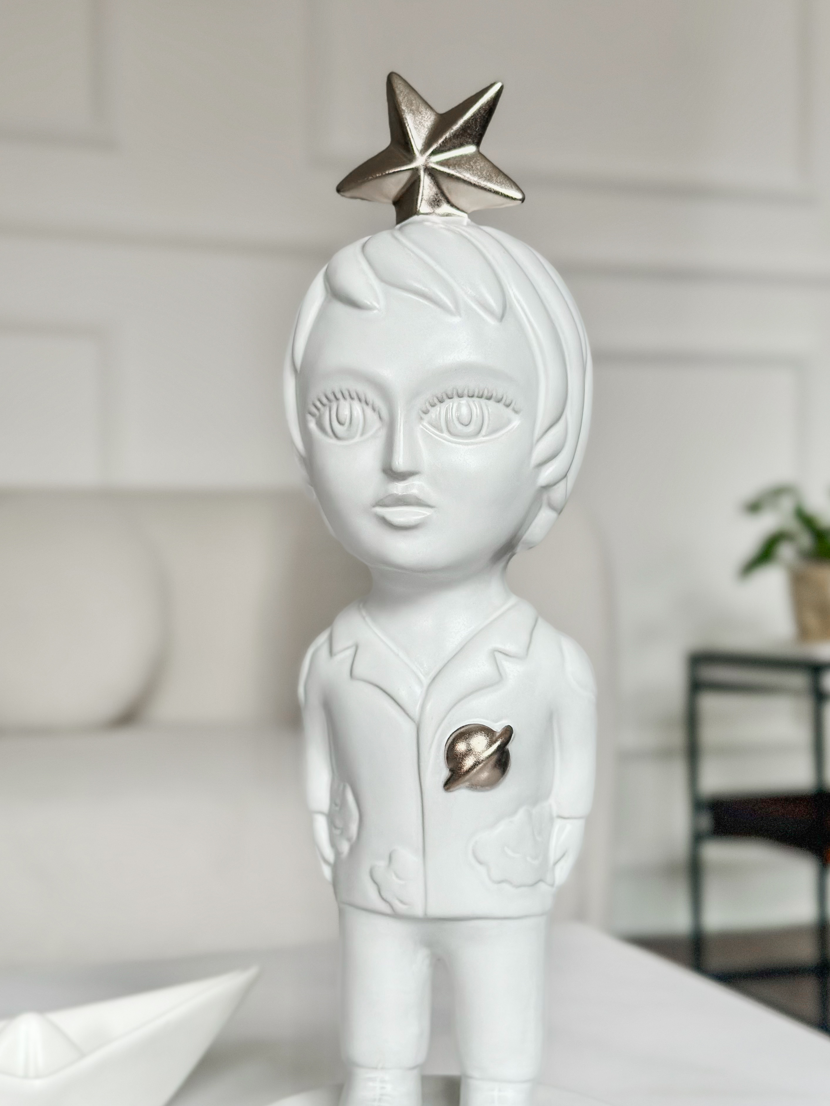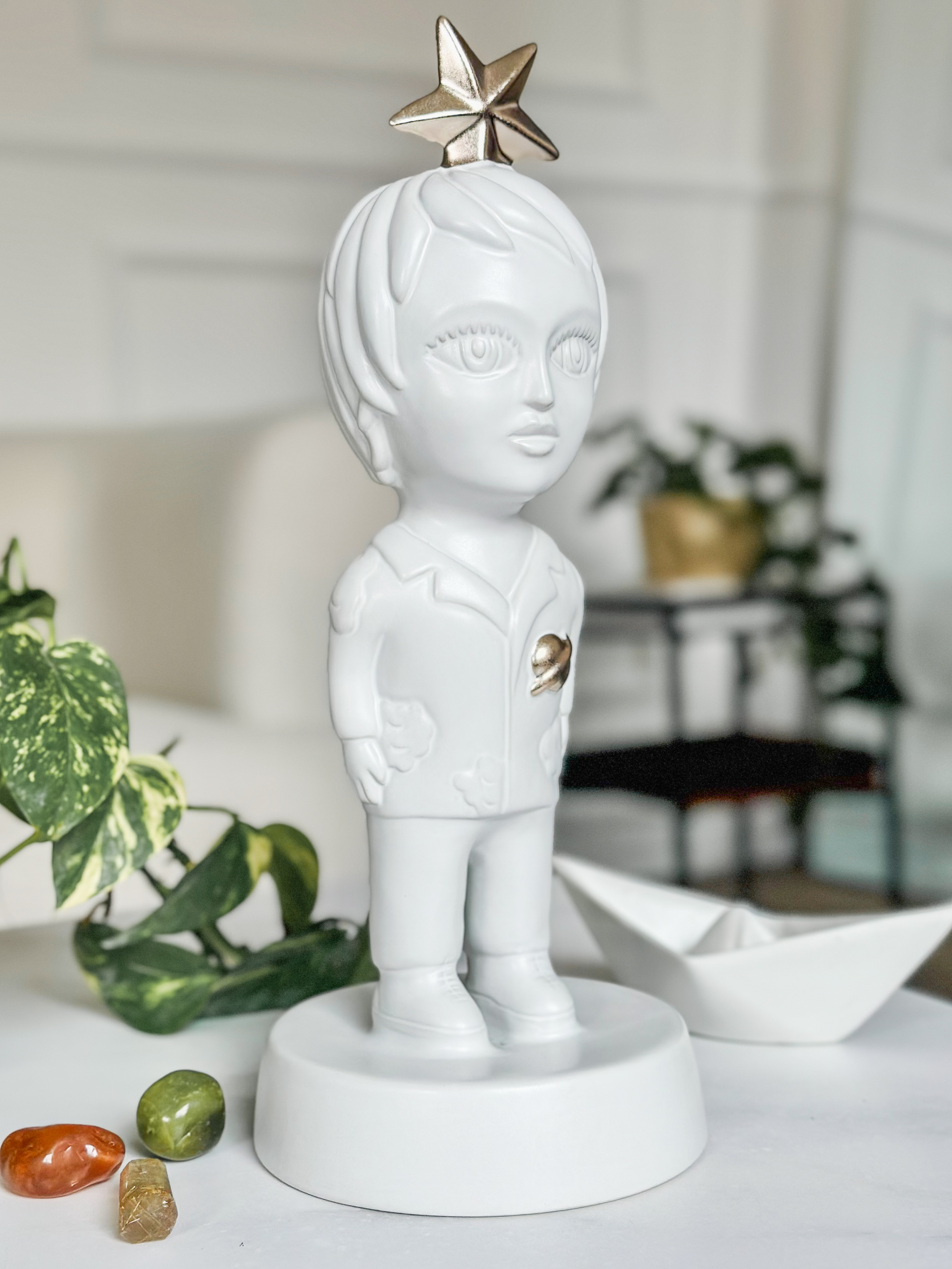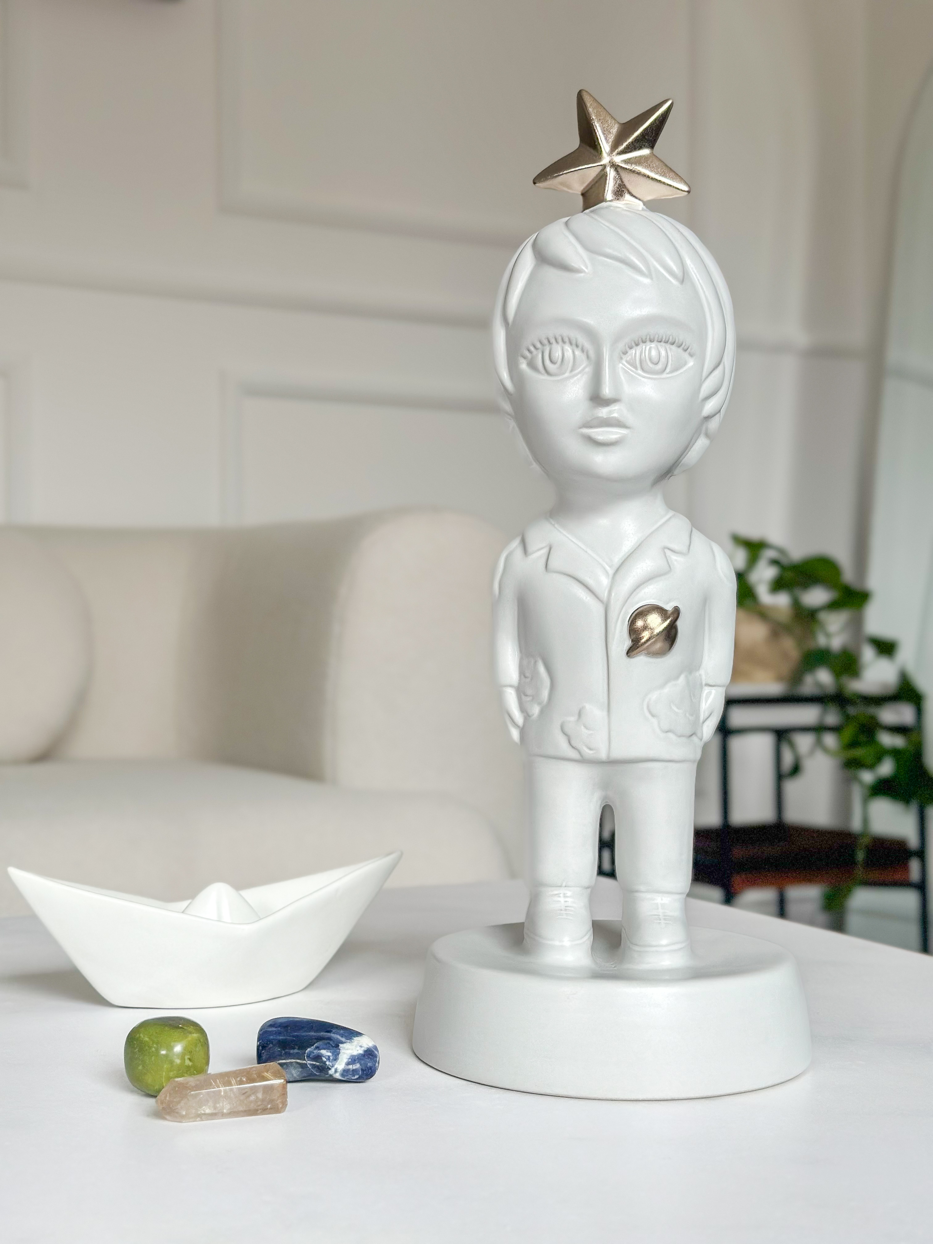 Icónico personaje que habita las historias y universo de Fito Espinosa. Escultura elaborada en arcilla natural con un baño en blanco mate, aplicaciones en plata, y horneada a altas temperaturas.