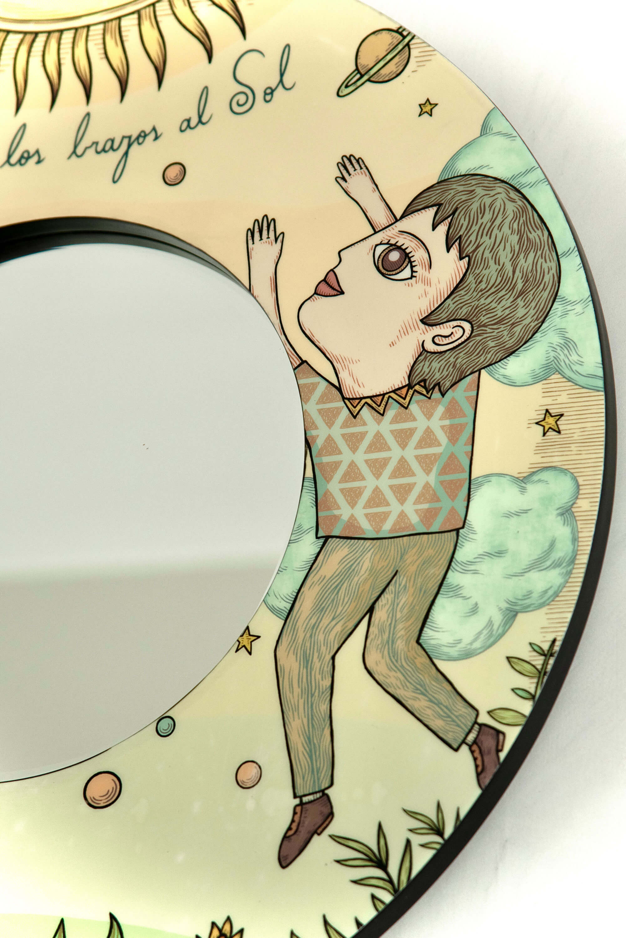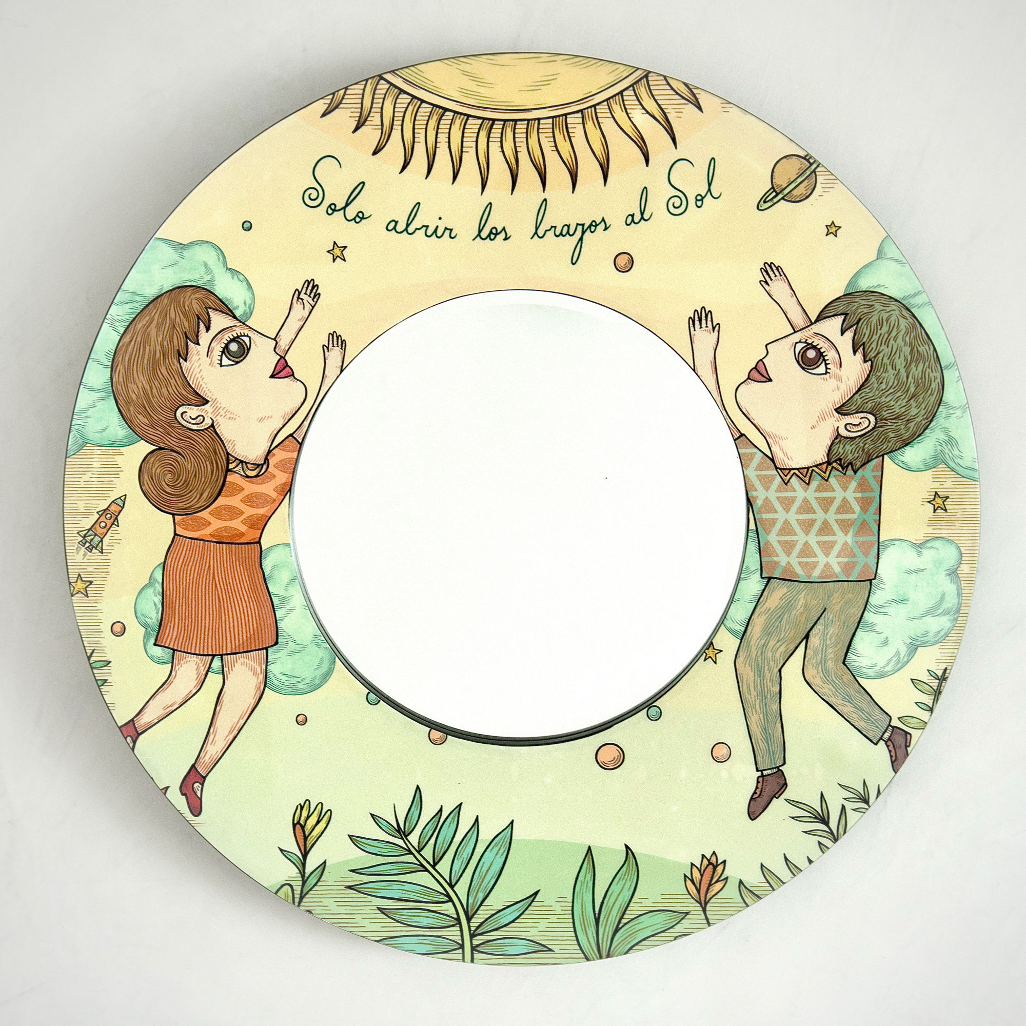 Espejo “Al Sol” con bisel de 1 cm + grabado trabajado sobre madera y bañado en resina. Formato elegante que aporta a los espacios un brillo natural.