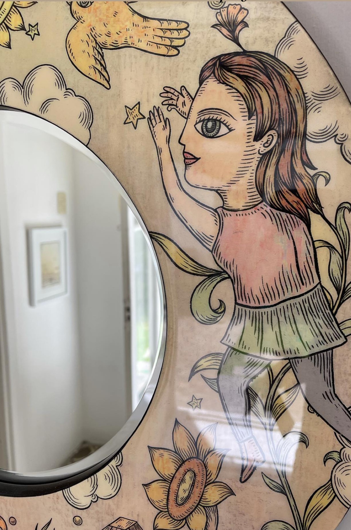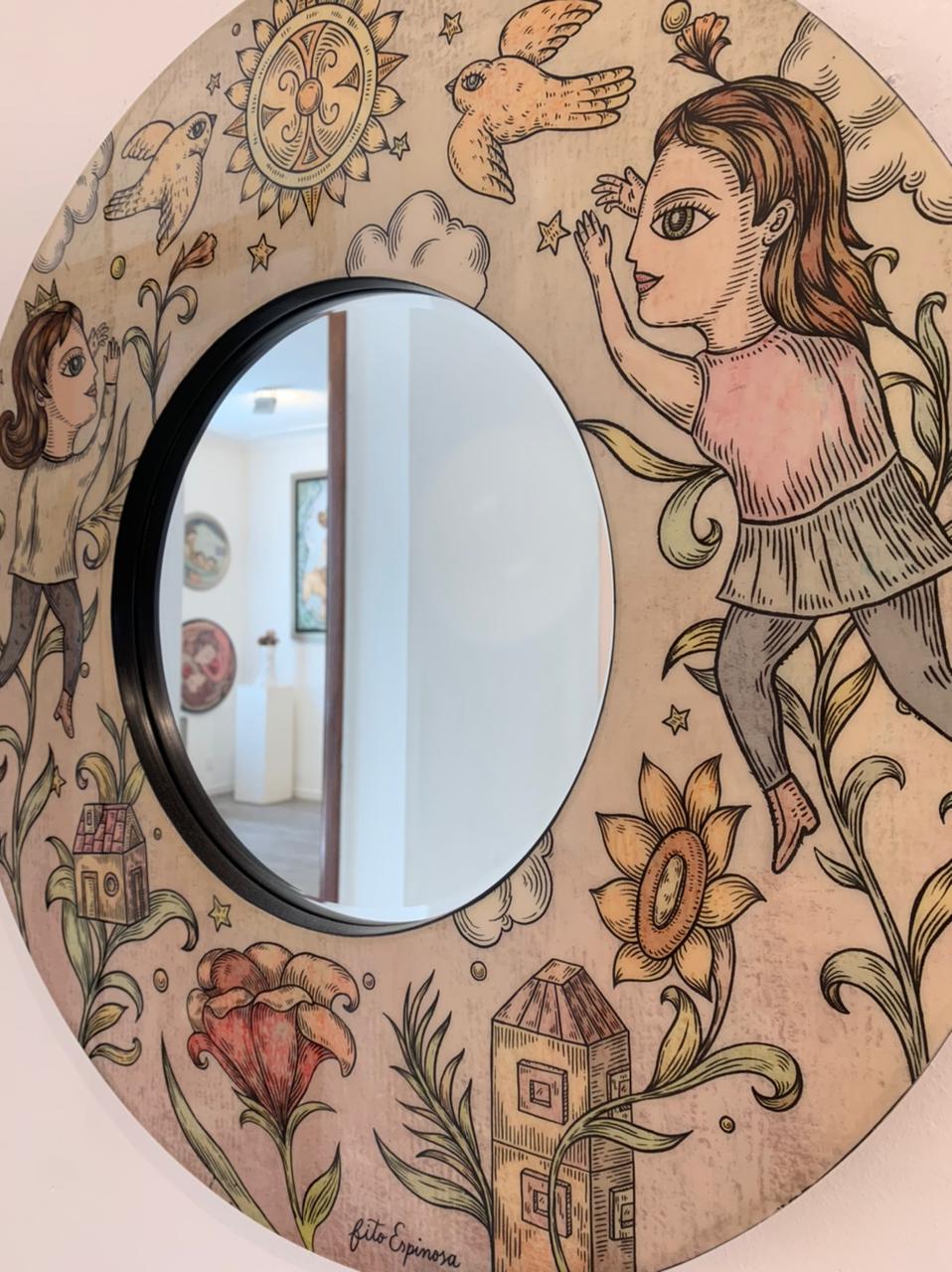 Espejo “Coral” con bisel de 1 cm + grabado trabajado sobre madera y bañado en resina. Formato elegante que aporta a los espacios un brillo natural.