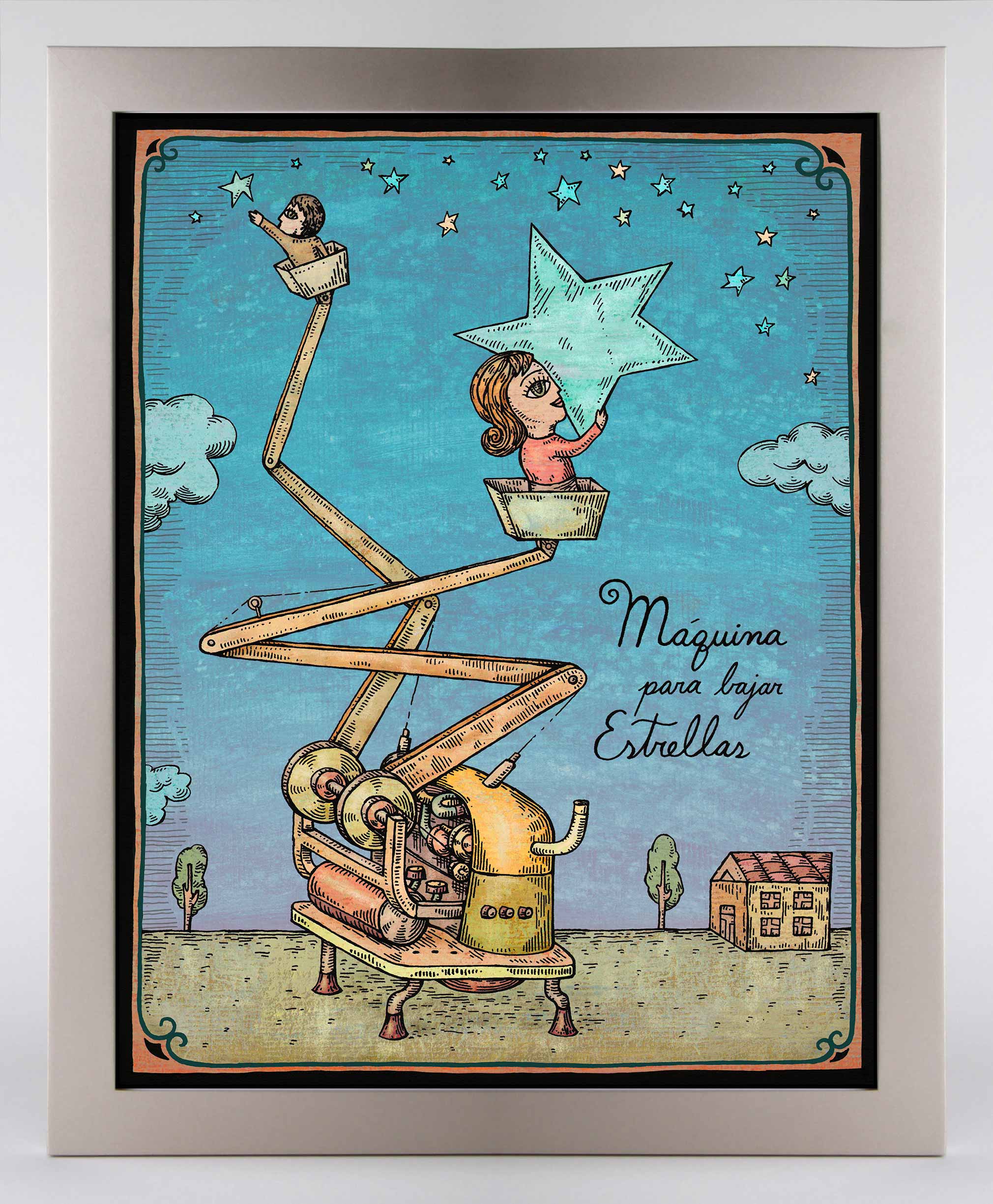 Este ejemplar es un grabado Giclée de edición limitada original de Fito Espinosa que forma parte de la serie “Máquinas”. Las ilustraciones aquí reunidas son algunas de las más antiguas, concebidas por el artista en su afán por inventar herramientas útiles como nuevas maneras de vivir en el mundo.
