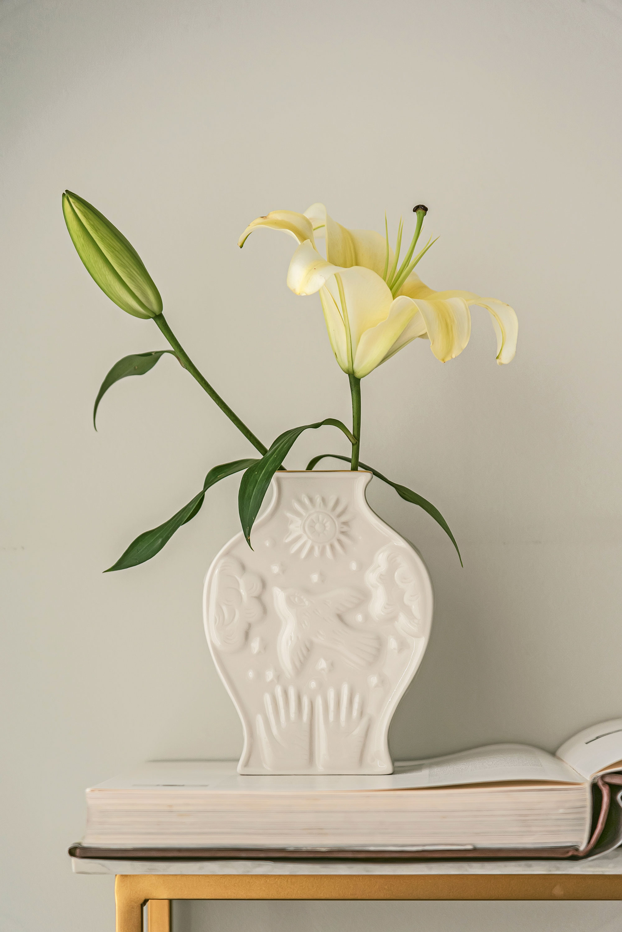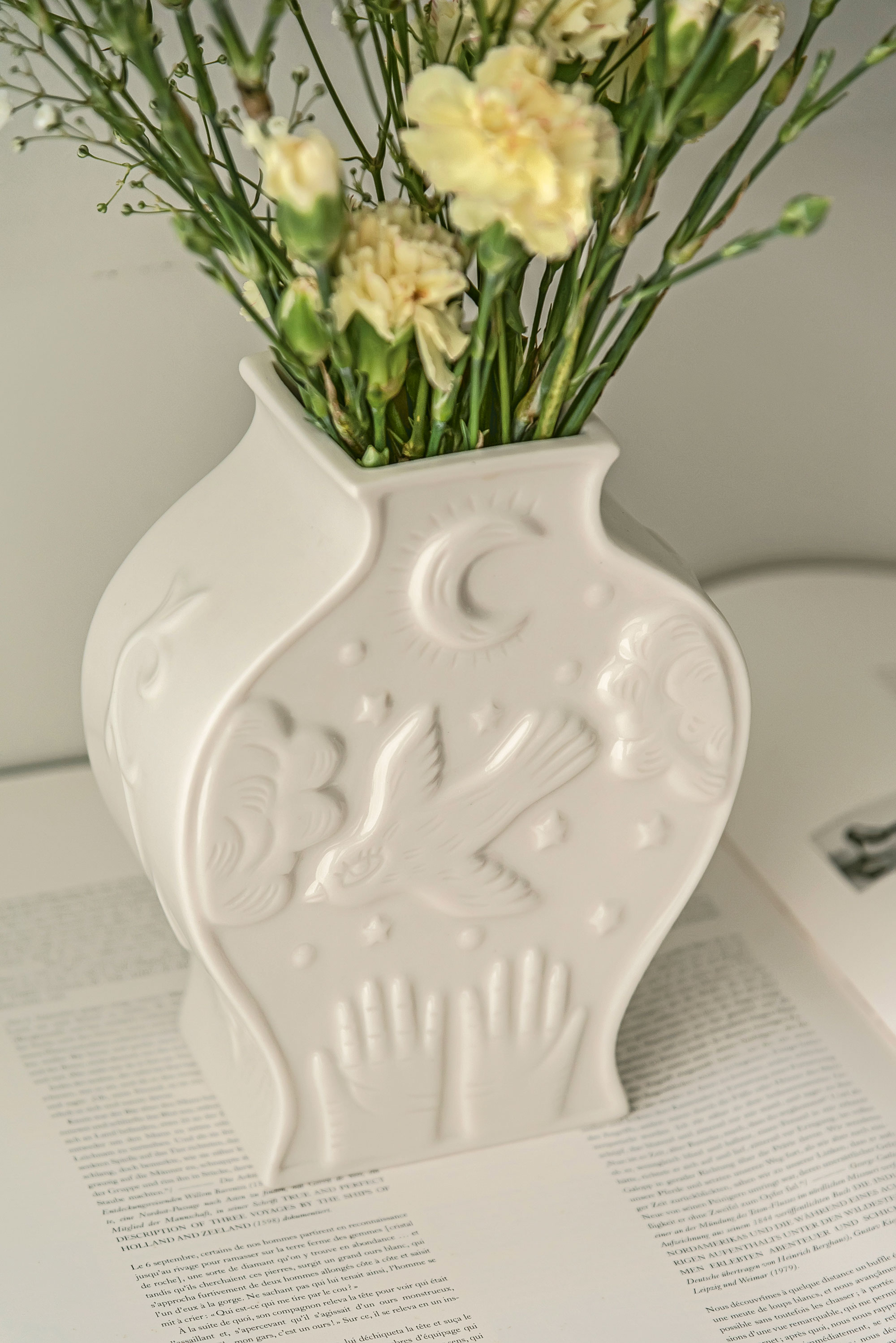 Florero de porcelana de tamaño pequeño, esmaltado en acabado brillante y horneado a altas temperaturas. El jarrón ilustra un ave siendo puesta en libertad e iniciando el vuelo, acompañado por la luna a una cara y por el sol en la otra.