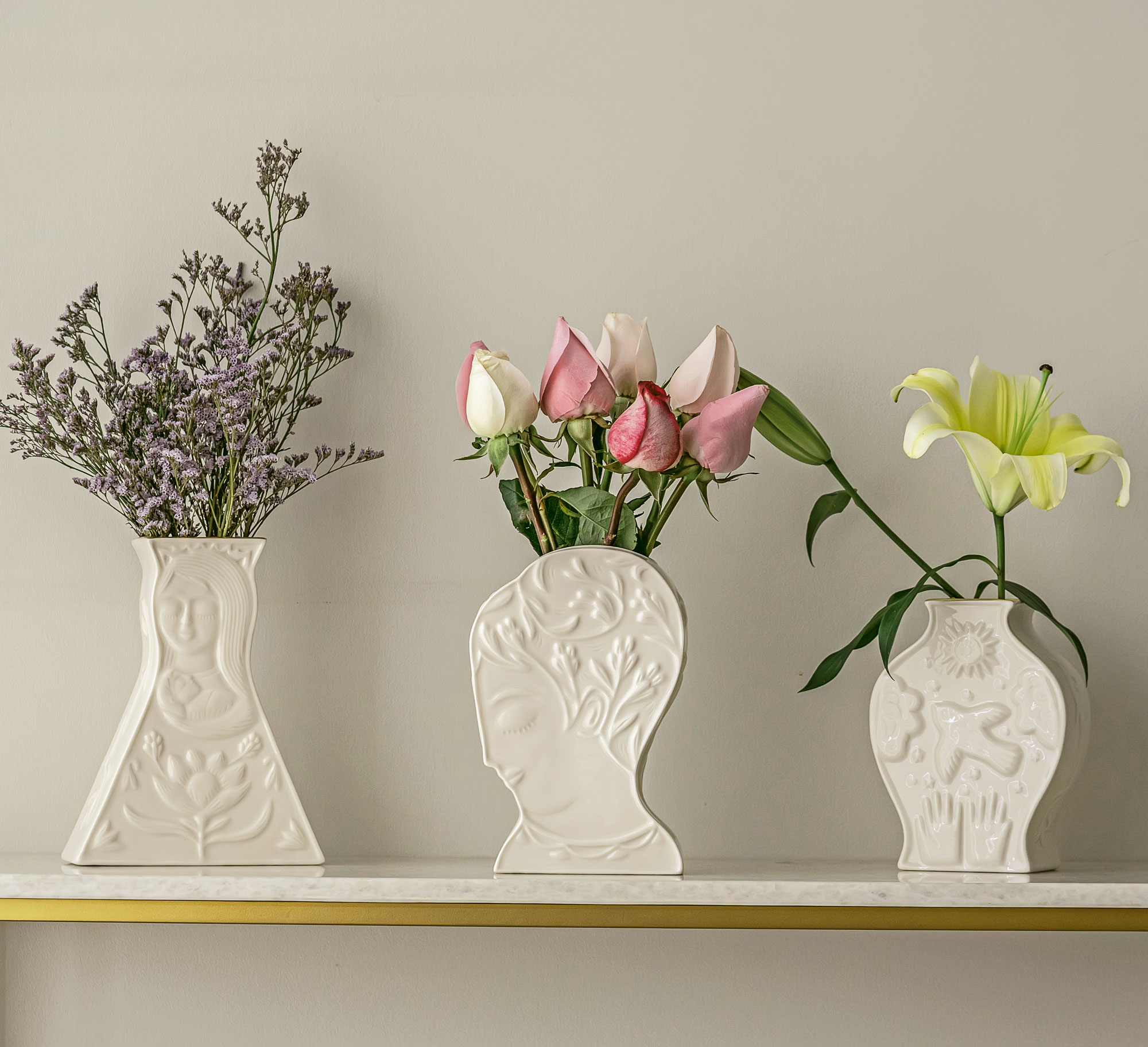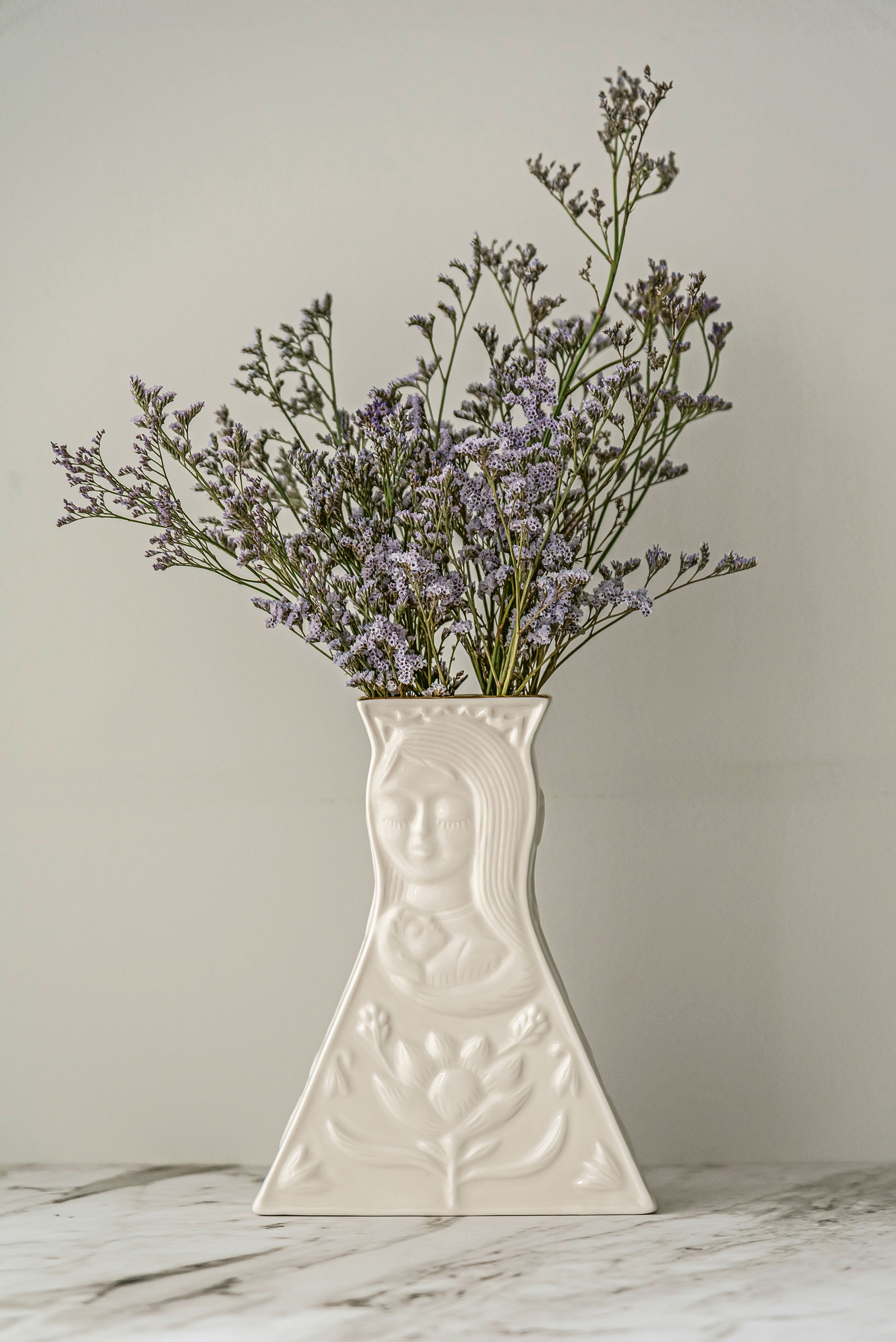 Florero de porcelana de tamaño mediano, esmaltado en acabado brillante y horneado a altas temperaturas. El personaje representa una mujer que envuelve a un niño en sus brazos como gesto de protección, concepto alusivo a la narrativa de Fito Espinosa.