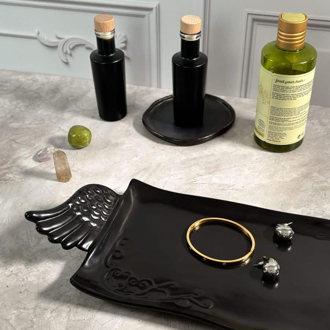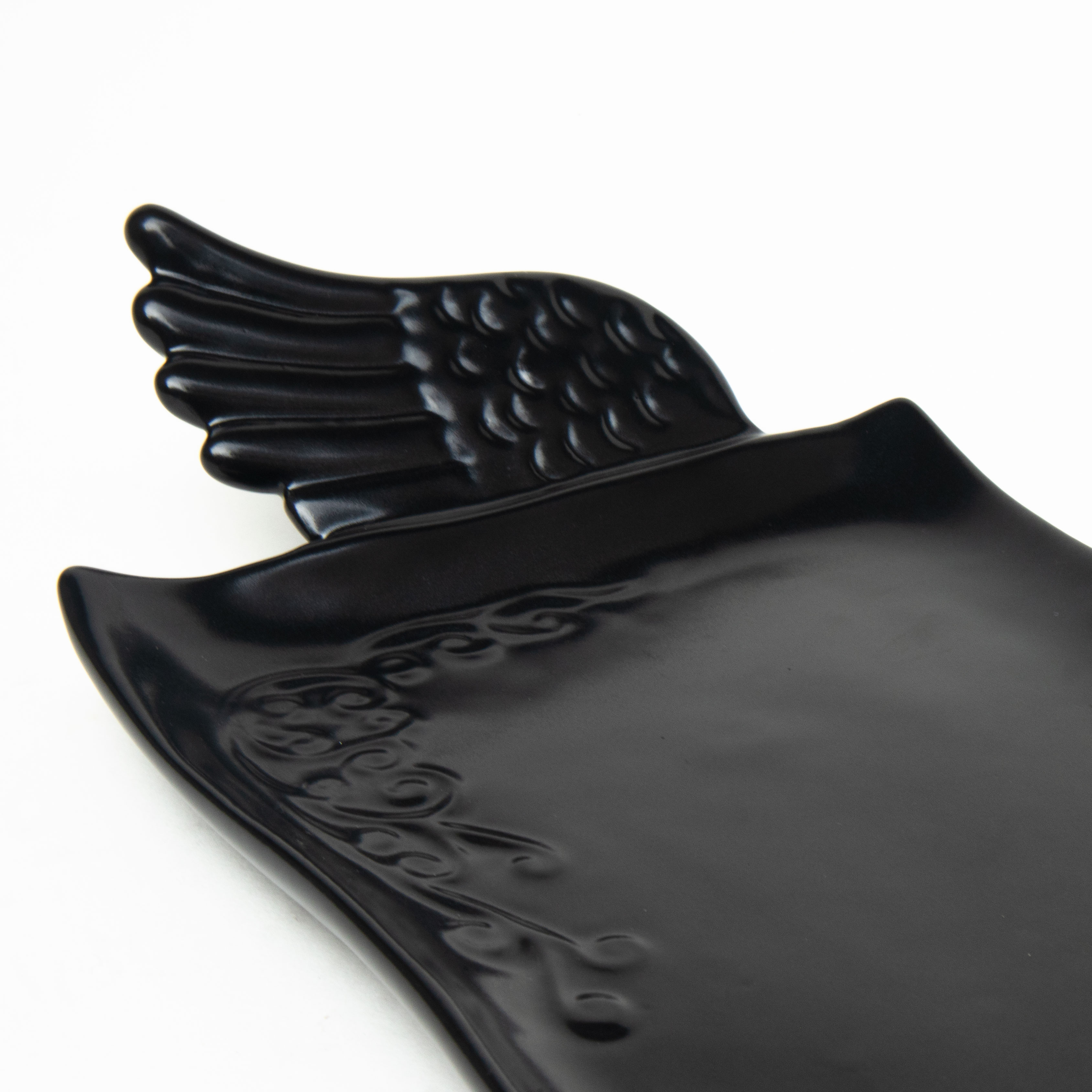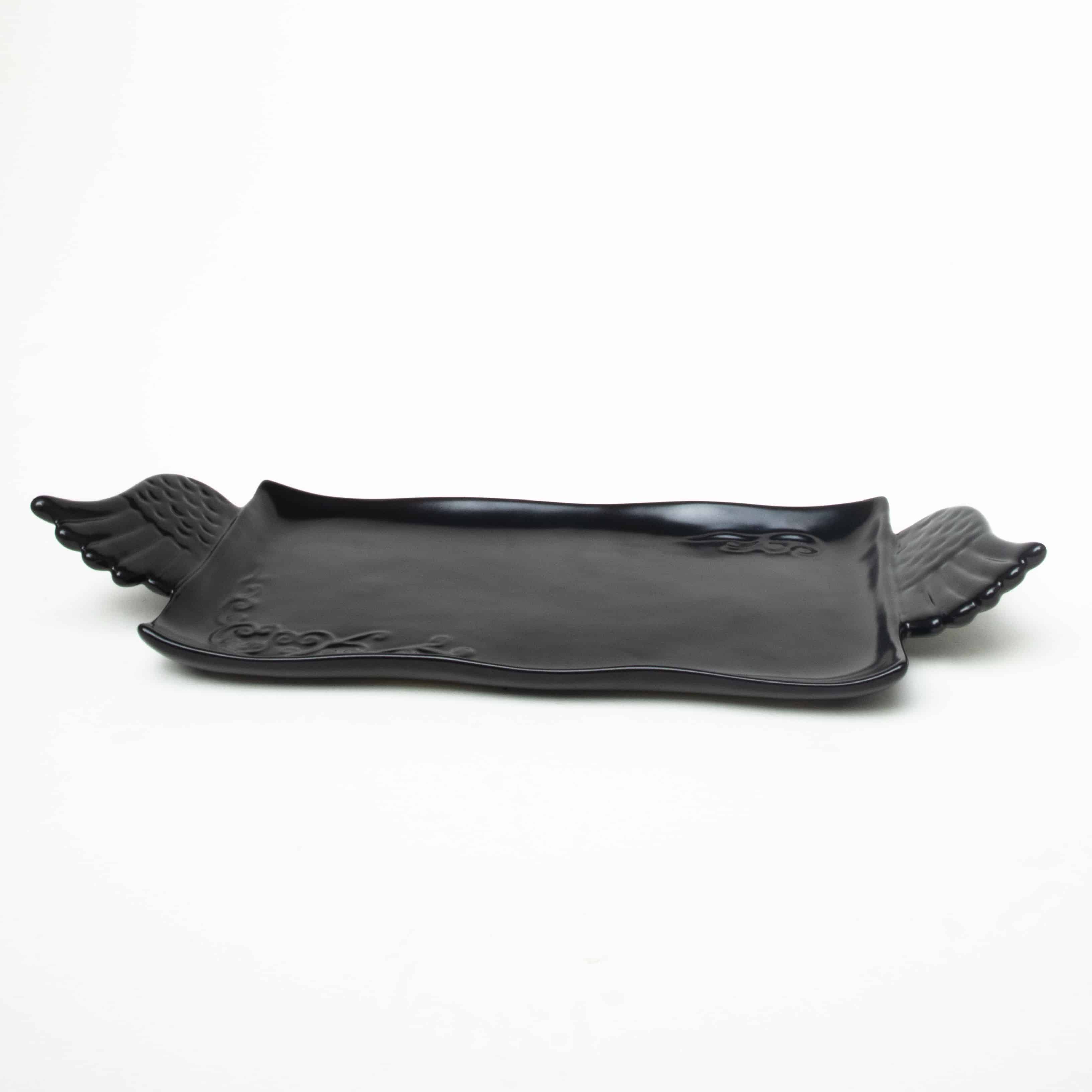 Fuente Alas en su versión negra. Pieza que aporta modernidad y disrupción a tu espacio. Bandeja decorativa con asas aladas ideal para acompañar la mesa o como un accesorio en un baño elegante. Hecha a mano en gres con acabado mate y horneada a altas temperaturas.