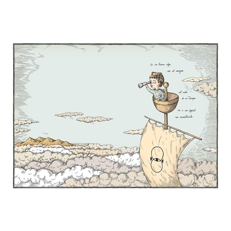 Este ejemplar es un grabado Giclée de edición limitada original de Fito Espinosa, que forma parte de la serie “Capitán de los Cielos Intermedios”, la cual busca representar el camino en la vida de un personaje y el viaje de retorno al hogar que muchos anhelamos.