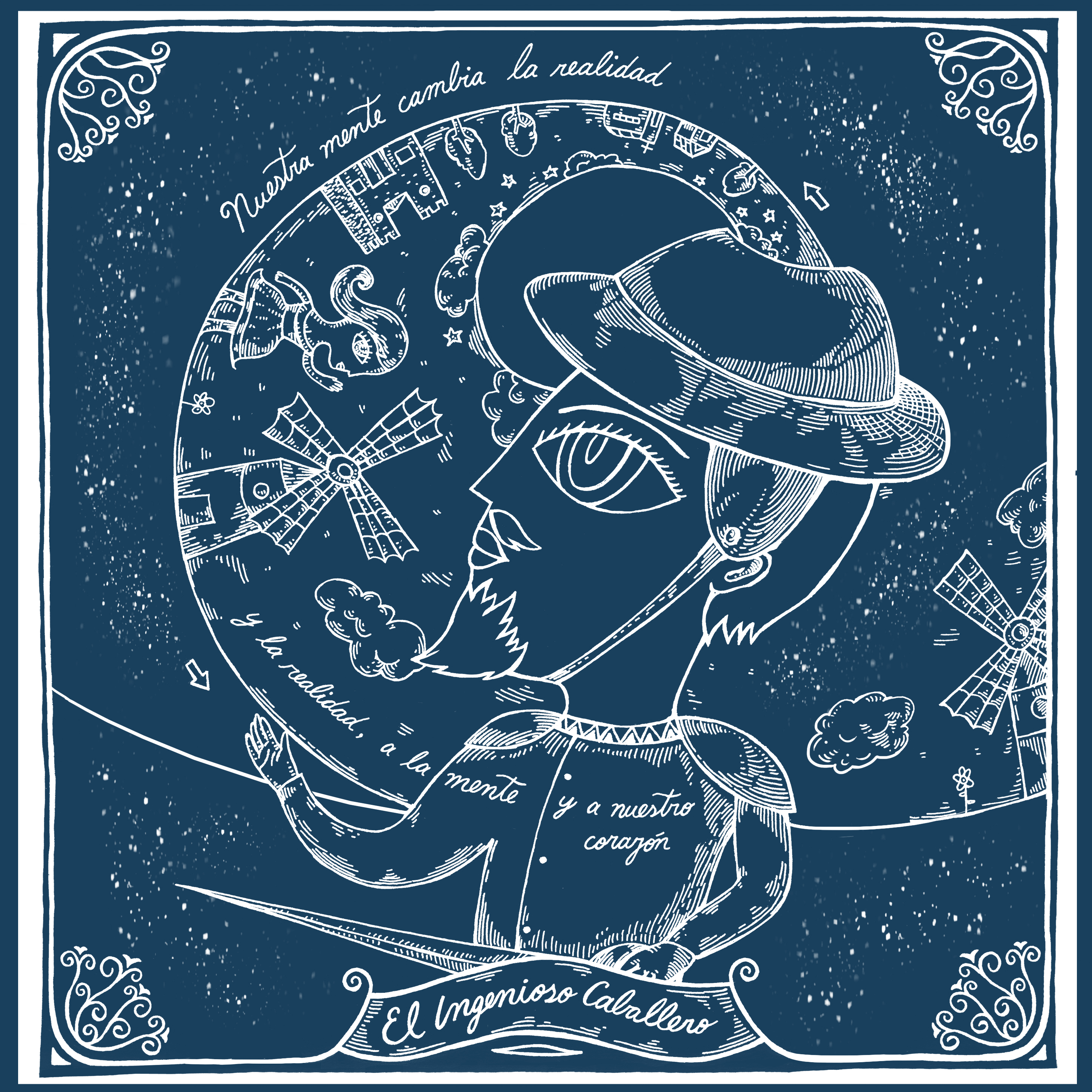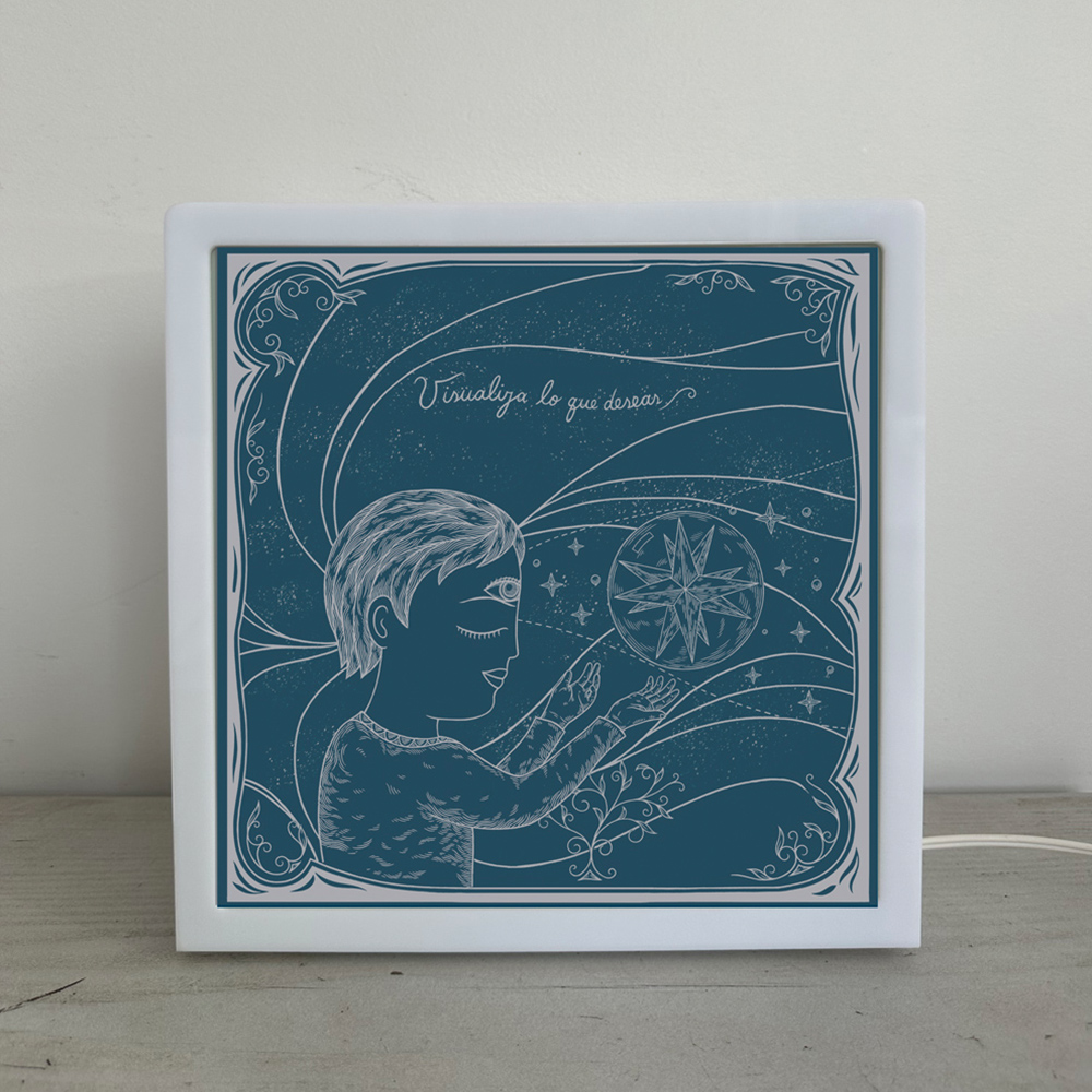 A manera de caja de luz, las lámparas cuentan con una ilustración diferente a cada lado (02 en total) inspiradas en las ilustraciones “Visualiza” y “Quijote”. Hechas en backlight y acrílico blanco traslúcido, que al encenderse irrandia luz desde el interior.