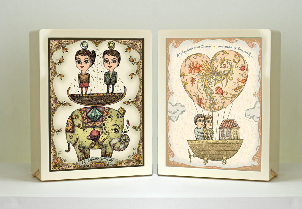 A manera de caja de luz, las lámparas cuentan con una ilustración diferente a cada lado (02 en total) que se aprecian a color de día, y se encienden de noche con la luz que irradia desde el interior. Hechas en backlight y acrílico beige lechoso traslúcido.