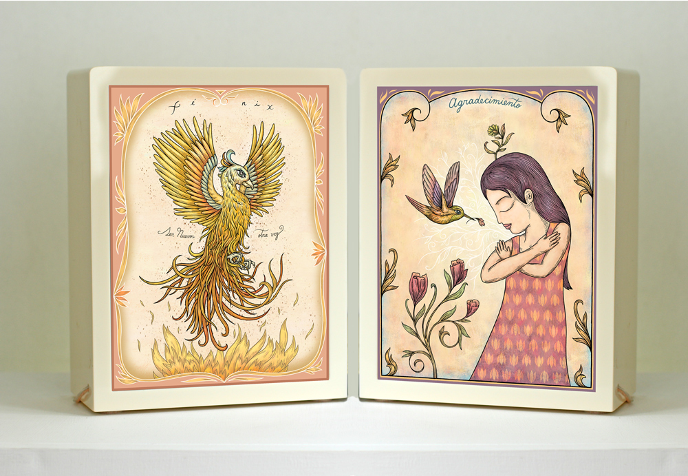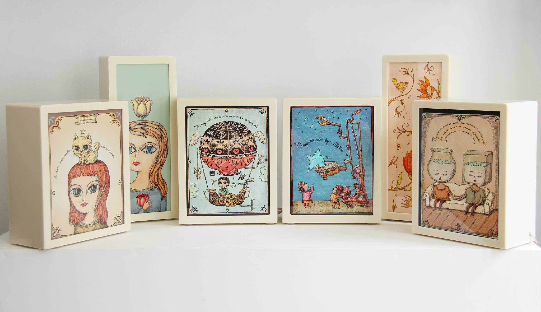 A manera de caja de luz, las lámparas cuentan con una ilustración diferente a cada lado (02 en total) que se aprecian a color de día, y se encienden de noche con la luz que irradia desde el interior. Hechas en backlight y acrílico beige lechoso traslúcido.