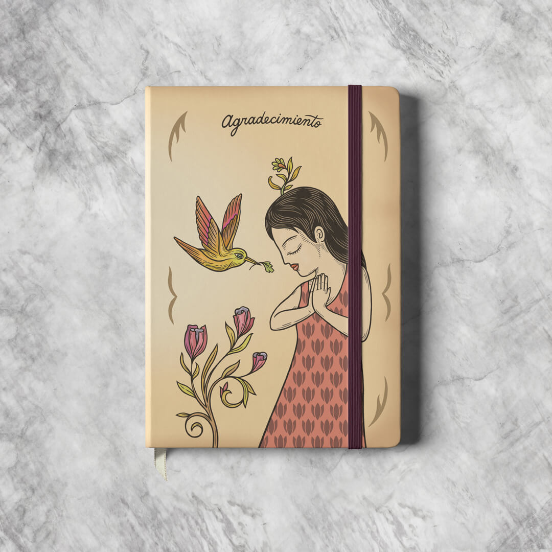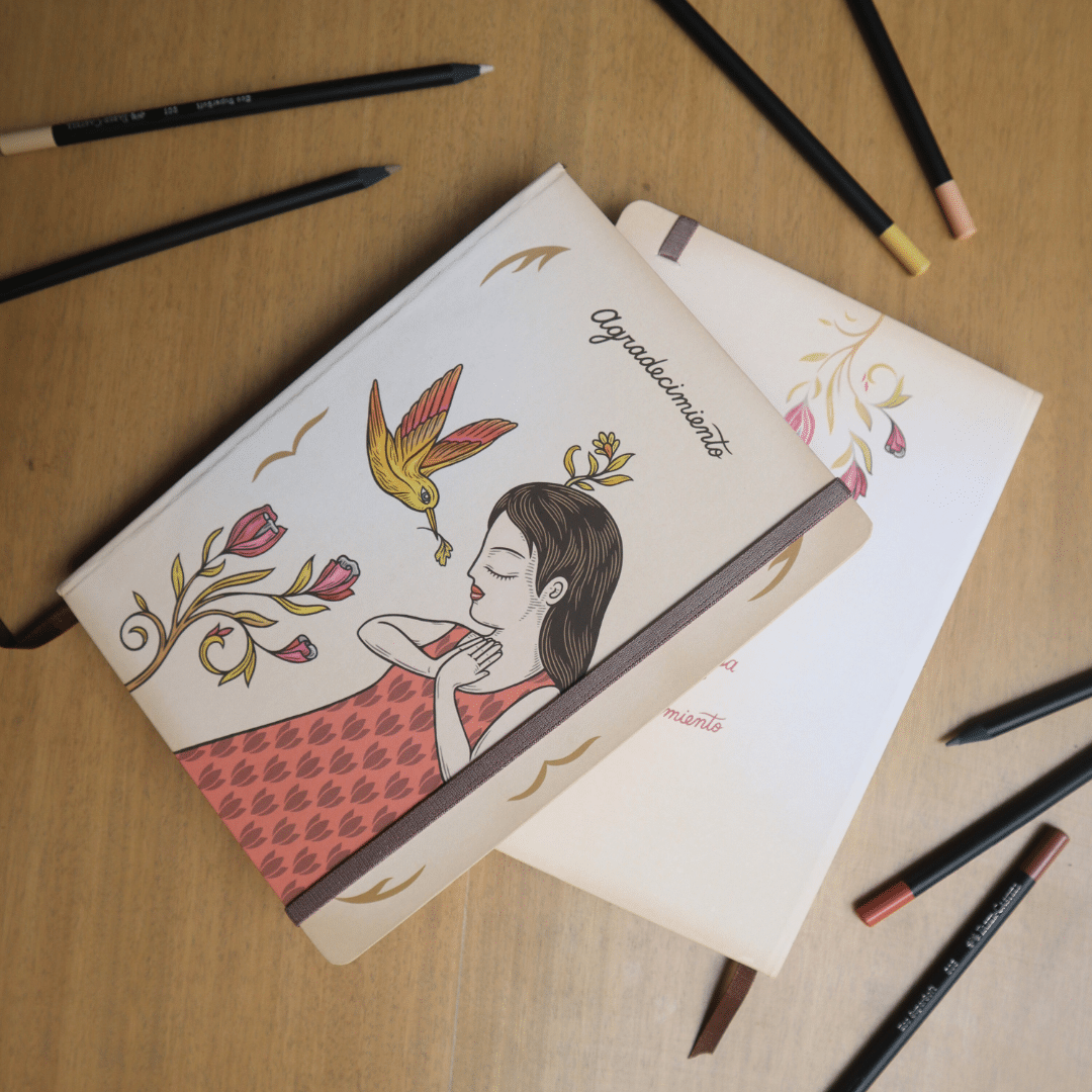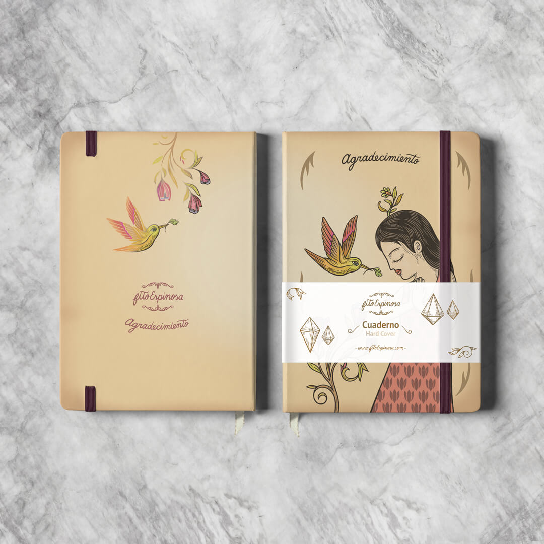 Libreta tapa dura tamaño A5, elaborado con papel avena fino de 85 grms, elástico marcador y 200 páginas interiores en blanco ideales para escribir o dibujar. Las dos primeras páginas incluyen un encabezado de Fito Espinosa, así como una ilustración a full color en exteriores. Basado en la ilustración “Agradecimiento” de Fito Espinosa.