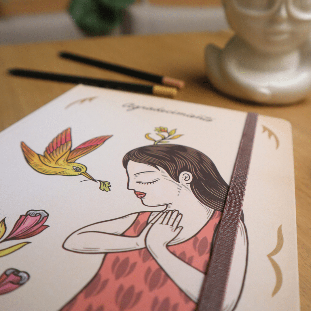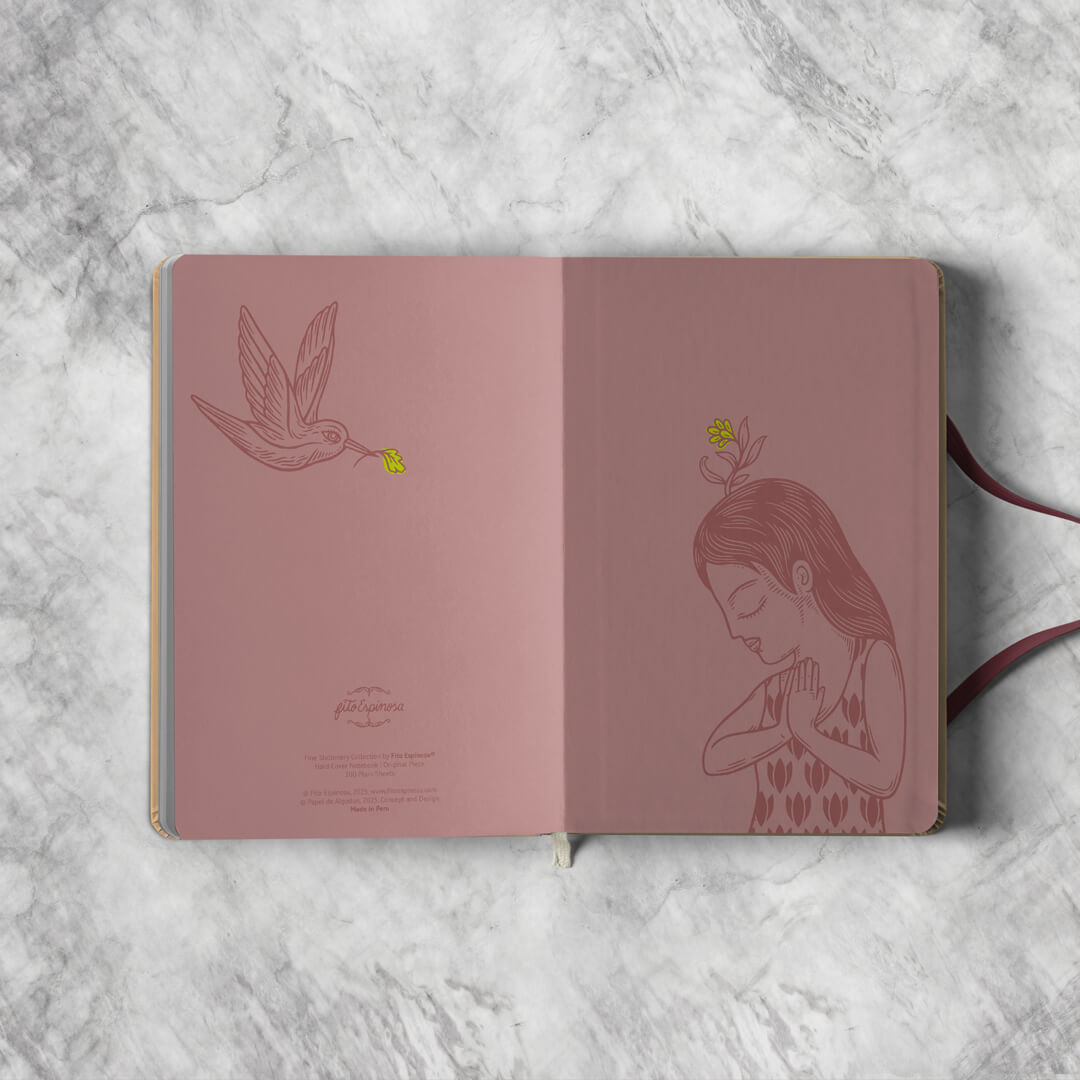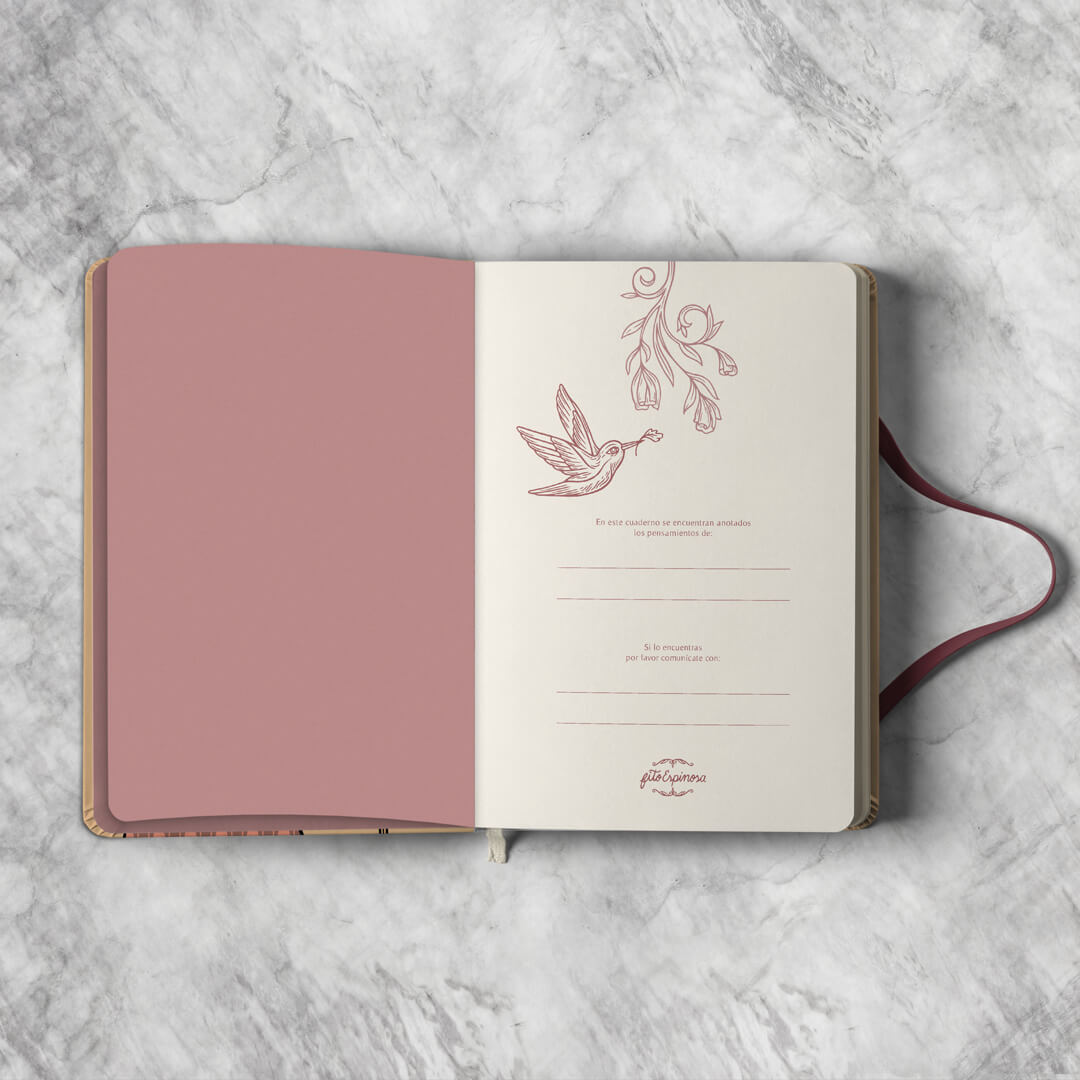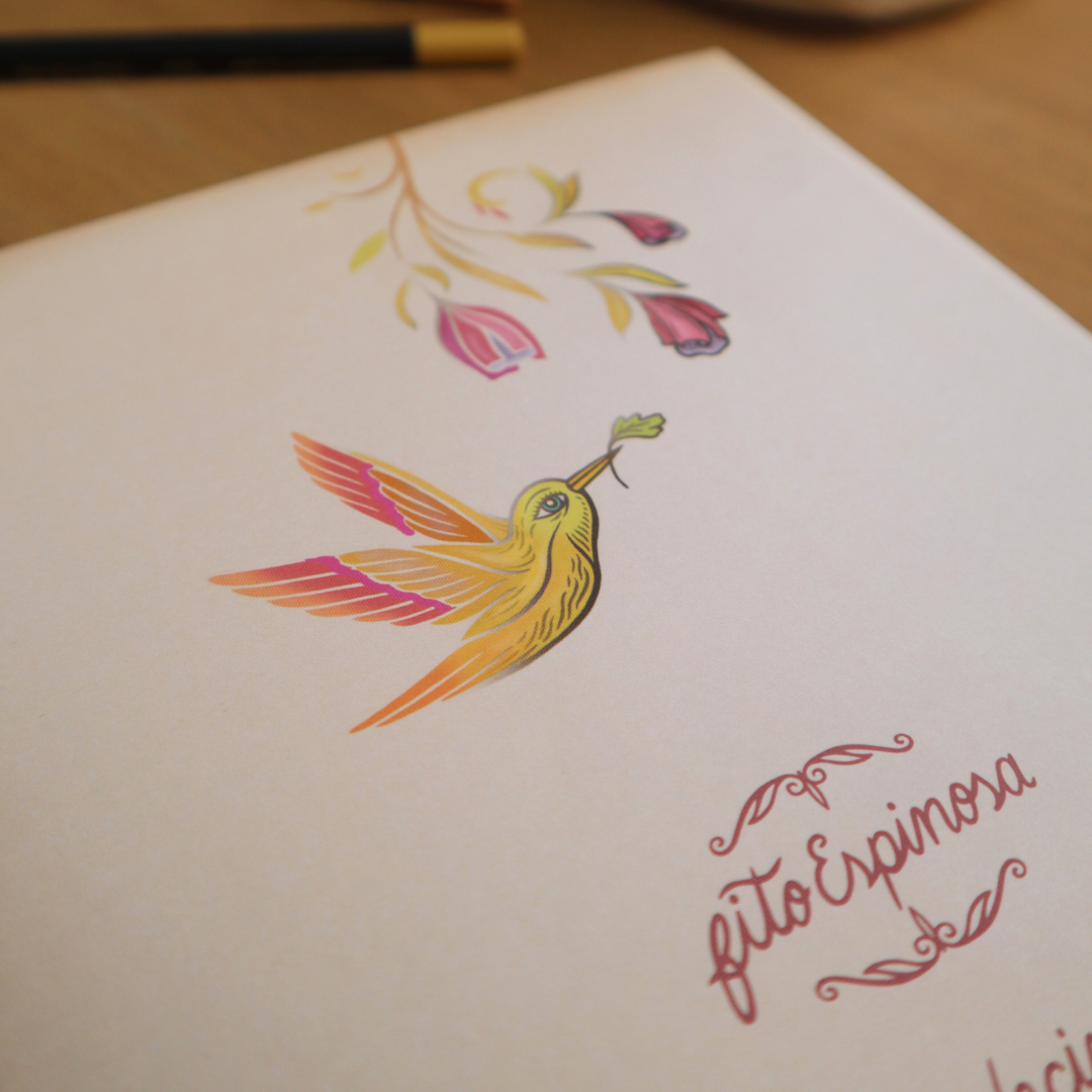 Libreta tapa dura tamaño A5, elaborado con papel avena fino de 85 grms, elástico marcador y 200 páginas interiores en blanco ideales para escribir o dibujar. Las dos primeras páginas incluyen un encabezado de Fito Espinosa, así como una ilustración a full color en exteriores. Basado en la ilustración “Agradecimiento” de Fito Espinosa.