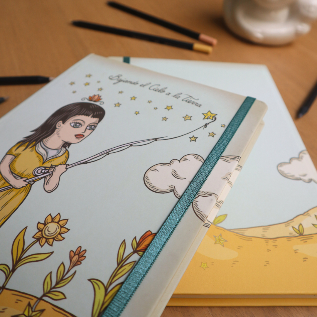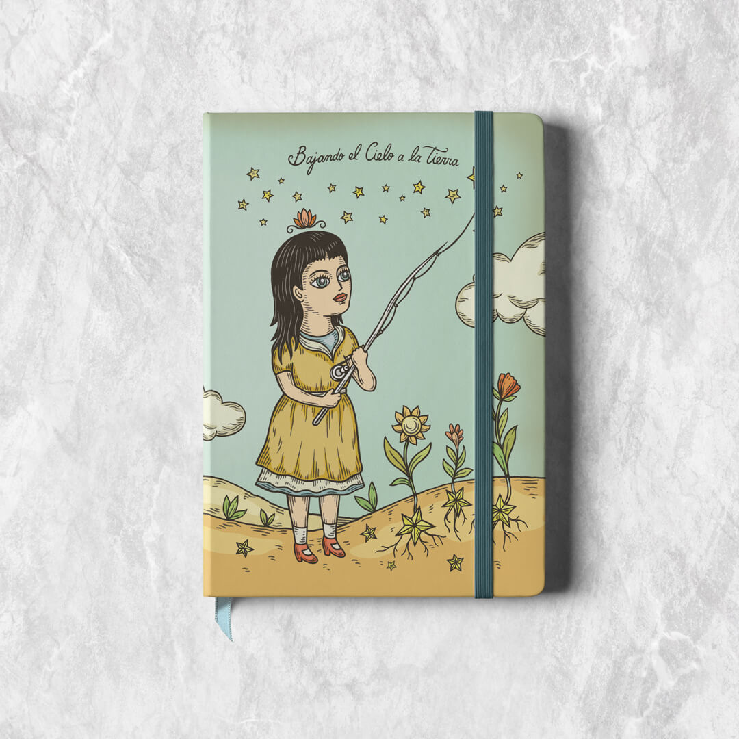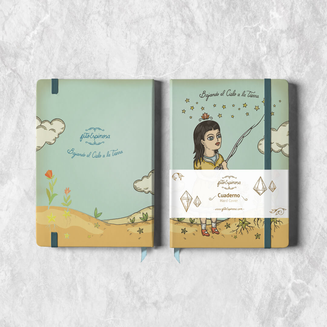 Libreta tapa dura tamaño A5, elaborado con papel avena fino de 85 grms, elástico marcador y 200 páginas interiores en blanco ideales para escribir o dibujar. Las dos primeras páginas incluyen un encabezado de Fito Espinosa, así como una ilustración a full color en exteriores. Basado en la ilustración “Bajando” de Fito Espinosa.