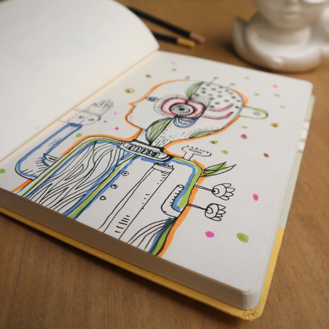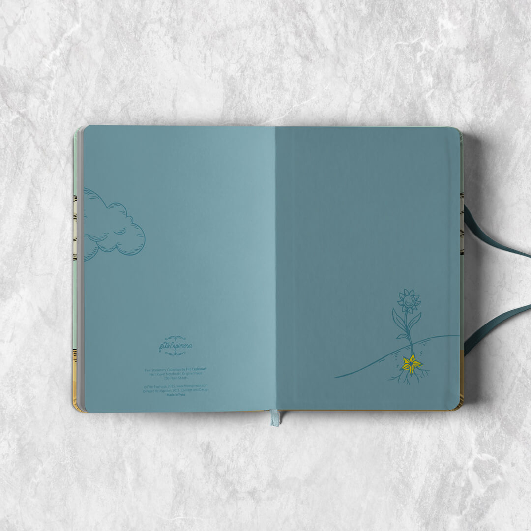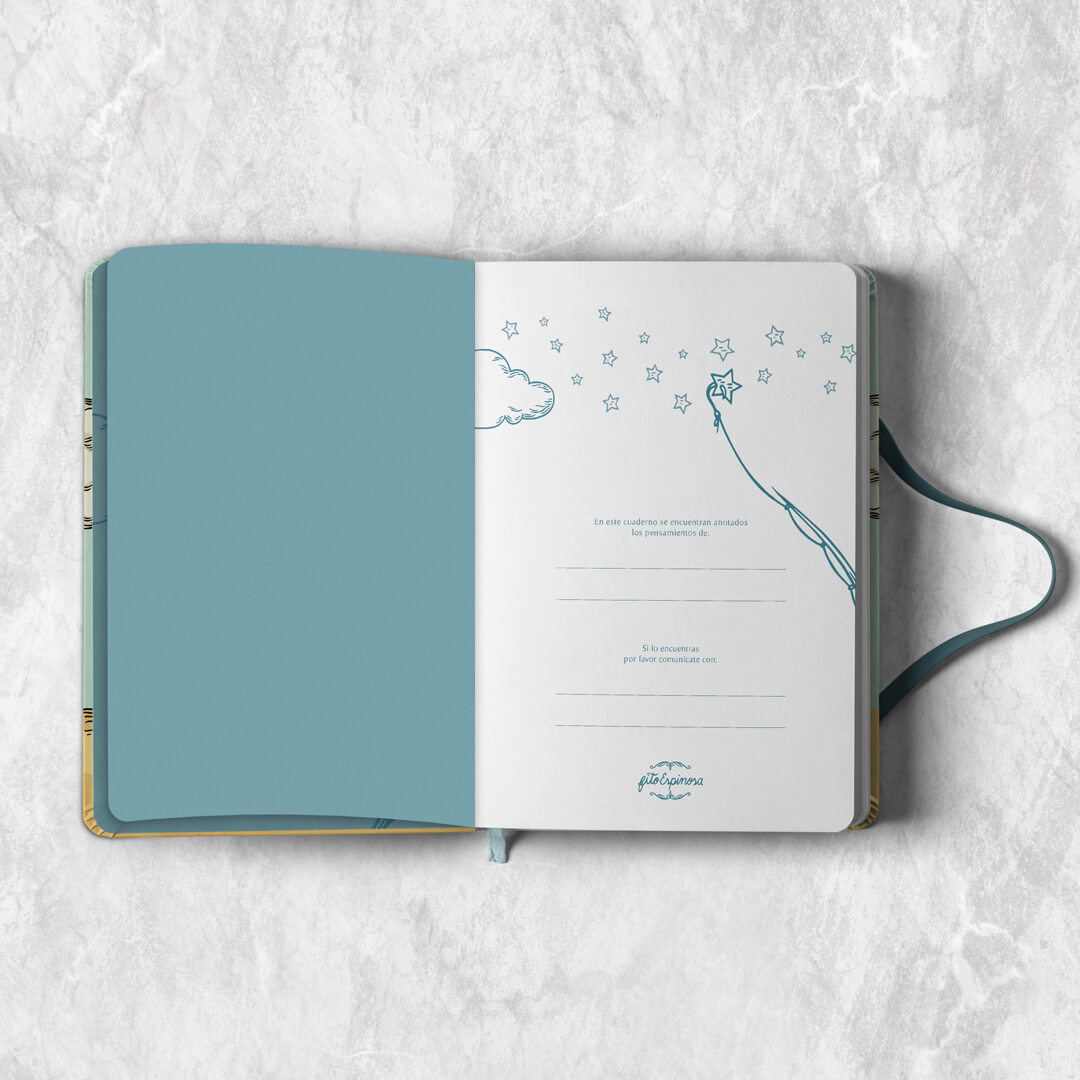 Libreta tapa dura tamaño A5, elaborado con papel avena fino de 85 grms, elástico marcador y 200 páginas interiores en blanco ideales para escribir o dibujar. Las dos primeras páginas incluyen un encabezado de Fito Espinosa, así como una ilustración a full color en exteriores. Basado en la ilustración “Bajando” de Fito Espinosa.