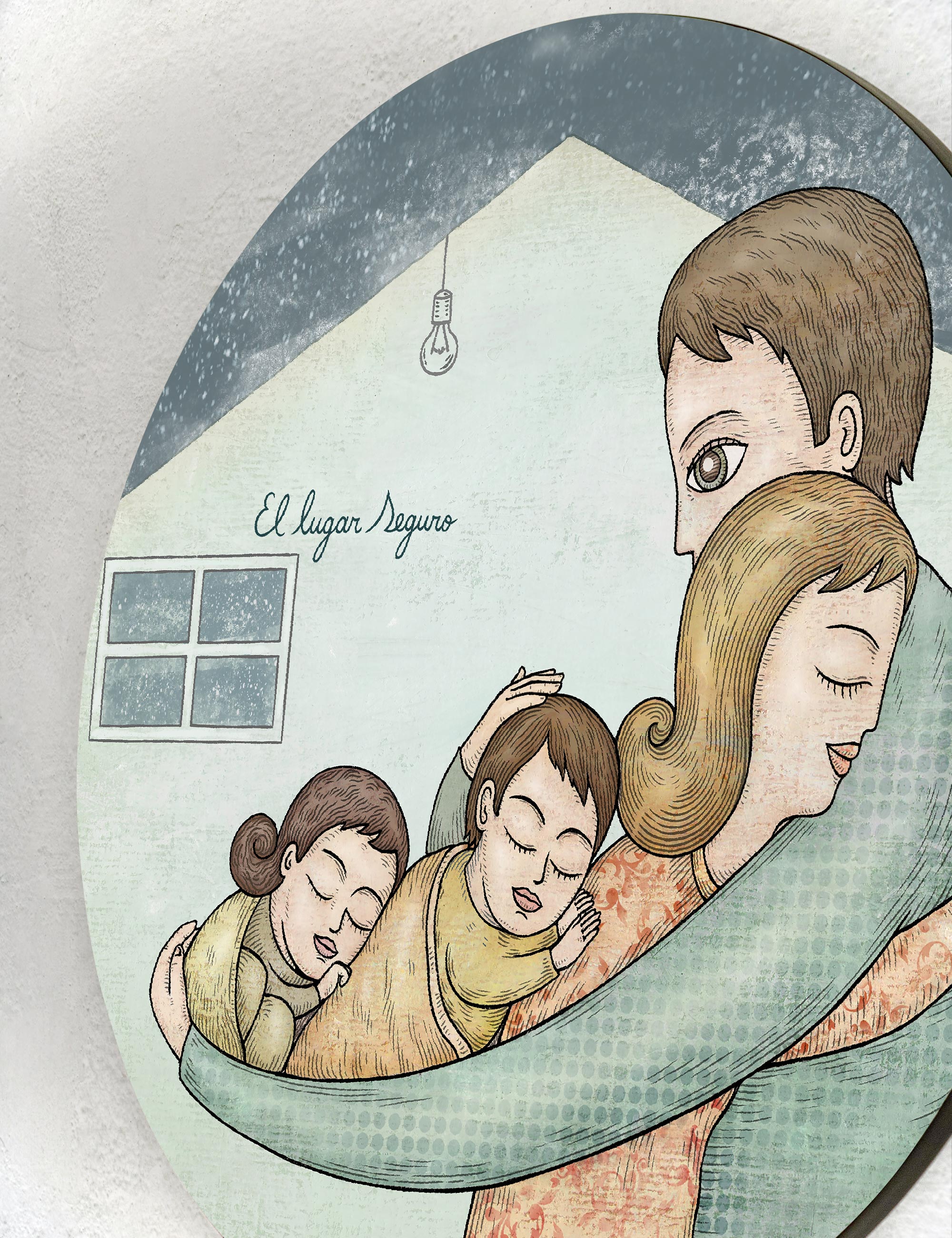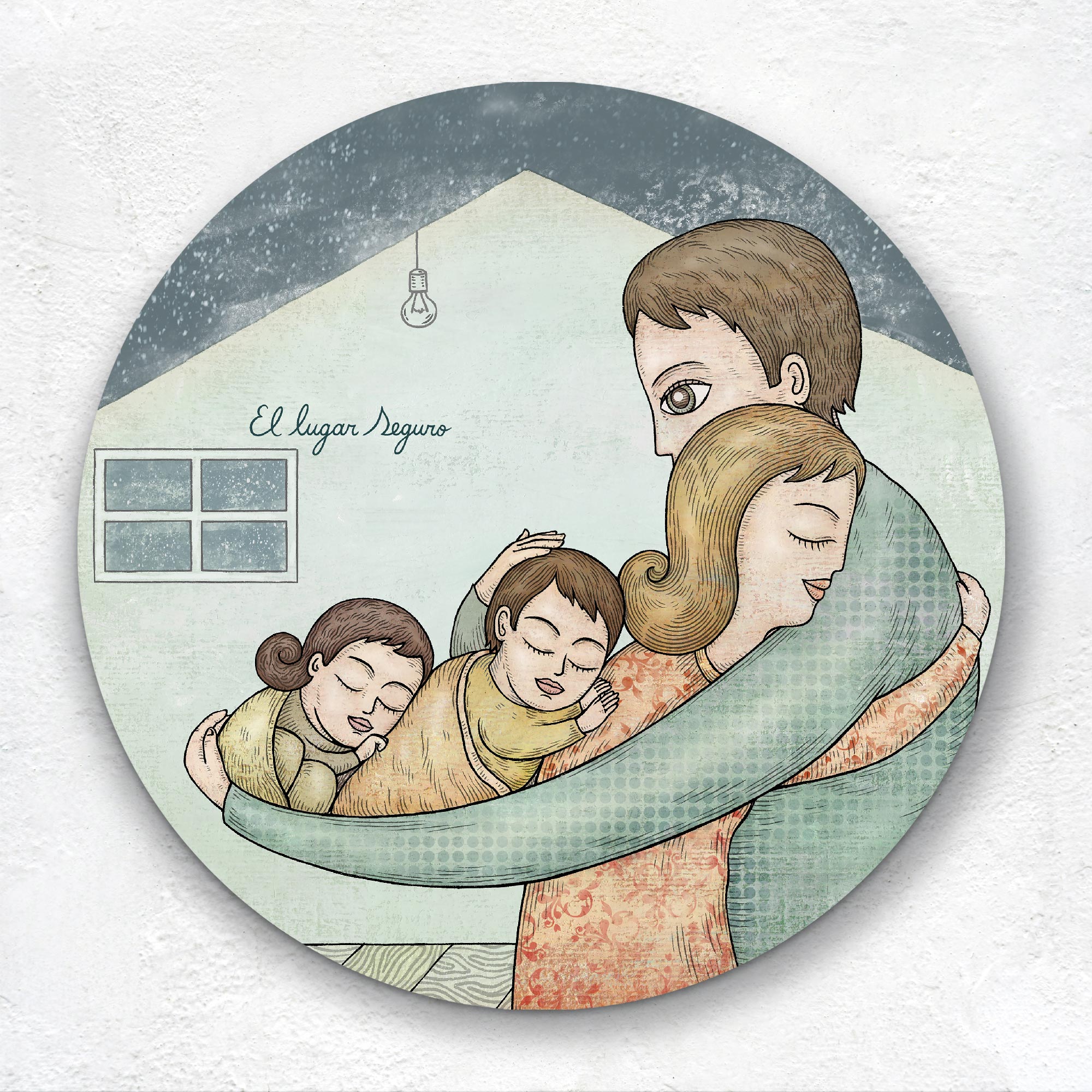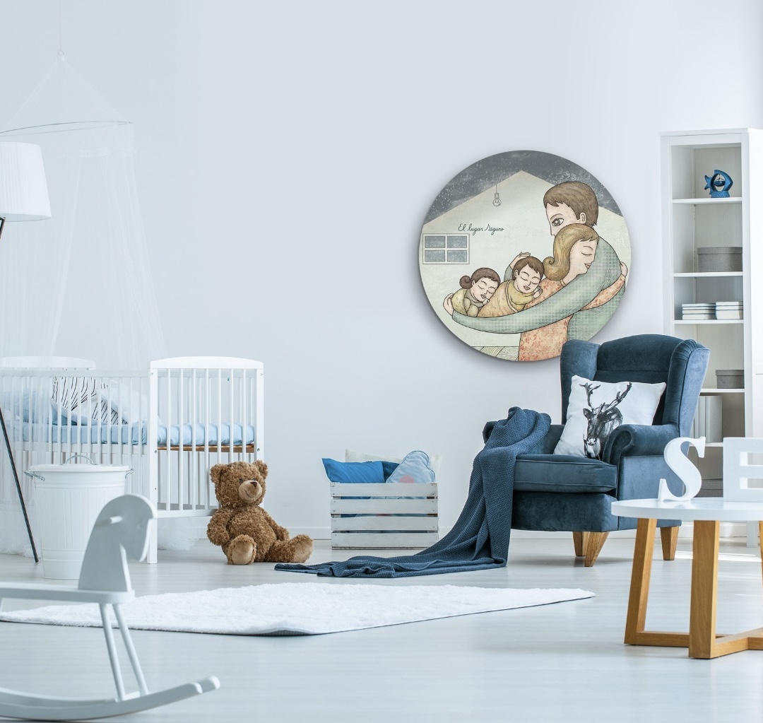 Grabado “Lugar Seguro” en su versión circular, trabajado sobre madera, bañado en resina. Formato elegante que aporta a los espacios el brillo natural y reflejo a manera de espejo.
