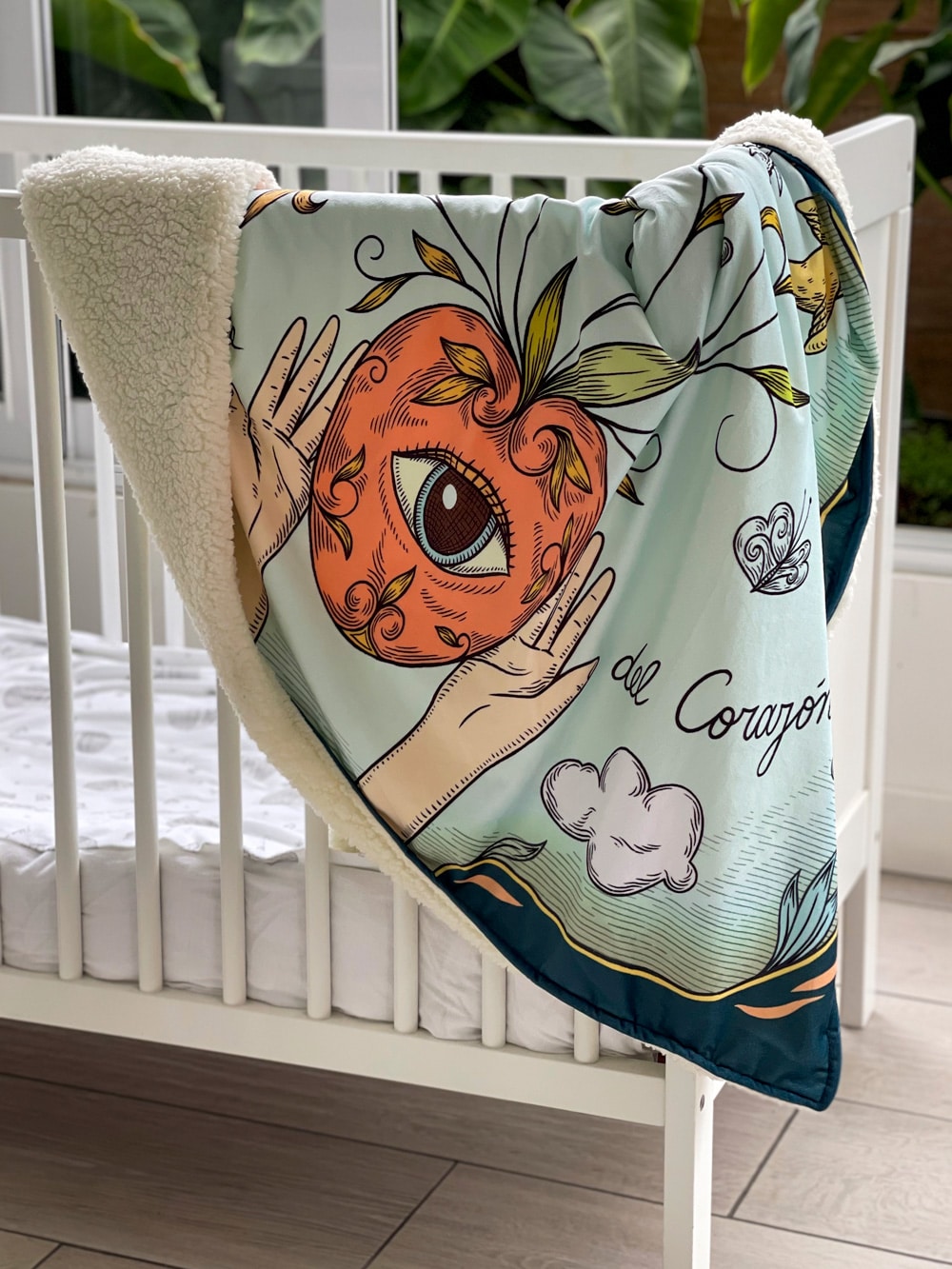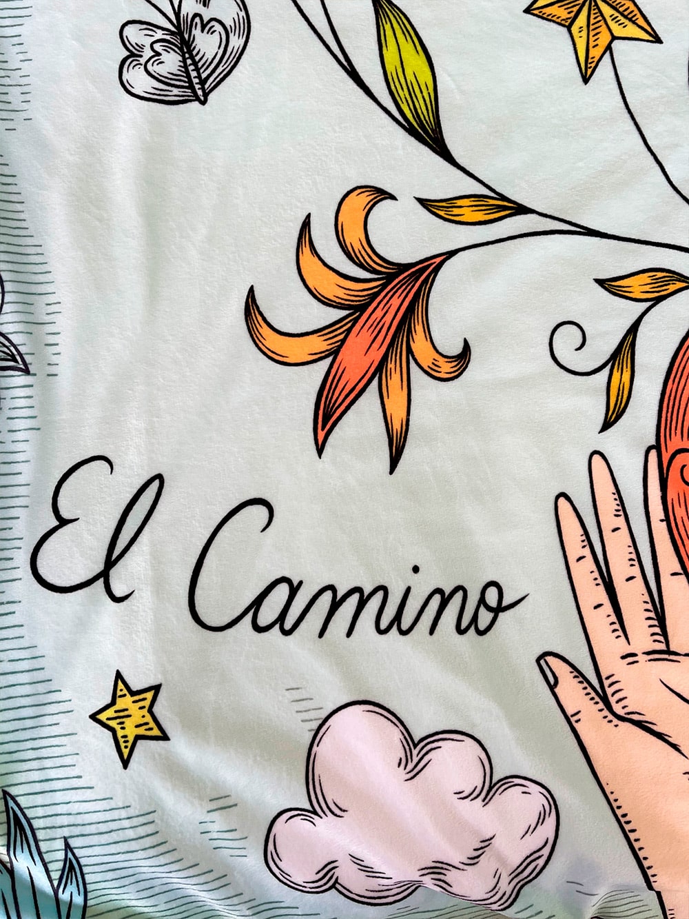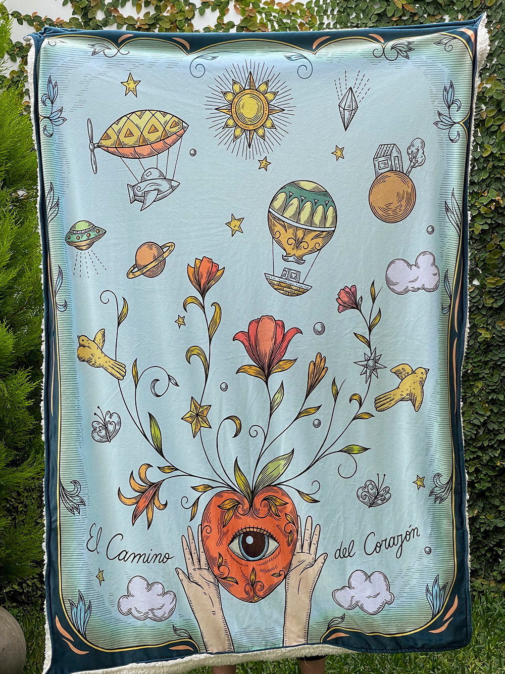 Manta Ilustrada “Camino del Corazón”. Pieza textil de Edición Limitada, confeccionada en suave tela plush y polar cordero. Un abrigo ligero y útil para cualquier temporada.