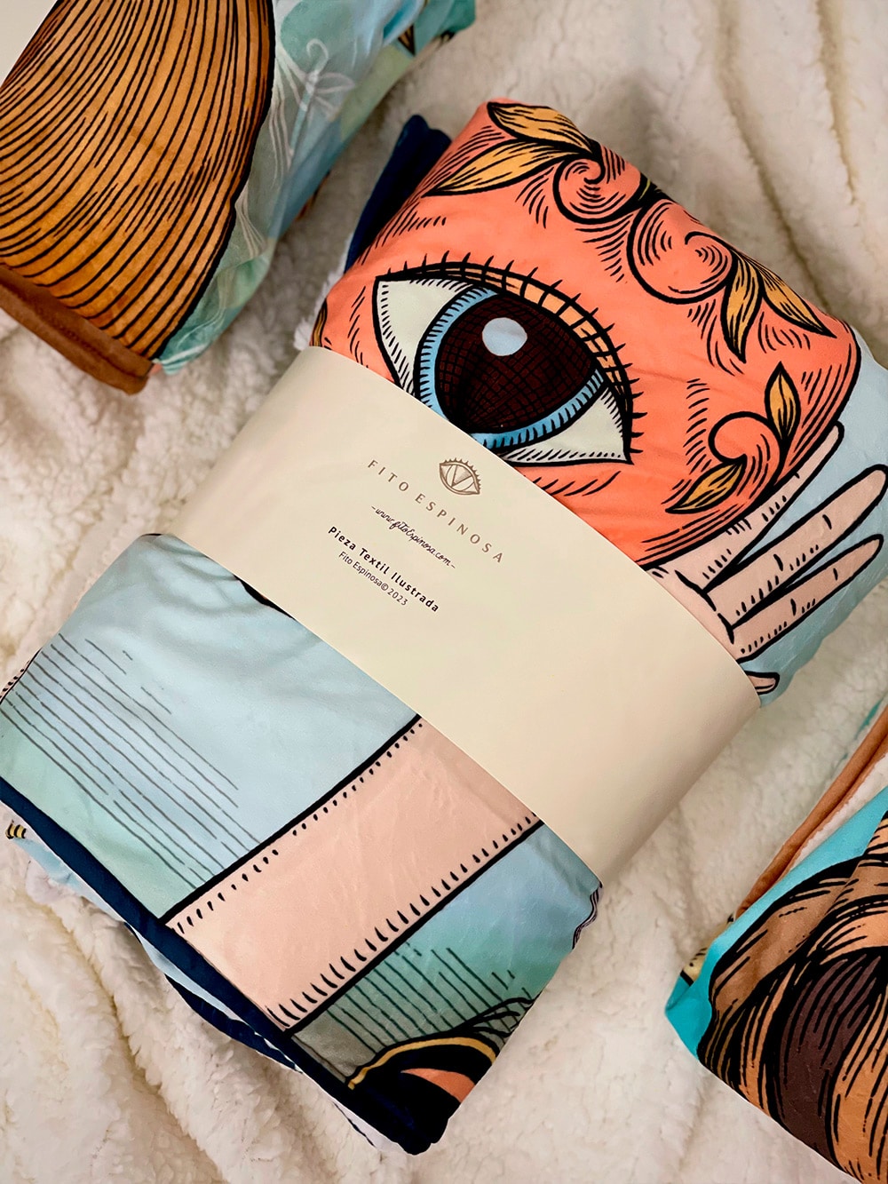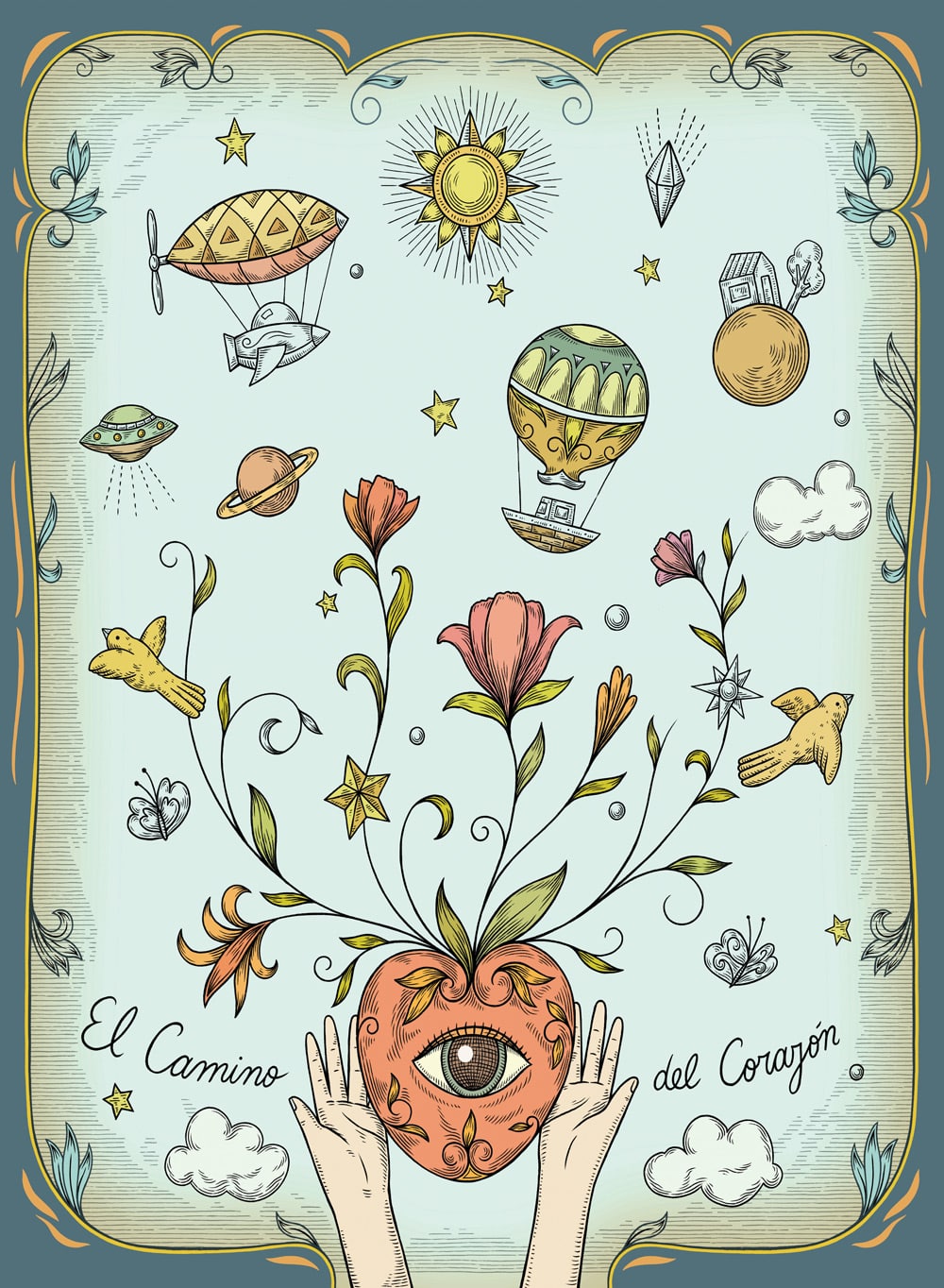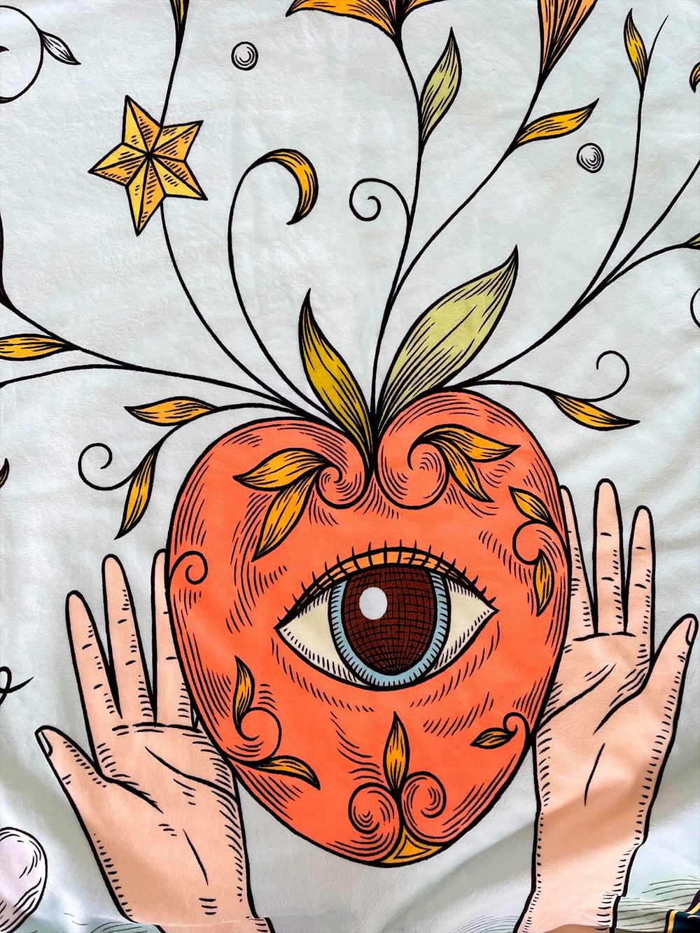 Manta Ilustrada “Camino del Corazón”. Pieza textil de Edición Limitada, confeccionada en suave tela plush y polar cordero. Un abrigo ligero y útil para cualquier temporada.