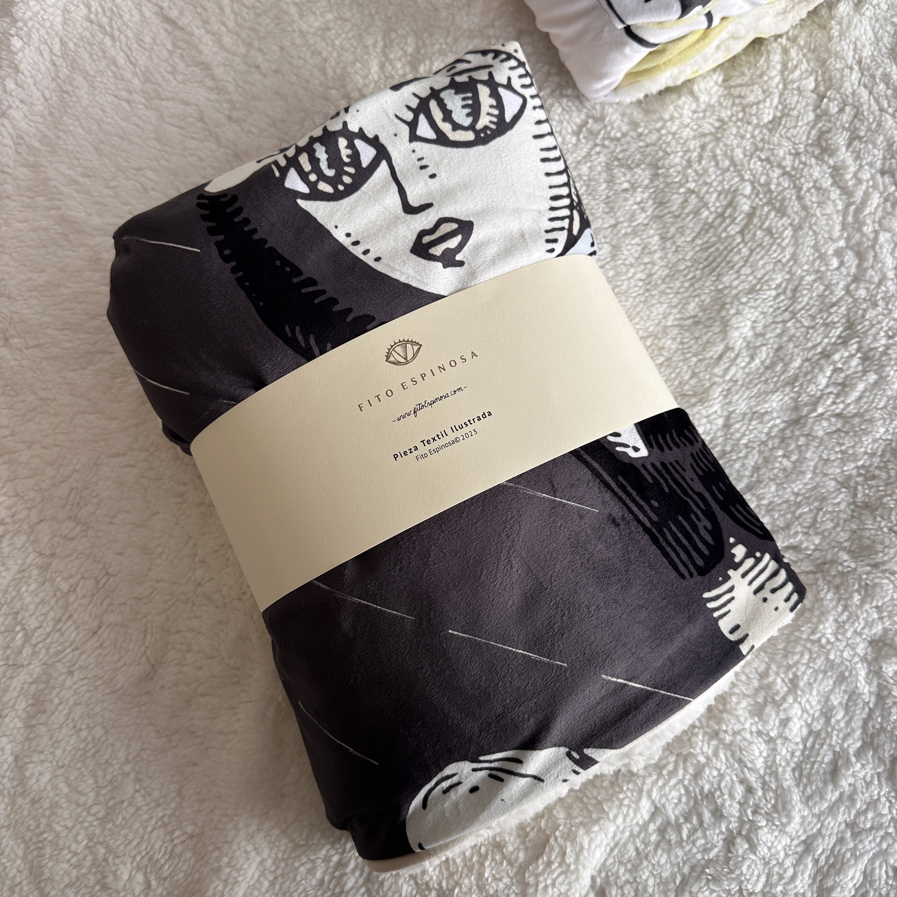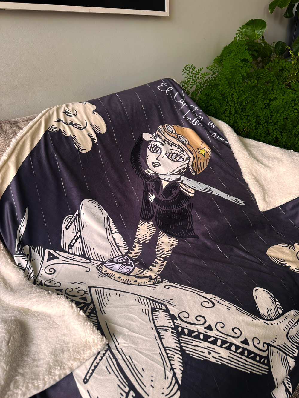 Manta Ilustrada “El Capitán”. Pieza textil de Edición Limitada, confeccionada en suave tela plush y polar cordero. Un abrigo ligero y útil para cualquier temporada.
