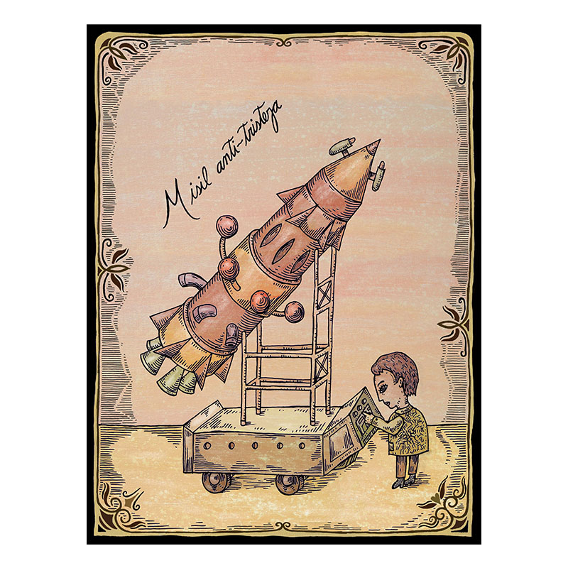 Este ejemplar es un grabado Giclée de edición limitada original de Fito Espinosa que forma parte de la serie “Máquinas”. Las ilustraciones aquí reunidas son algunas de las más antiguas, concebidas por el artista en su afán por inventar herramientas útiles como nuevas maneras de vivir en el mundo.