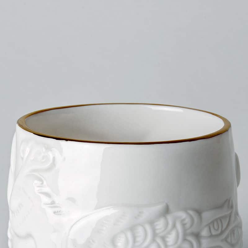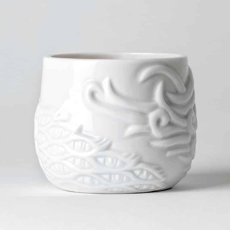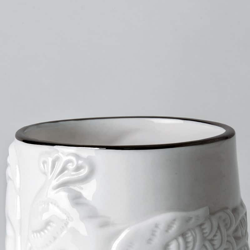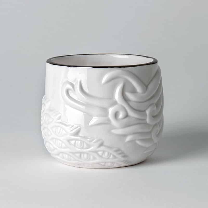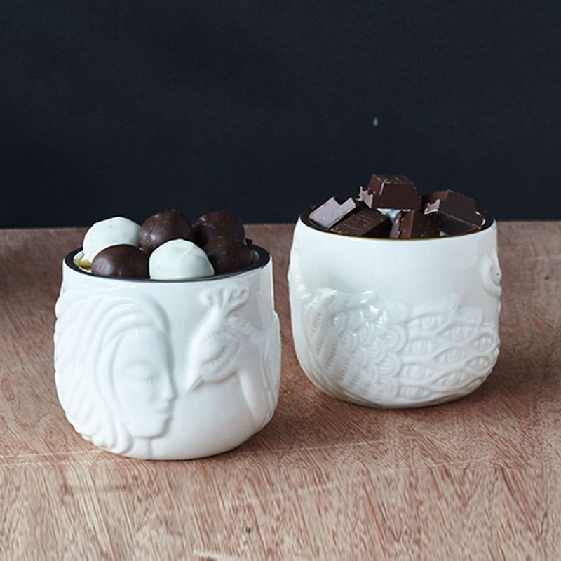 Mug o taza de tamaño grande, ideal para te o café largo. Inspirado en la ilustración “Ave Real” de Fito Espinosa, representa el encuentro de una mujer y un pavo real como símbolo de sabiduría. Está hecho a mano en porcelana brillante y horneado a altas temperaturas.