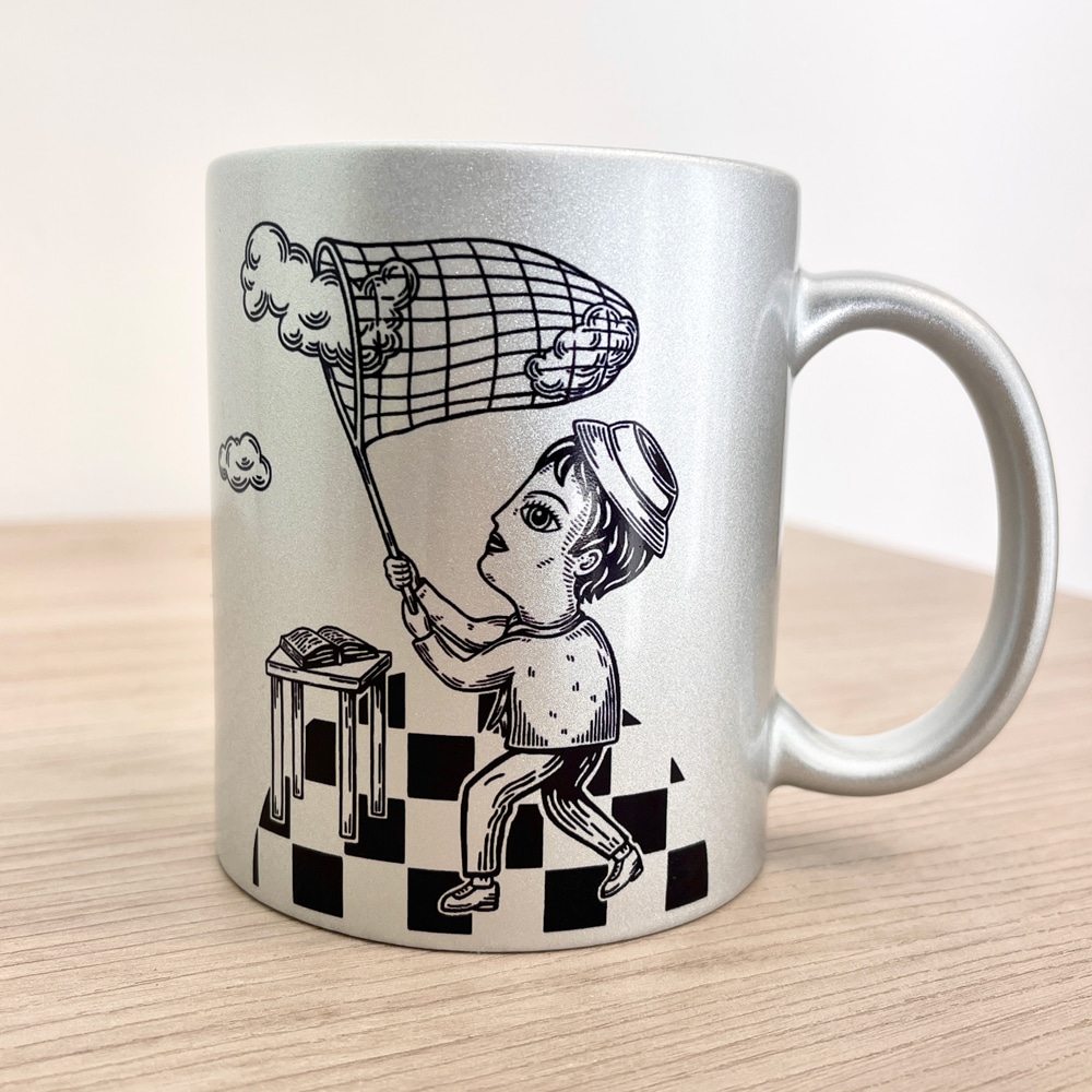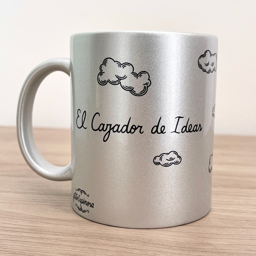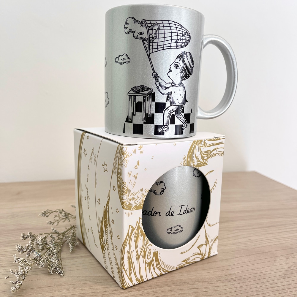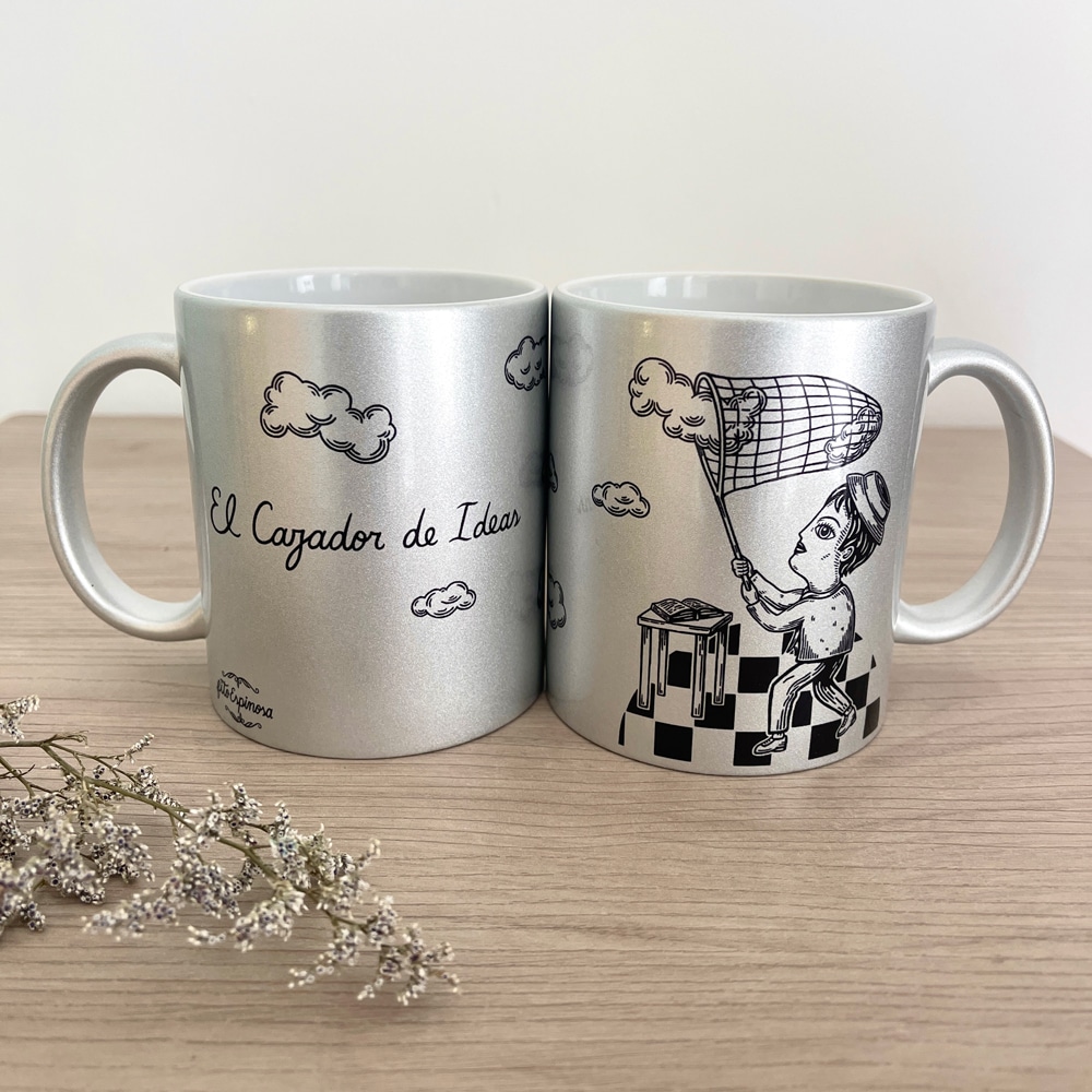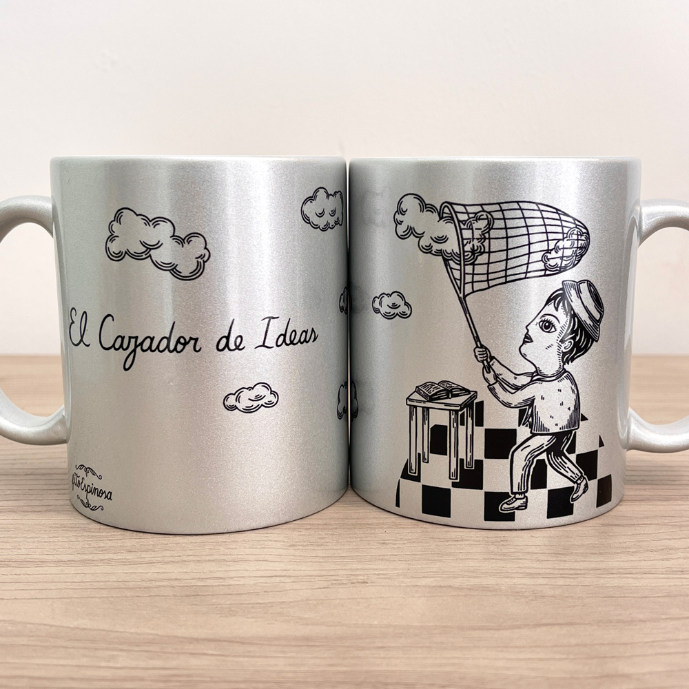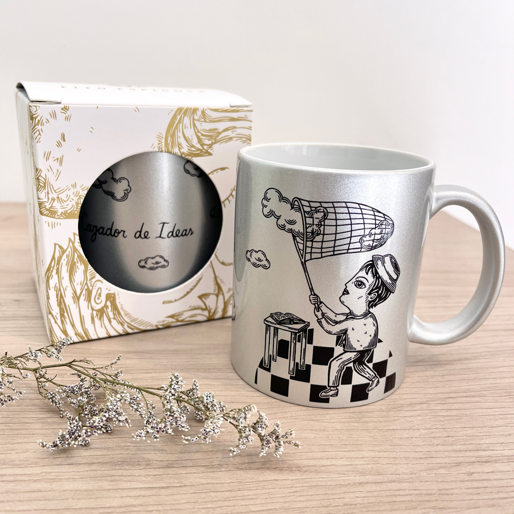 Mug ilustrado de cerámica, con fondo plata y acabado brillante. Diseño inspirado en la ilustración “Cazador de Ideas” de Fito Espinosa. Ideal para infusiones, café o tu bebida favorita. Apto para microondas.