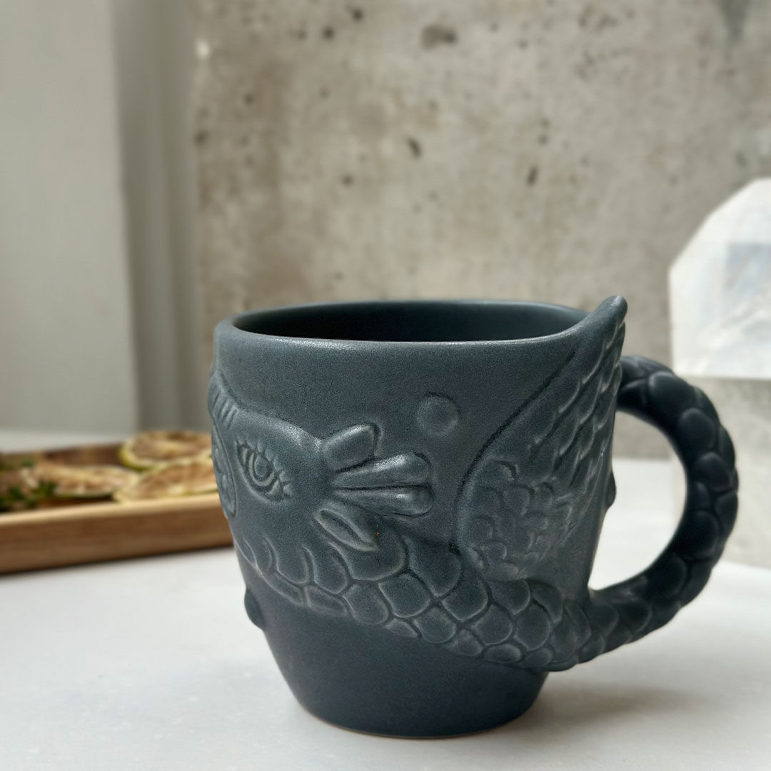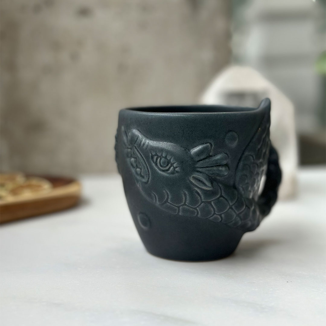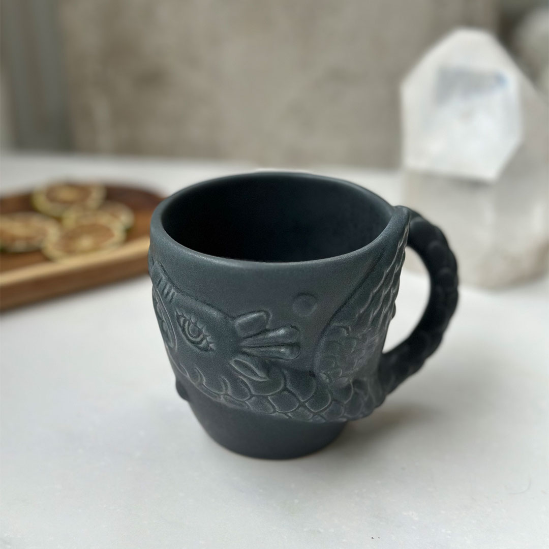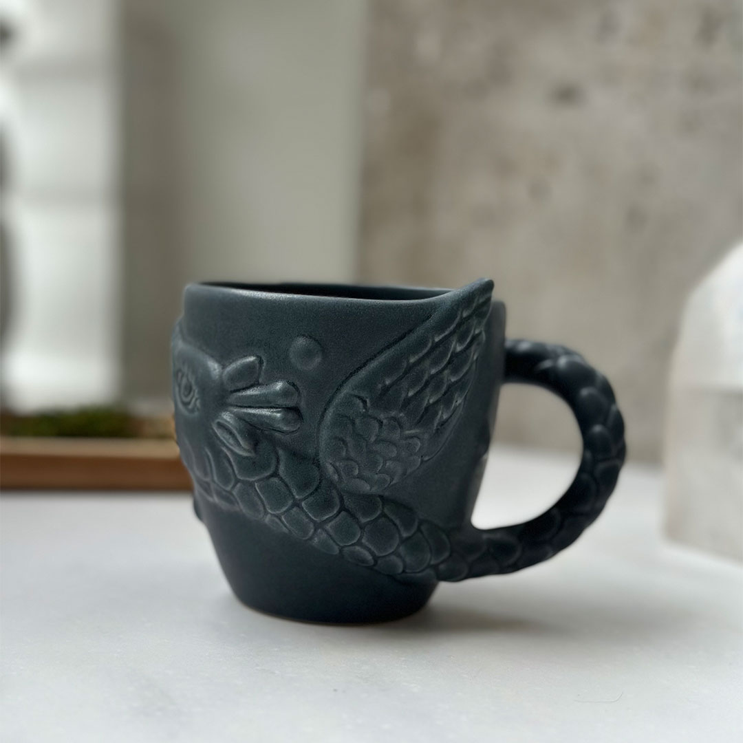 Mug escultórico de tamaño grande, ideal para té o café largo. Una representación de Fito Espinosa del Dragón que simboliza el poder espiritual supremo, el poder terrenal y celestial, el conocimiento y la fuerza.