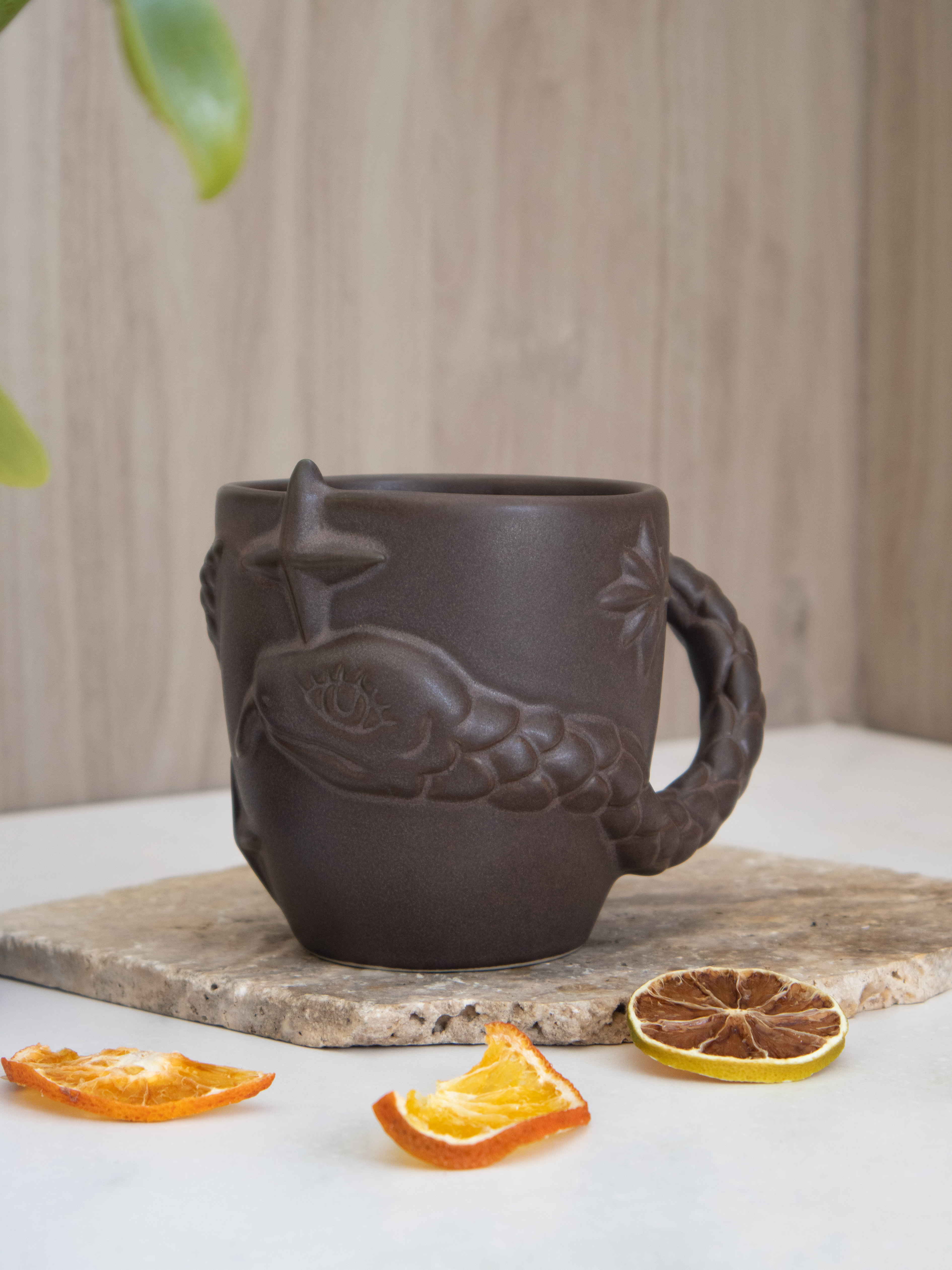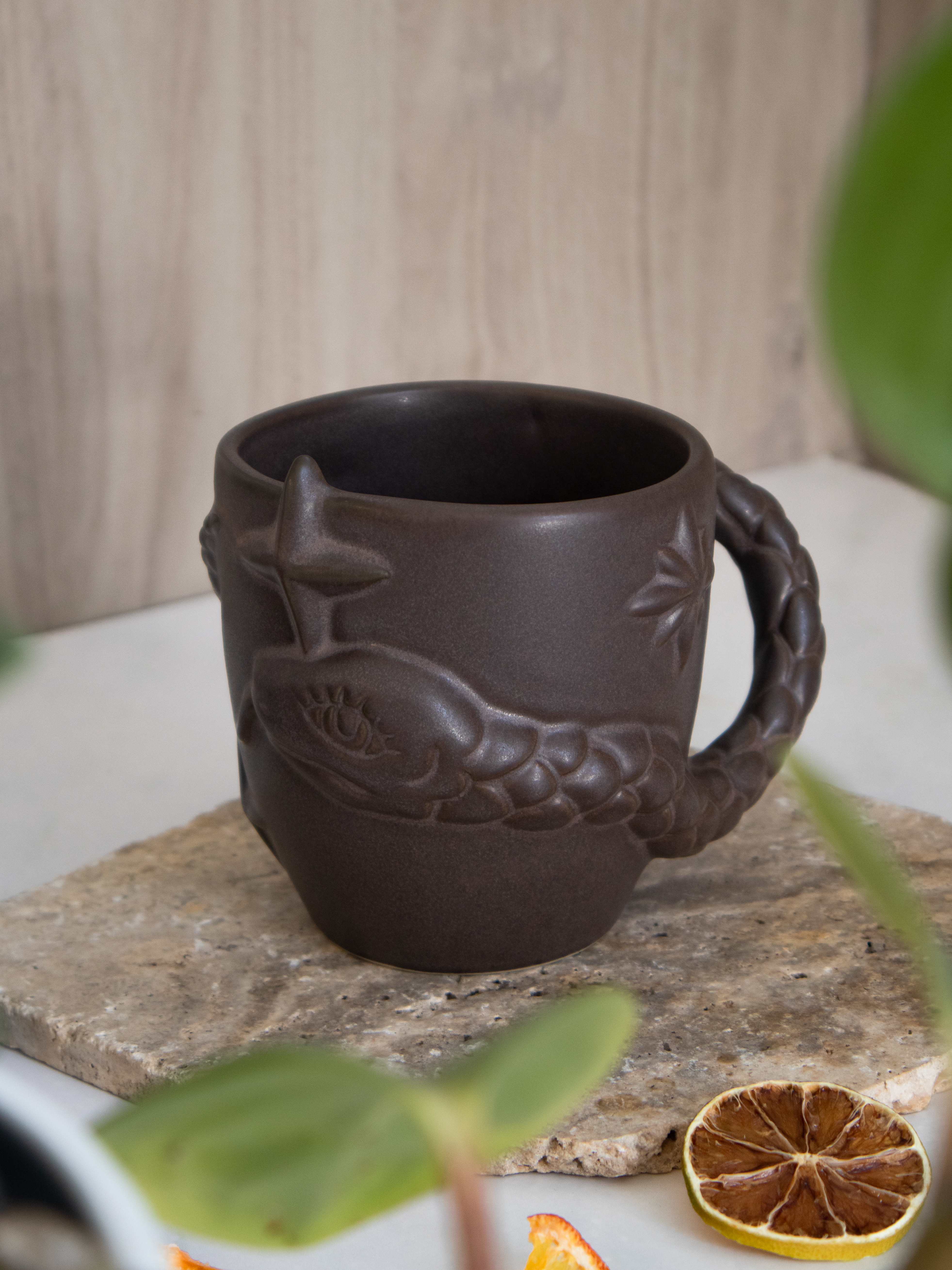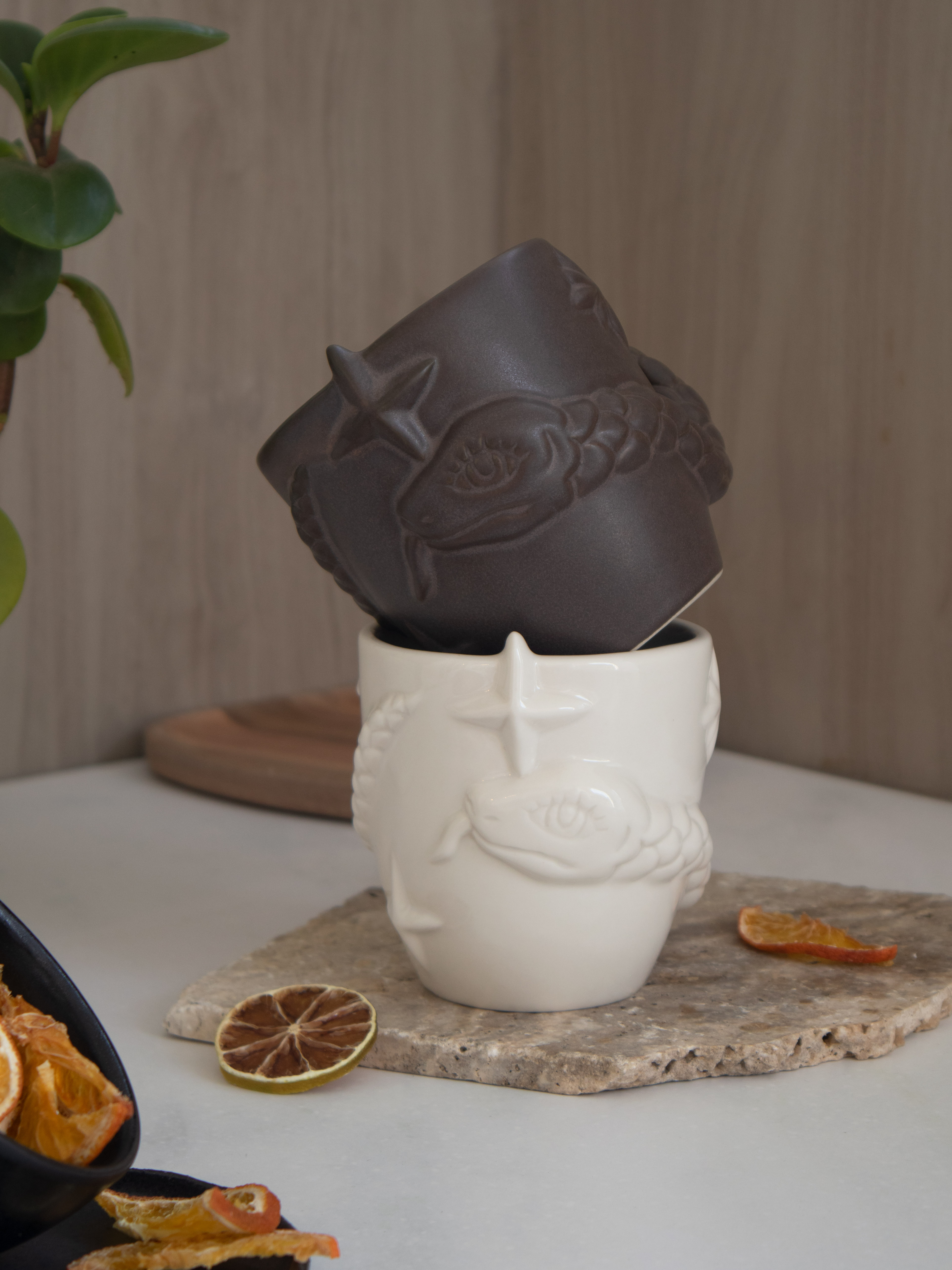 Mug escultórico de tamaño grande, ideal para té o café largo. Una representación de Fito Espinosa de la Serpiente 𓆓 y la energía vital de este símbolo milenario que nos impulsa a la transformación, la muerte y el renacimiento.