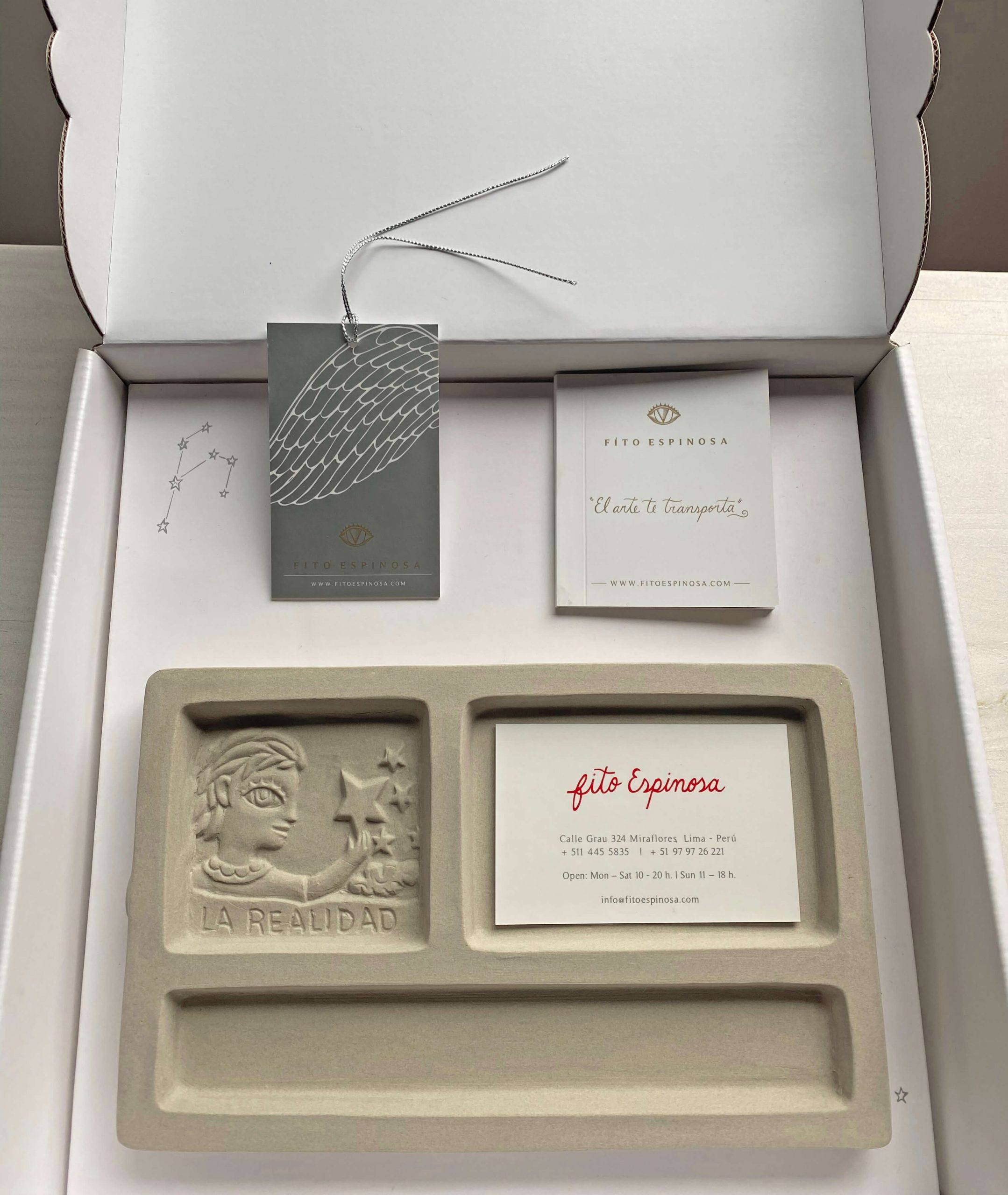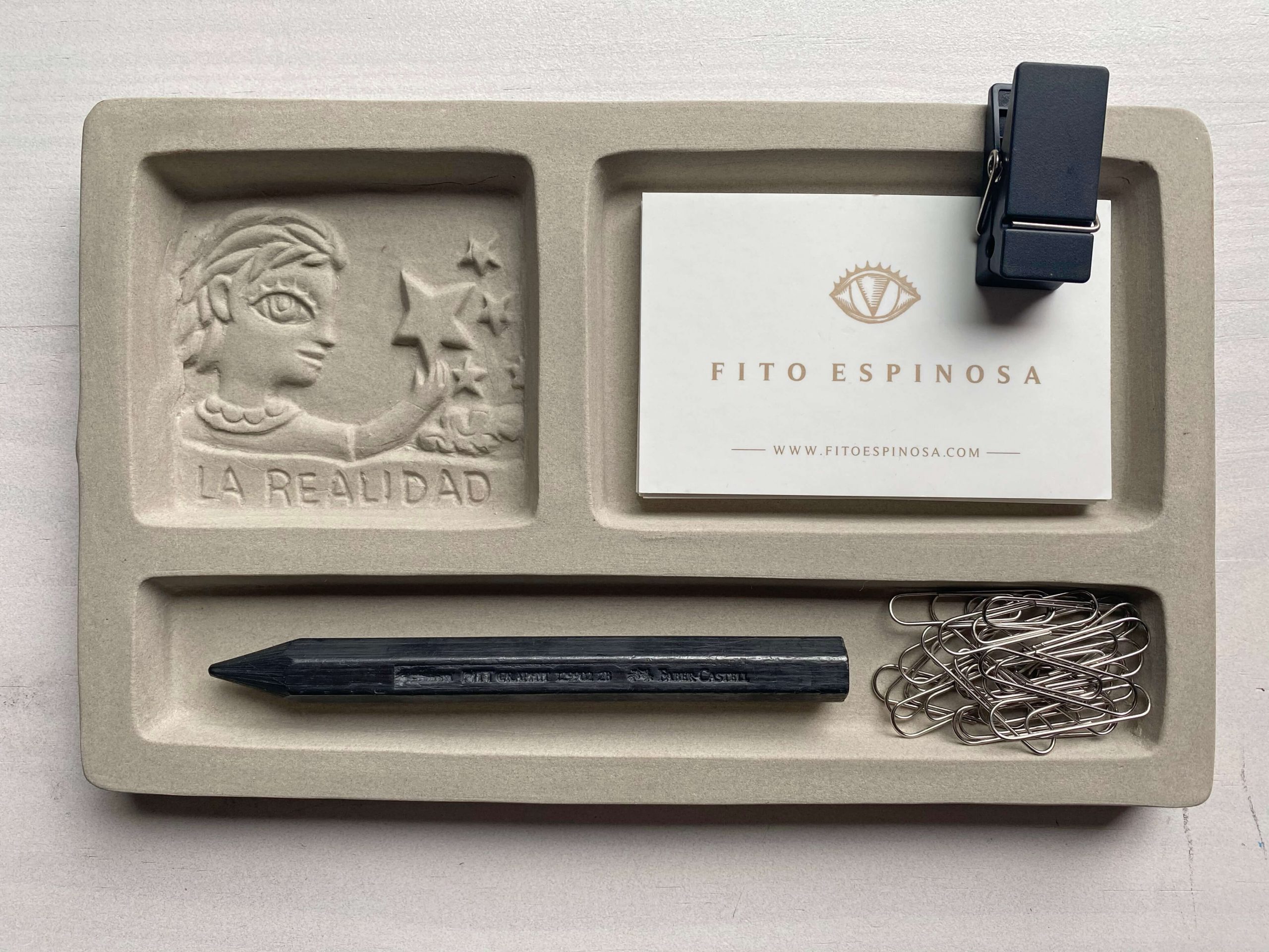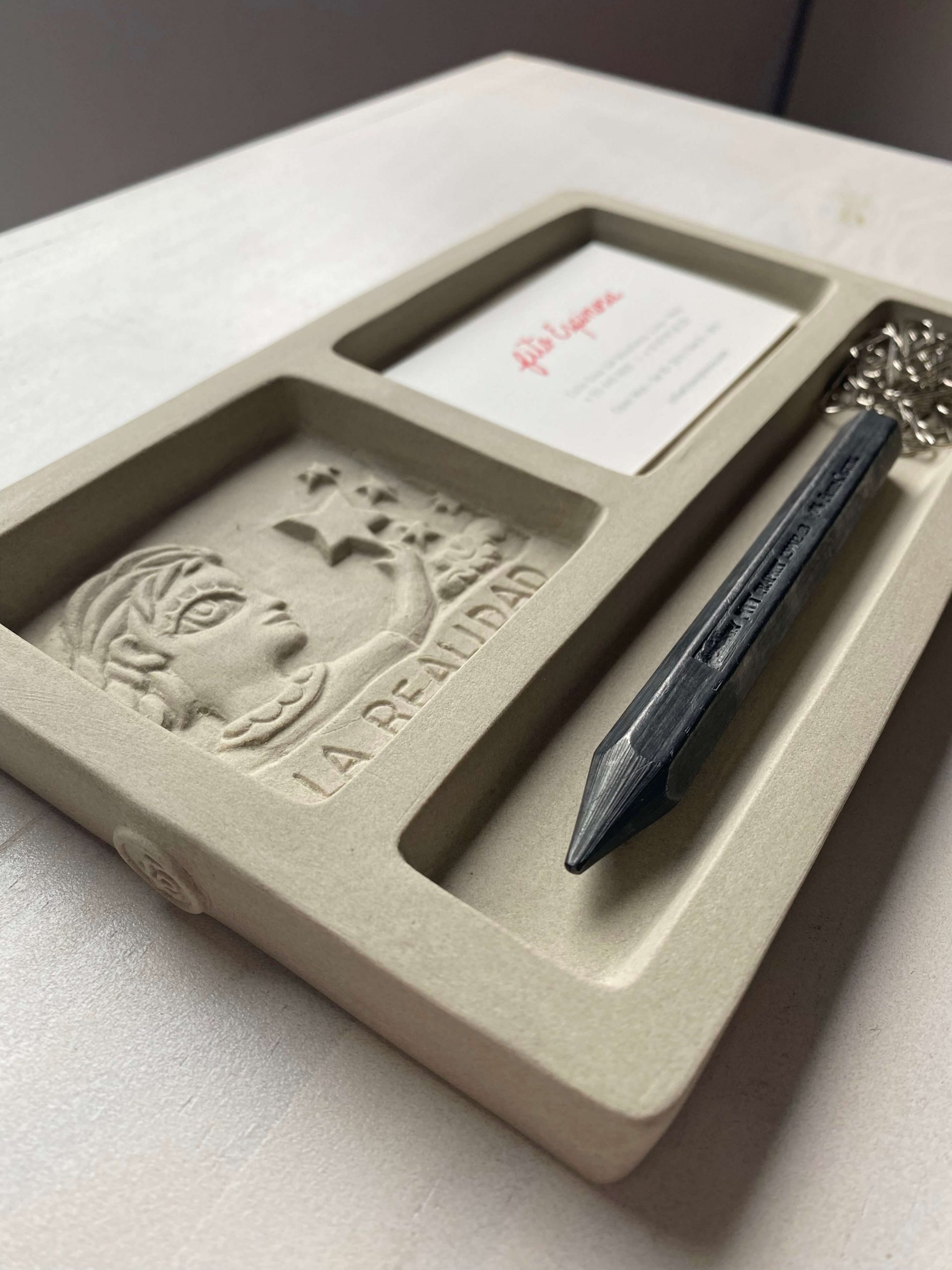 Organizador de escritorio lineal, de forma rectangular con compartimentos para tarjetas personales y lapiceros, accesorios o clips. Elaborada en gres natural, modelada en bajo y alto relieve y horneada a altas temperaturas. Elemento práctico y elegante adecuado para cualquier estilo de escritorio u oficina.