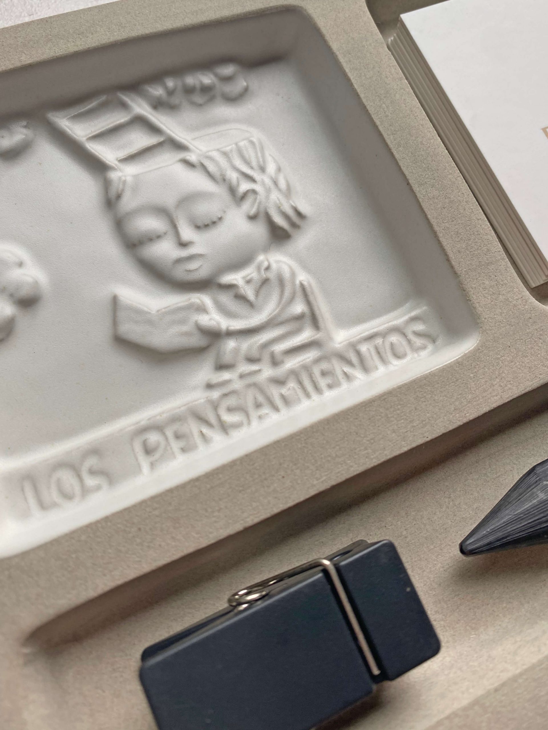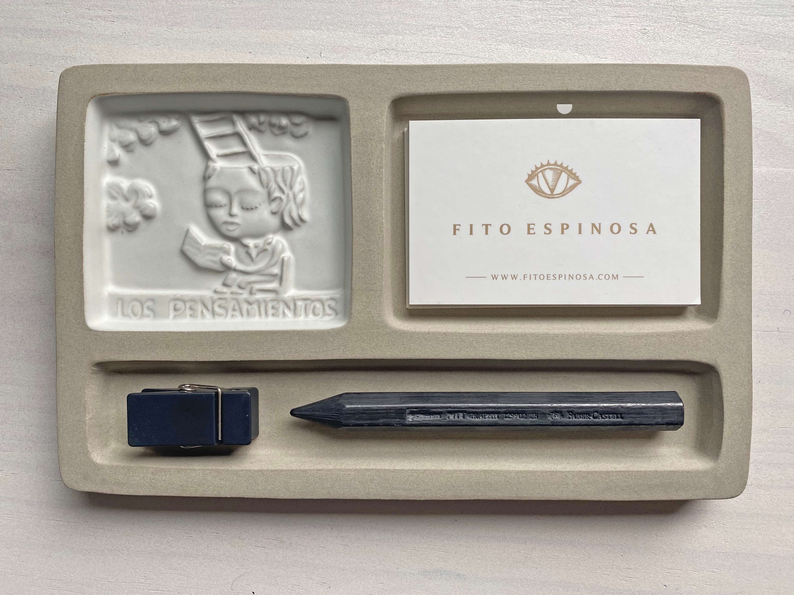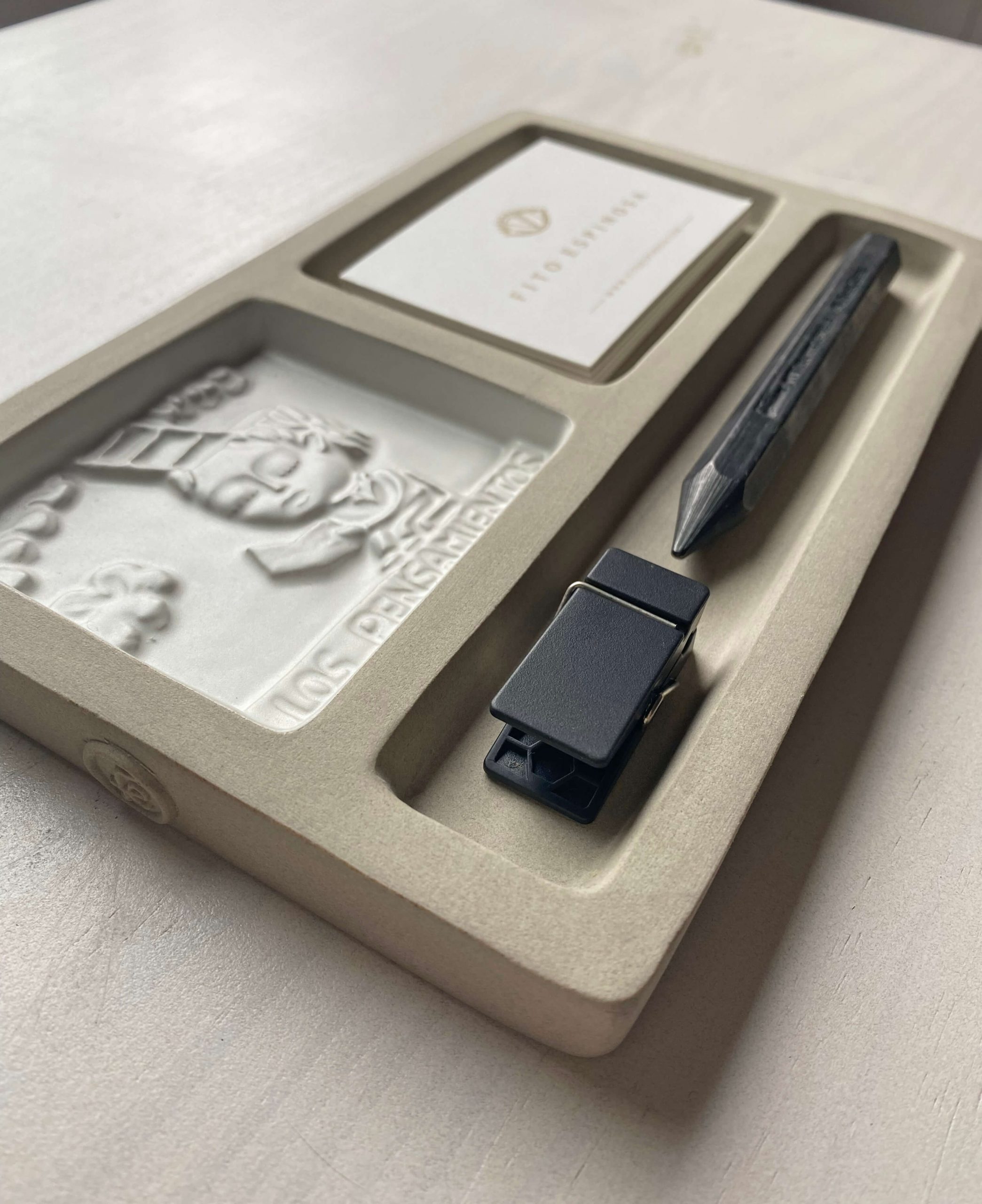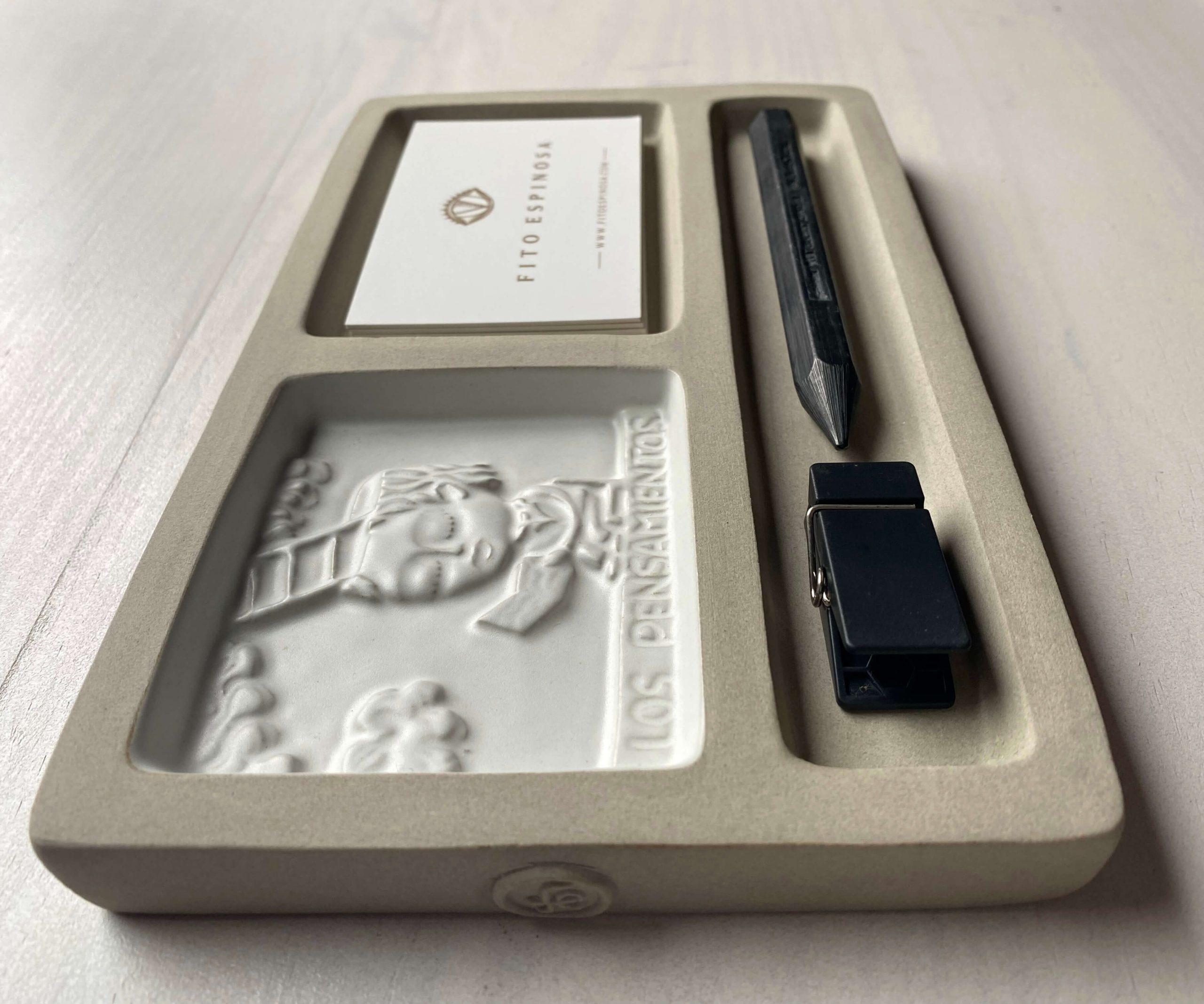 Organizador de escritorio lineal, de forma rectangular con compartimentos para tarjetas personales y lapiceros, accesorios o clips. Elaborada en gres natural, modelada en bajo y alto relieve y horneada a altas temperaturas. Elemento práctico y elegante adecuado para cualquier estilo de escritorio u oficina.