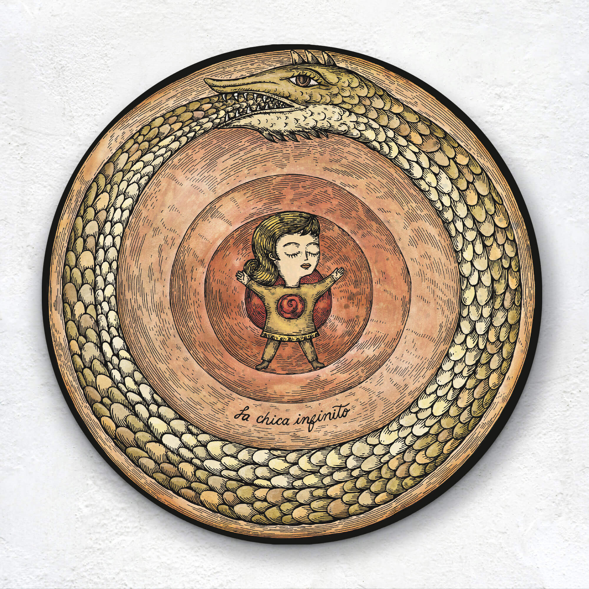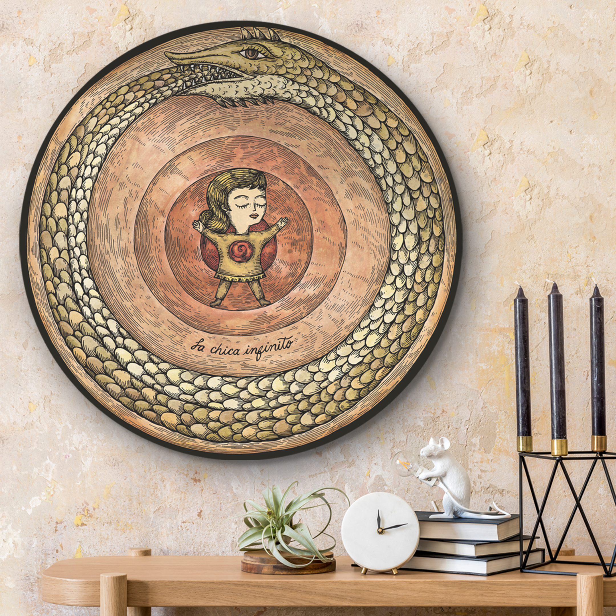 Grabado “Ouroboros” en su versión circular, trabajado sobre madera, bañado en resina, marco plata y moldura de 4 cm. Formato elegante que aporta a los espacios misticismo con el brillo natural y reflejo de una gema.