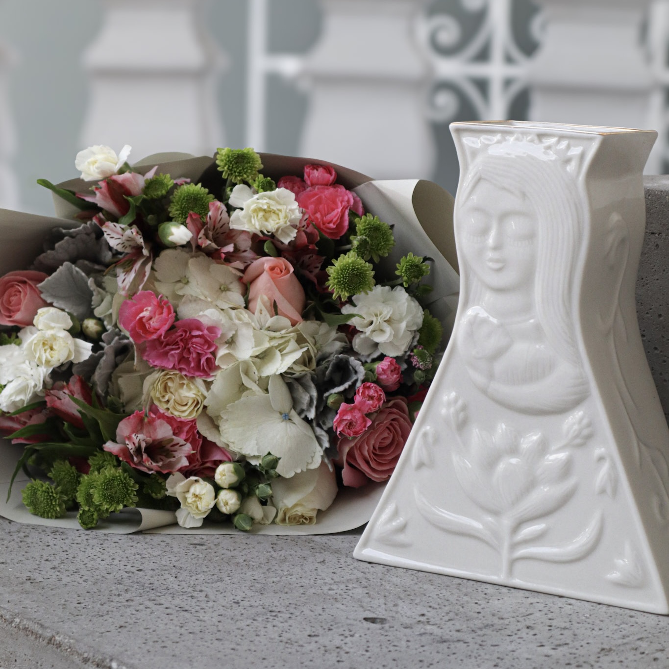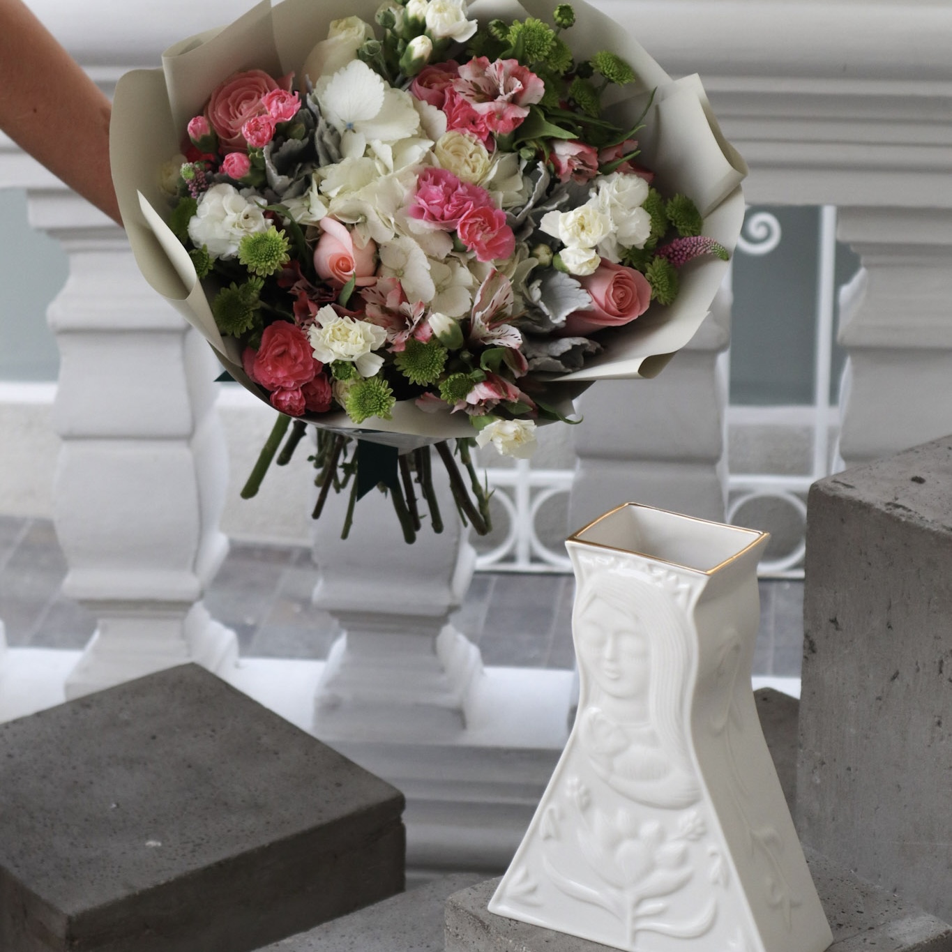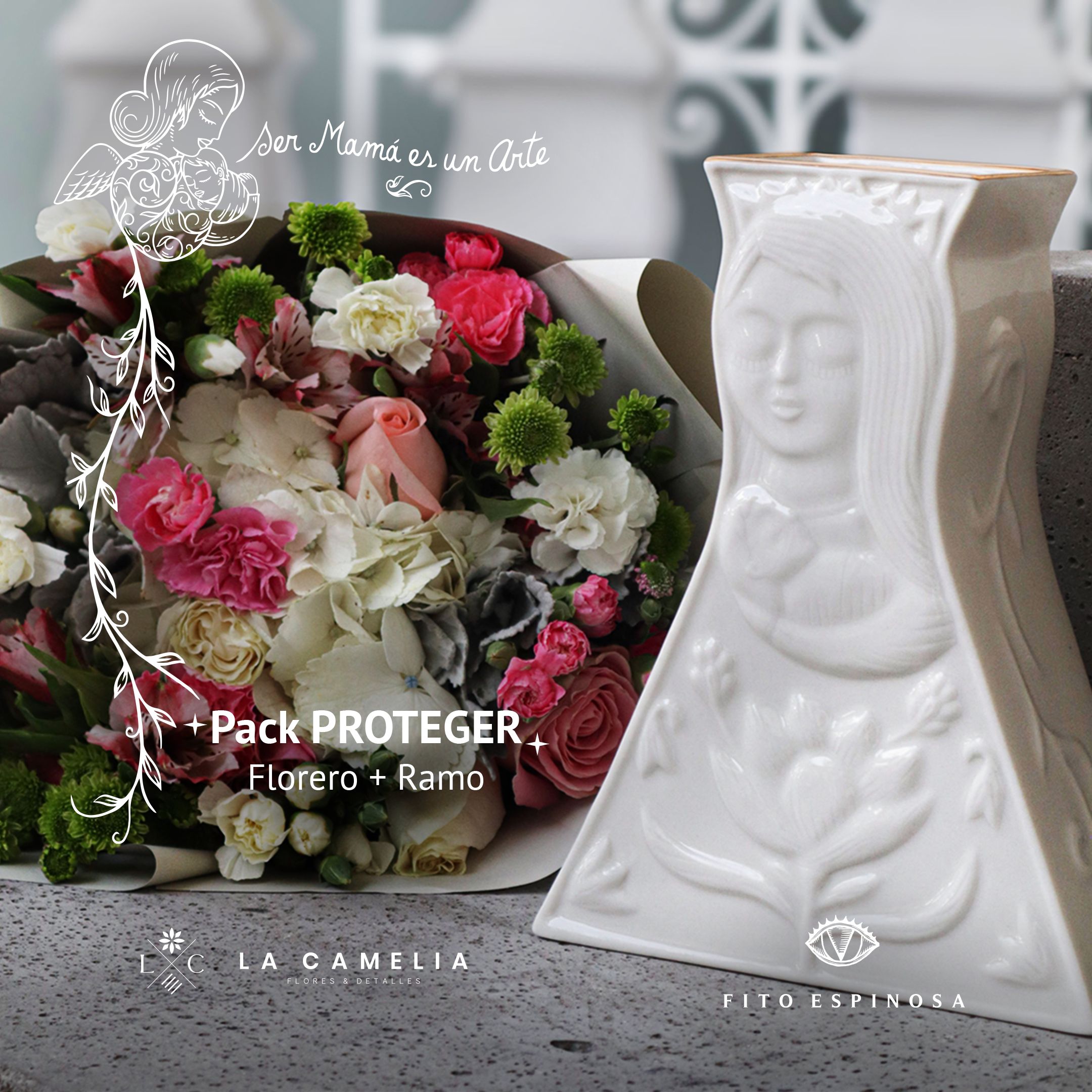 Pieza que representa la protección de mamá, acompañada de este hermoso ramo de tamaño mediano.