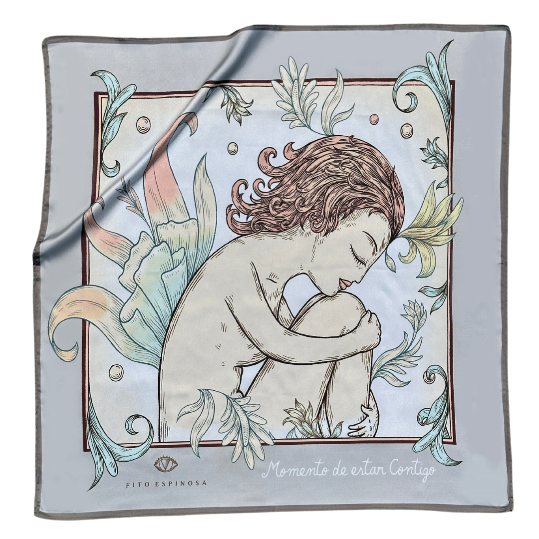 Este pañuelo de edición limitada lleva la ilustración “Contigo” de Fito Espinosa. La pieza ha sido elaborada a mano en Seda 100% Poliester. Viene en una linda caja como para regalo y es ideal dar un toque artístico y original a tu look.