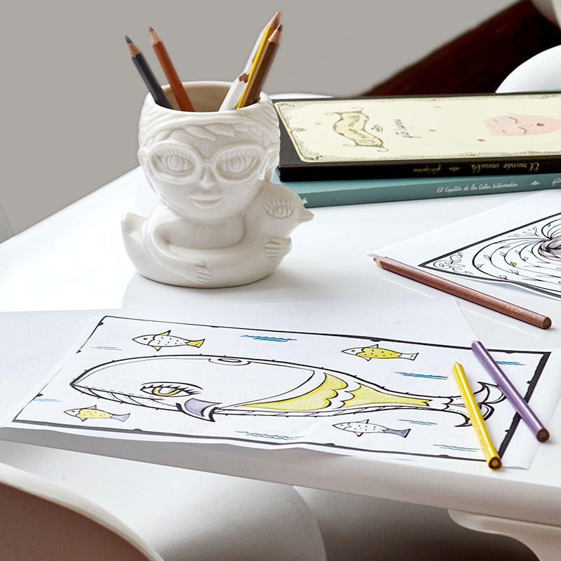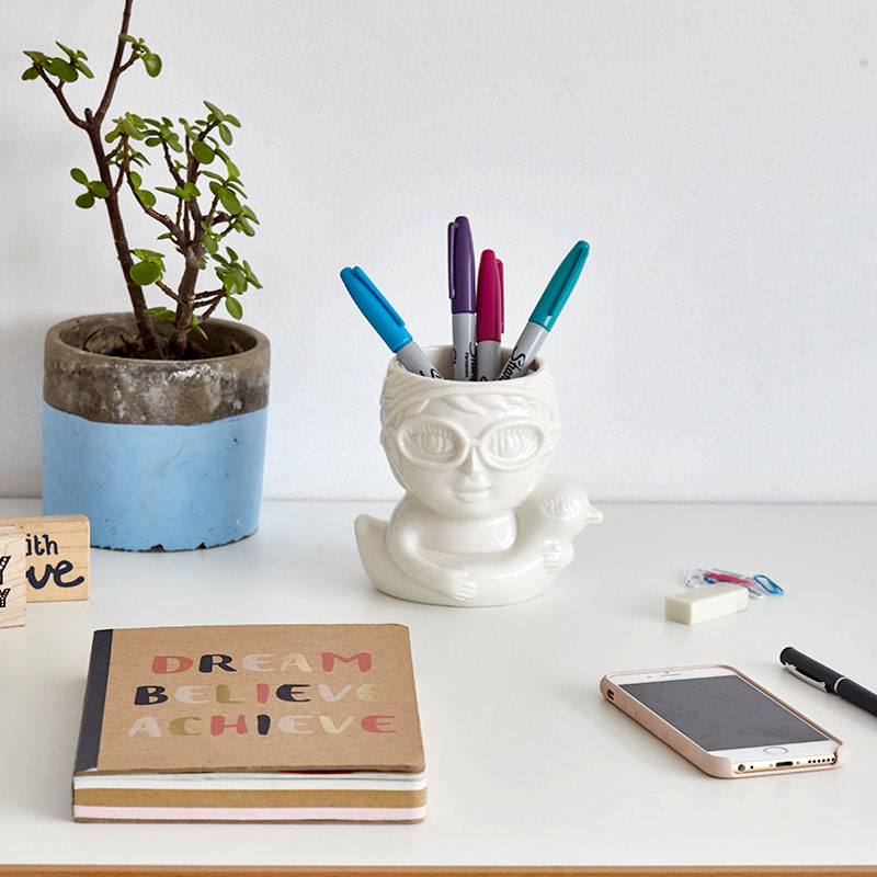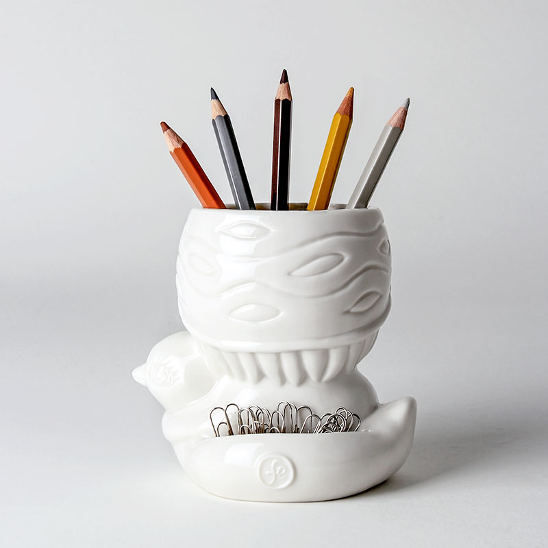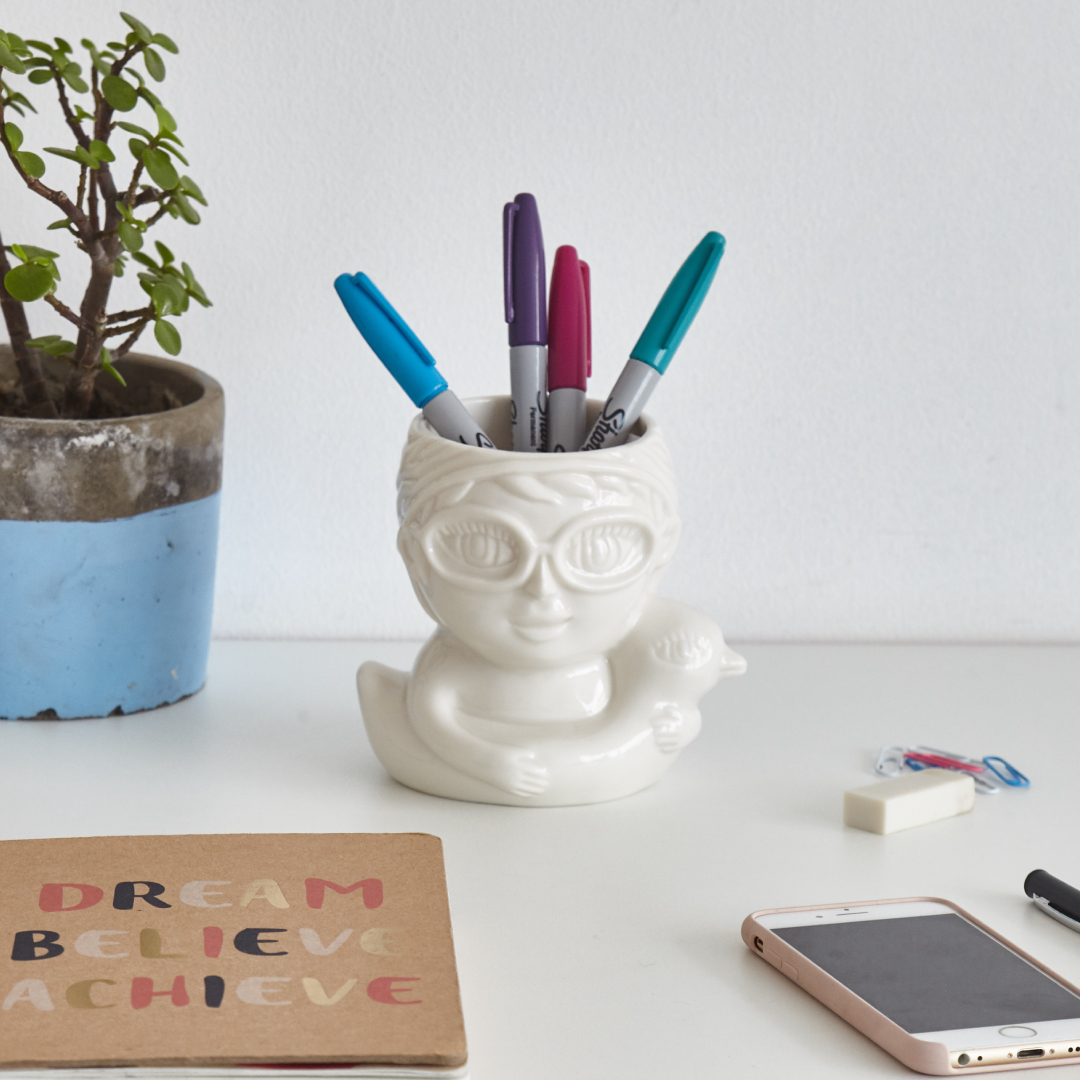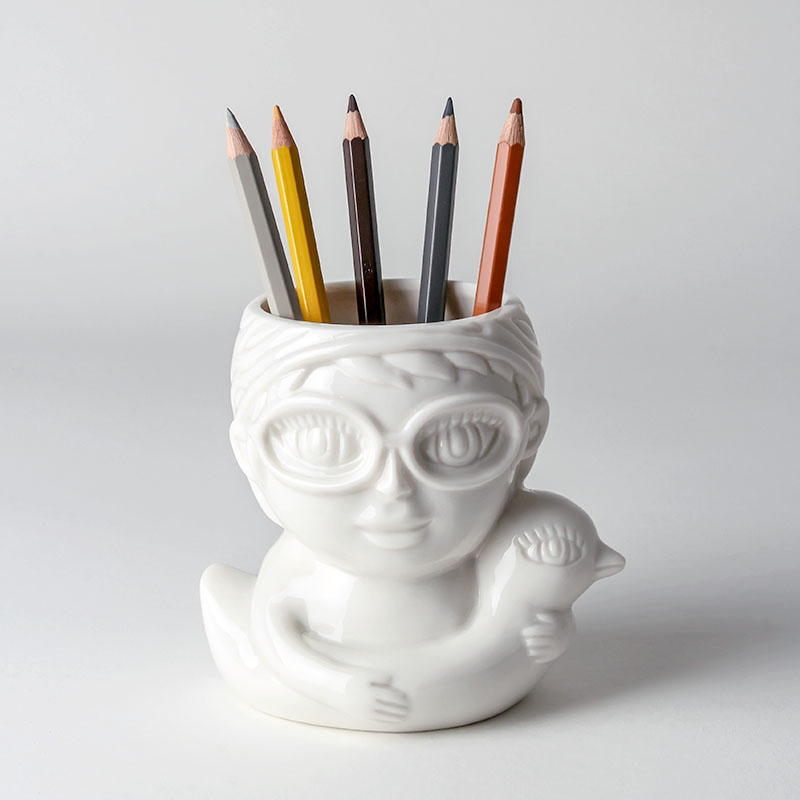Portalápiz con detalles en alto relieve y bolsillo posterior muy práctico y útil para colocar clips u objetos pequeños. Hecho a mano en porcelana brillante y horneado a altas temperaturas.