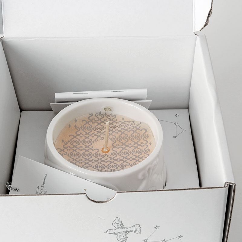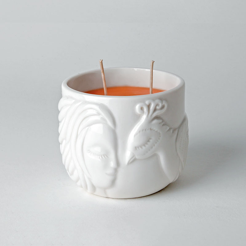Pequeño bowl portavela de porcelana inspirado en la sabiduría del ave fénix. Aromatizado con esencia de naranja, es ideal para acompañar y perfumar ambientes de baño.