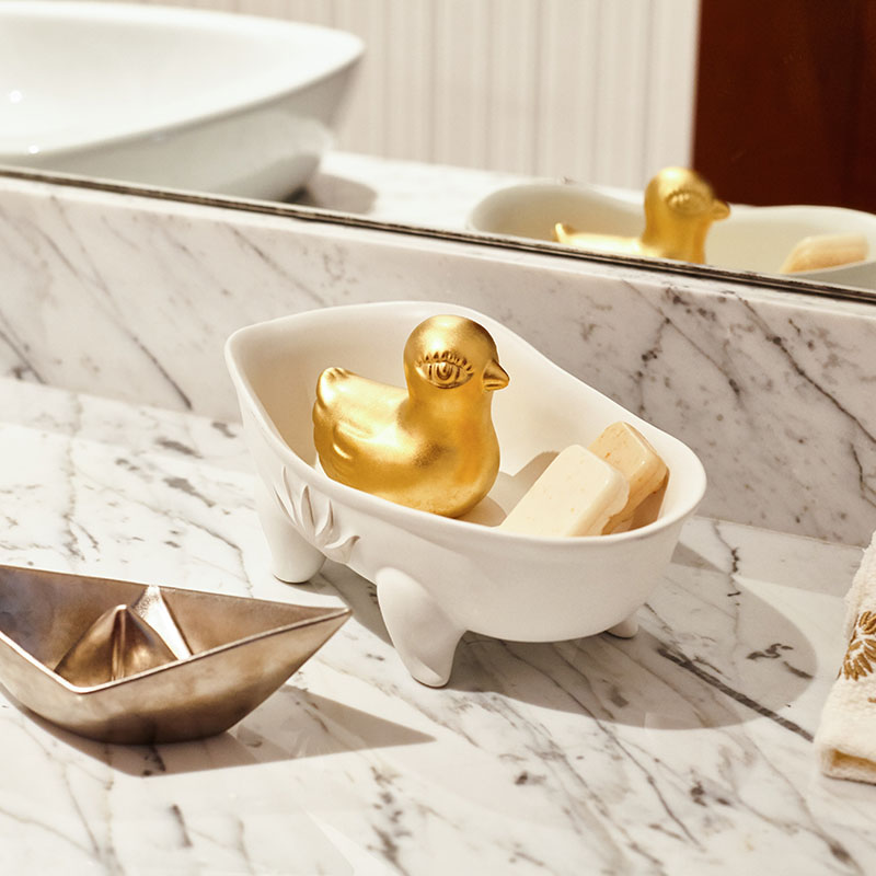 Set de cerámica de tres piezas, inspirado en una bañera antigua que podemos encontrar en algunas ilustraciones de Fito Espinosa. Está compuesto por un bowl (la bañera), un patito del tipo hule y un barco de origami. Ideal para decoración en baños de visita, cuartos de bebé o para ser usado como fuente de piqueos. Lo encuentras en su versión en tonos pastel o con aplicaciones en oro y plata.