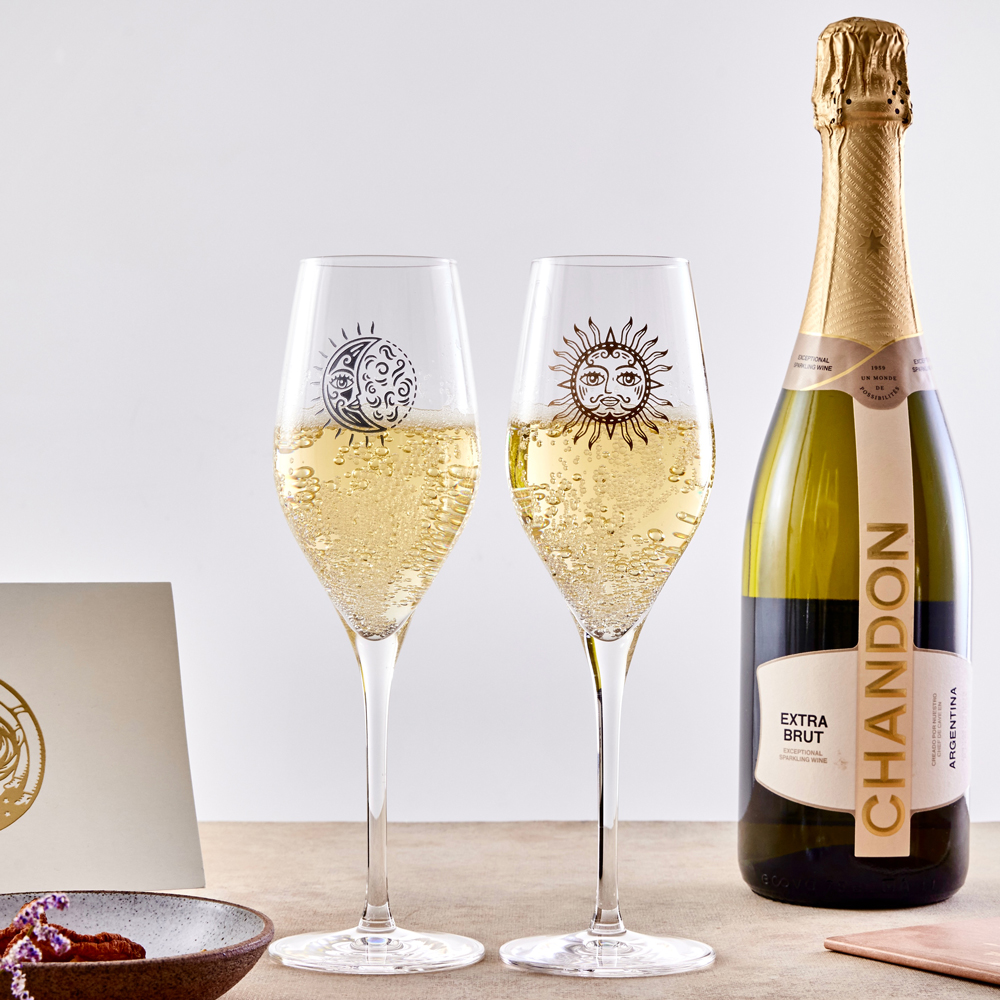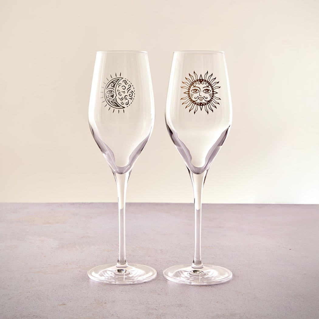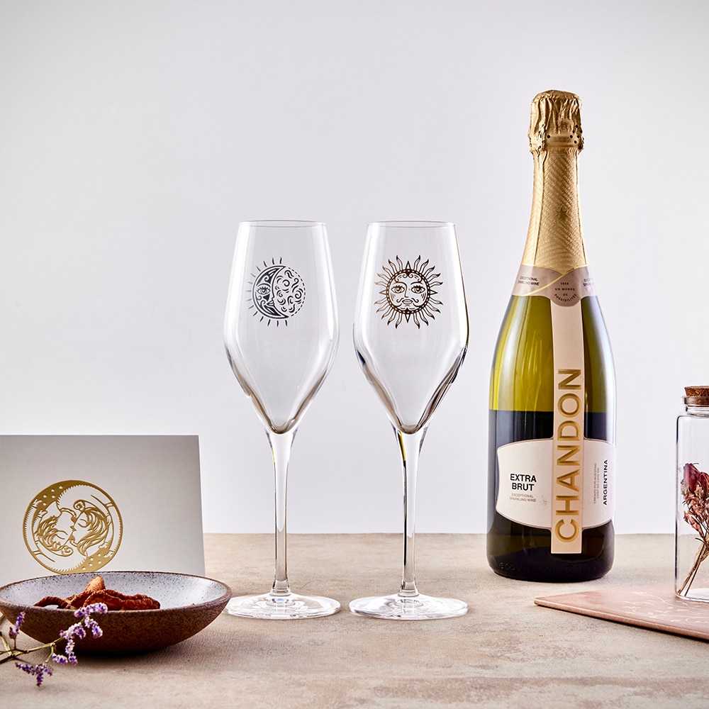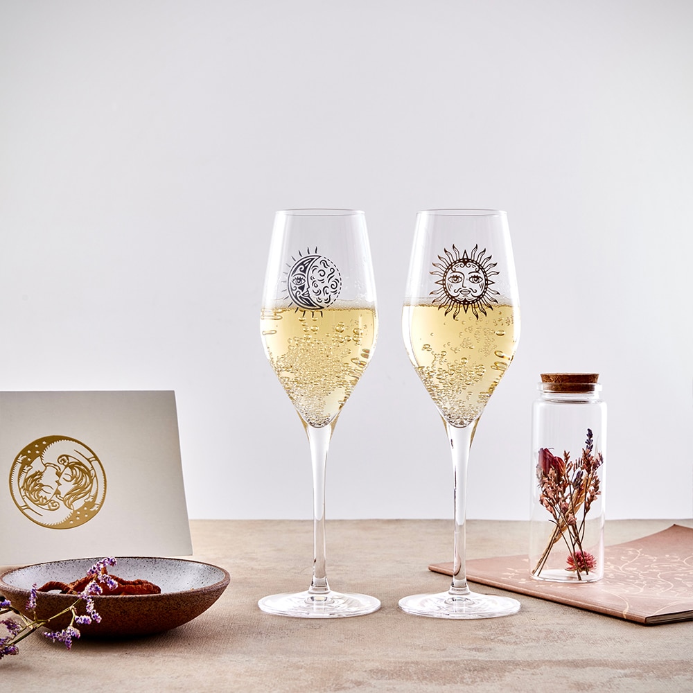 Set x 02 Copas de Cristal para Champagne o Espumante, ilustradas por Fito Espinosa en bajo relieve y fino acabado metálico. Presentación en caja empastada de colección con solapa, cintillo y cierre imantado.