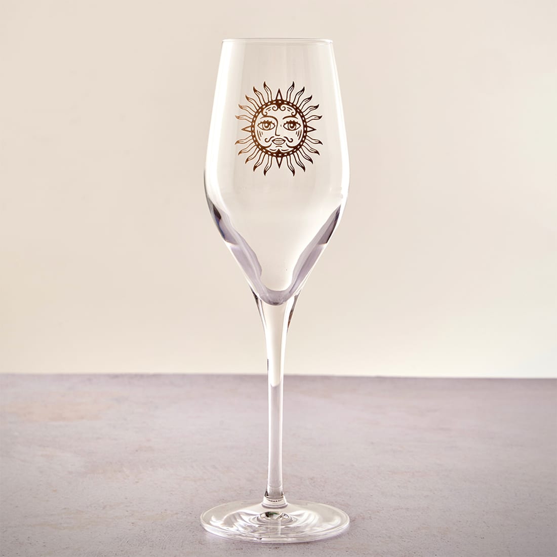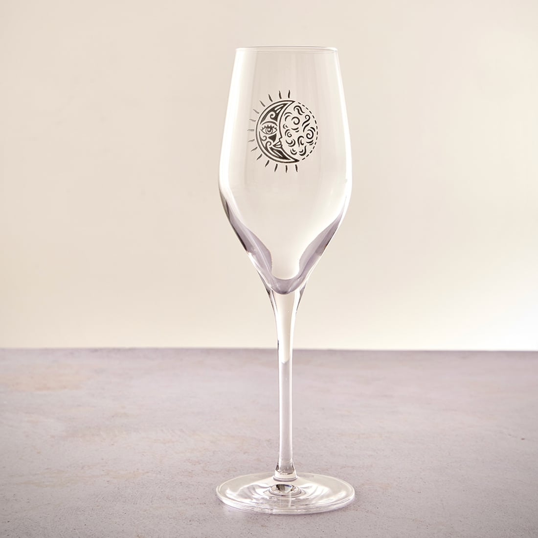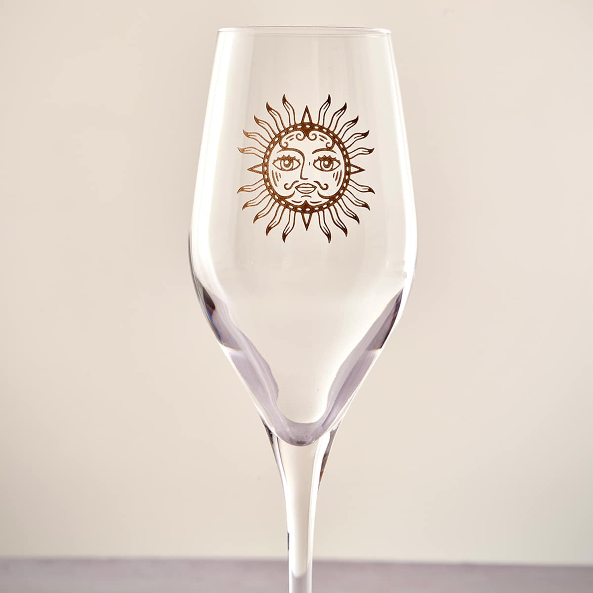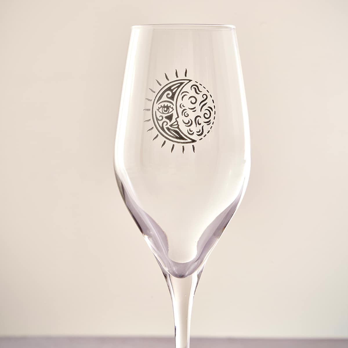 Set x 02 Copas de Cristal para Champagne o Espumante, ilustradas por Fito Espinosa en bajo relieve y fino acabado metálico. Presentación en caja empastada de colección con solapa, cintillo y cierre imantado.